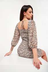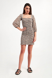 Sukienka marki Patrizia Pepe. Wielokorowa. Podkreślający sylwetkę fason slim fit, długość mini. Wykonana z elastycznej, marszczonej, przylegającej tkaniny. Kwadratowy dekolt. Zwiewne, delikatnie bufiaste rękawy 3/4 zakończone ściągaczami. Na plecach ozdobne troczki zakończone zawieszkami w kształcie owadziego logo. U dołu niewielka falbanka.