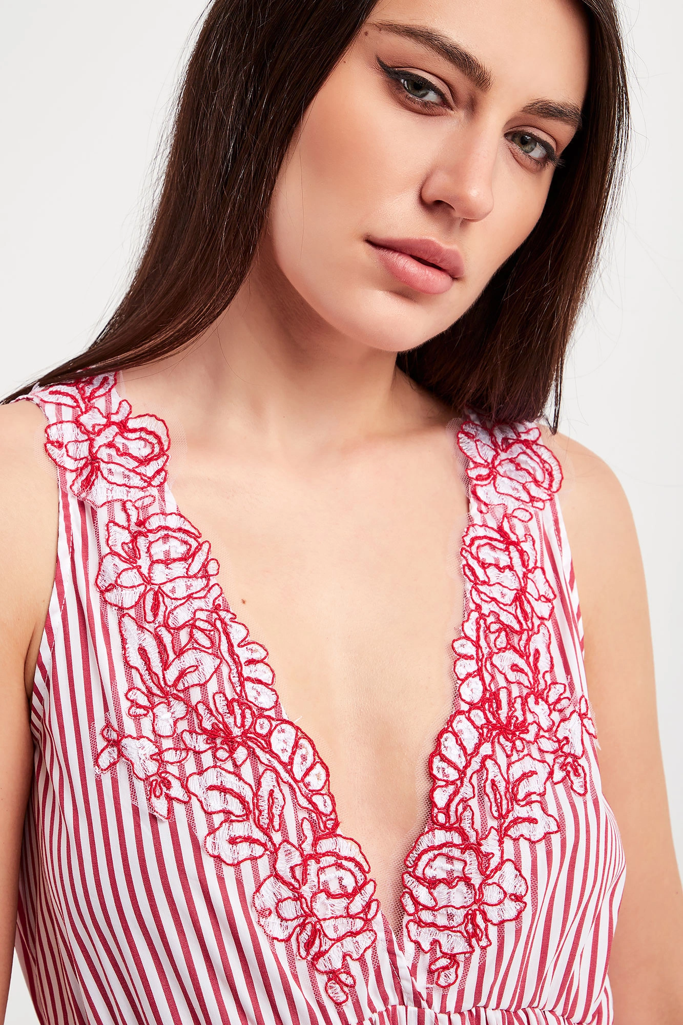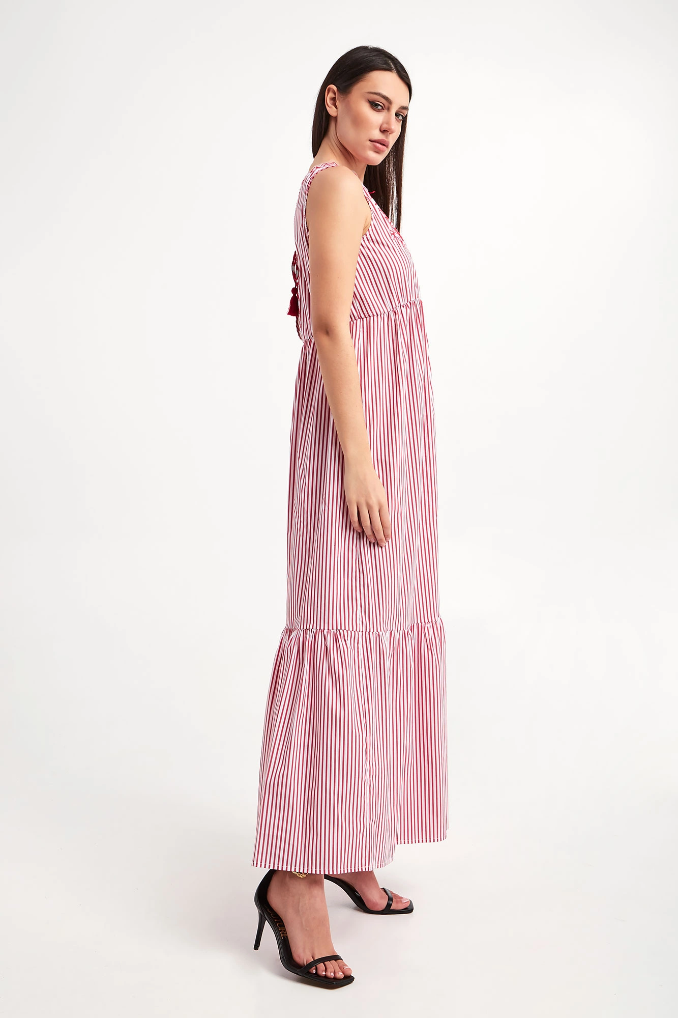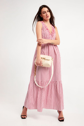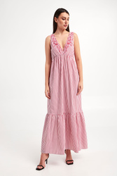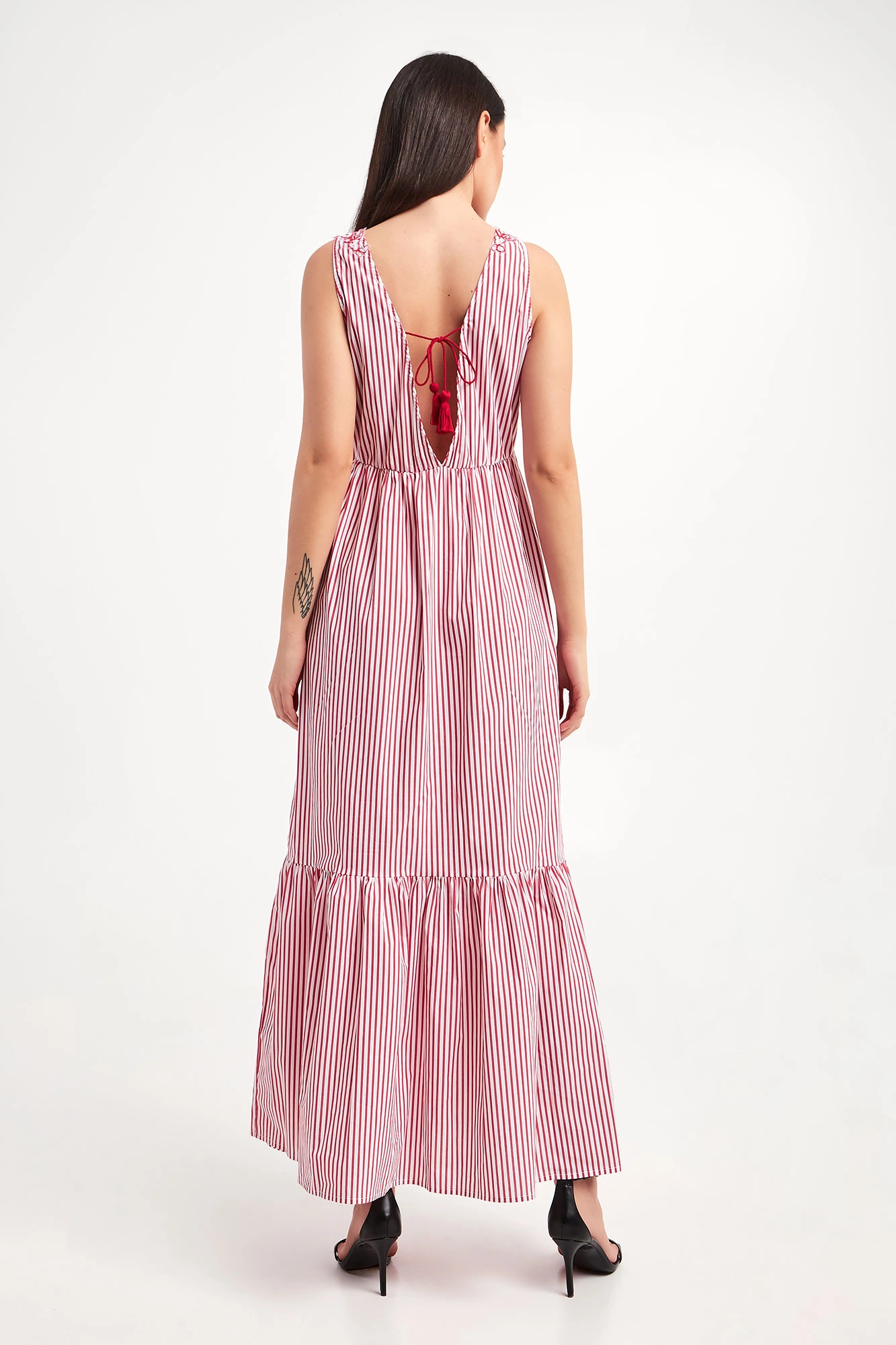 Sukienka marki Ermanno Firenze w biało-czerwone, pionowe paski. Fason regular fit, długość maxi. Bez rękawów. Przy dekolcie w kształcie litery V biało-czerwone, koronkowe wstawki z kwiatowym wzorem. Z tyłu wiązanie. W talii odcięcie. U dołu szeroka falbana. Wykonana z przyjemnej w dotyku, bawełnianej tkaniny.