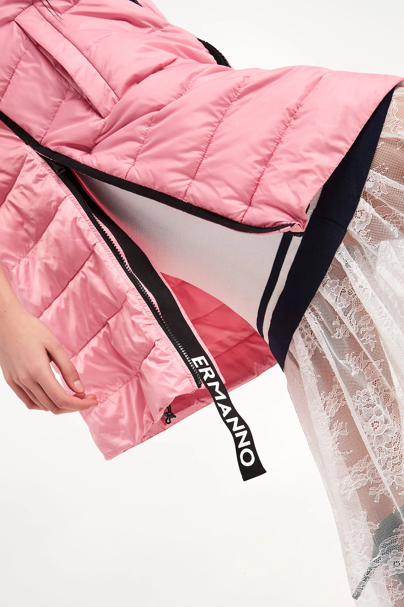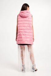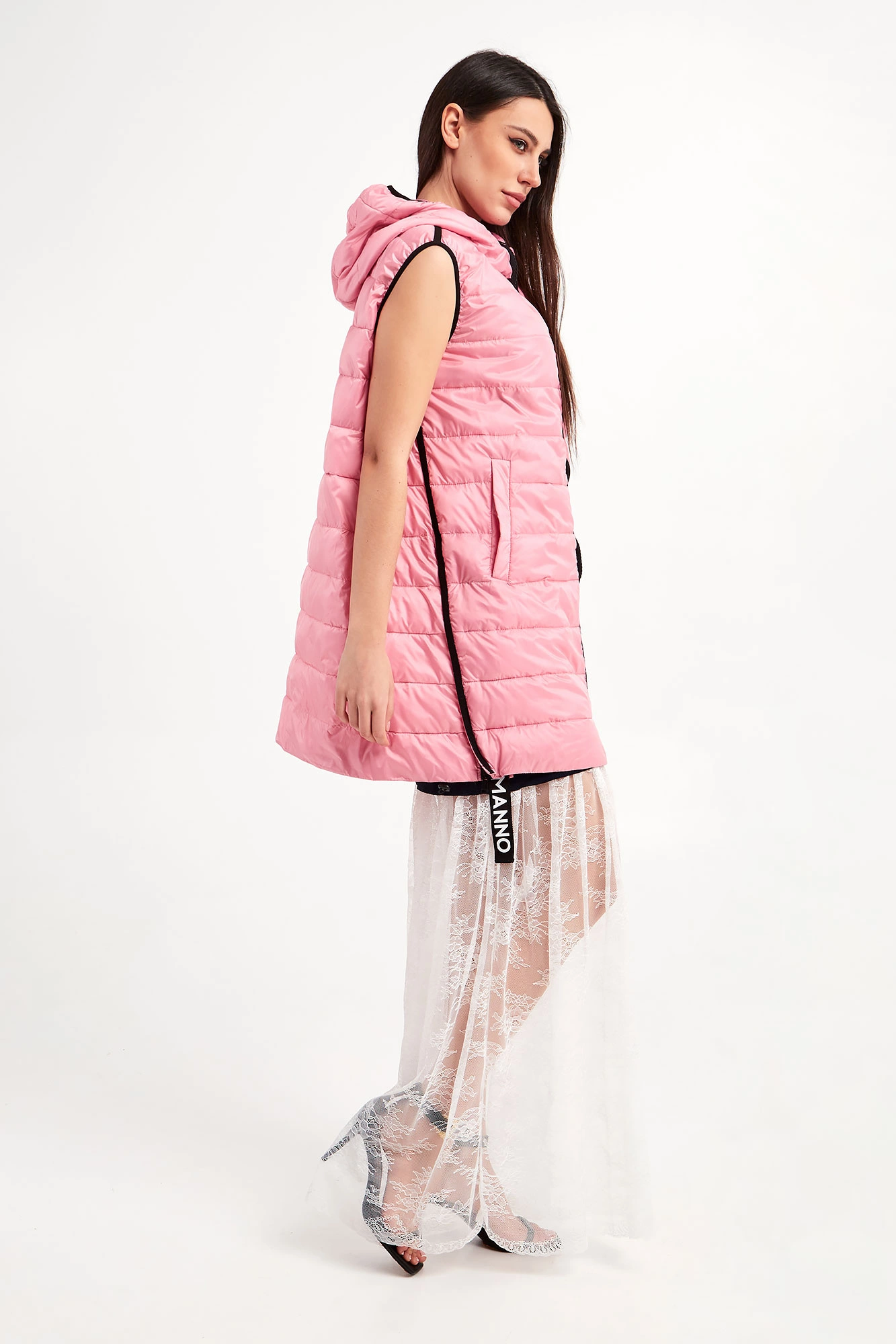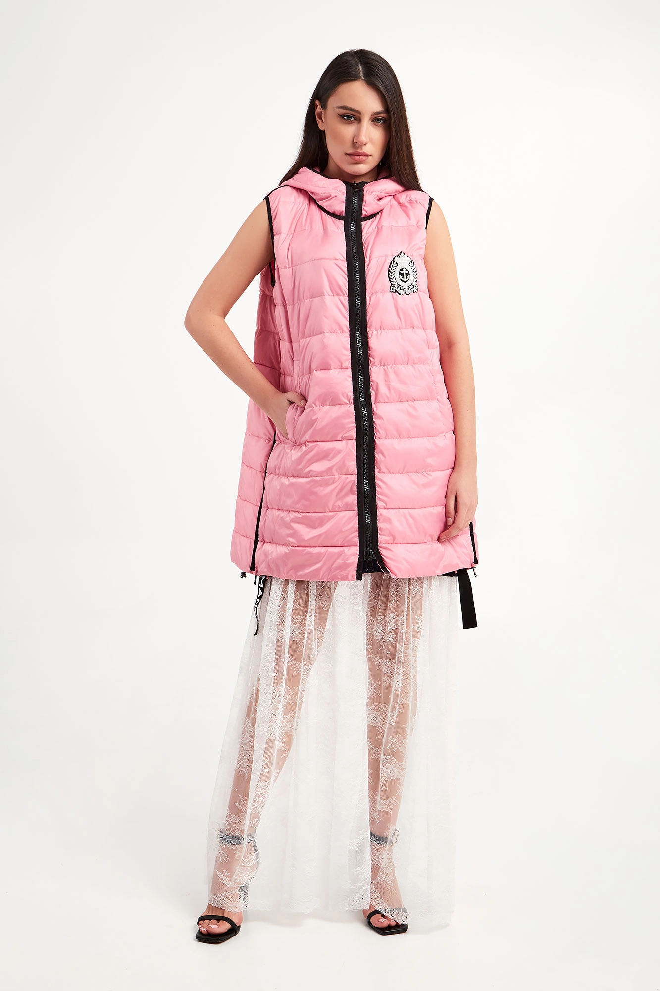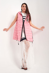 Pikowana kamizelka z kapturem marki Ermanno Firenze w jasnym, różowym kolorze. Fason regular fit. Z boku biało-czarna, haftowana naszywka z nazwą marki oraz logo. Zapinana za pomocą czarnego, dwustronnego zamka. Dwie boczne, wpuszczane kieszenie. Po bokach rozpinana. U dołu ściągacz z regulacją. Boki wykończone czarną lamówką. Bardzo lekka.