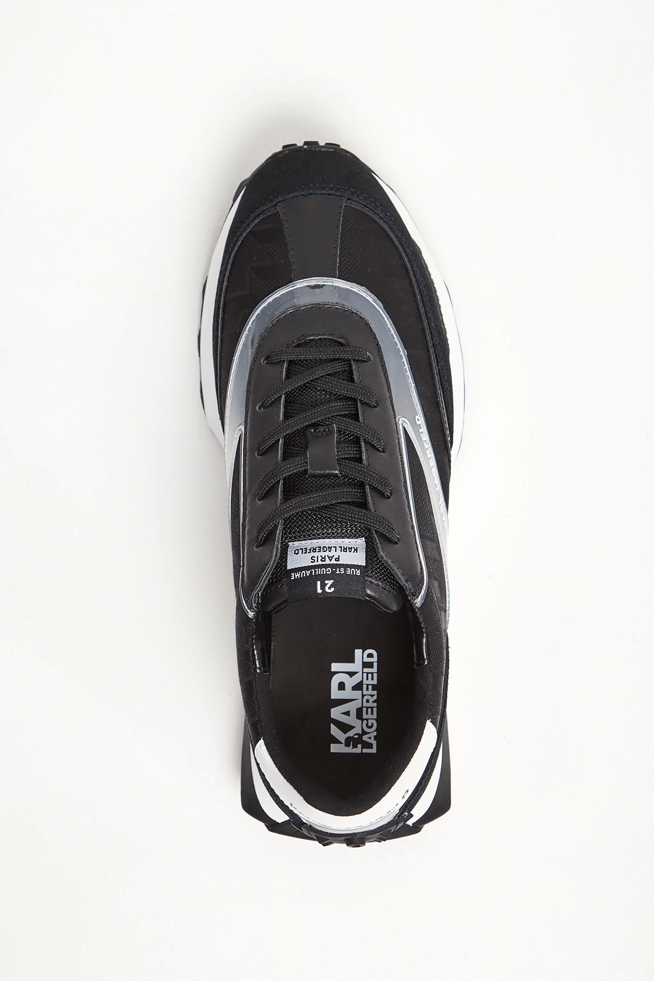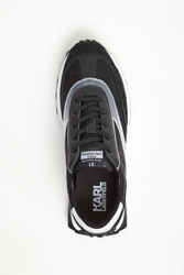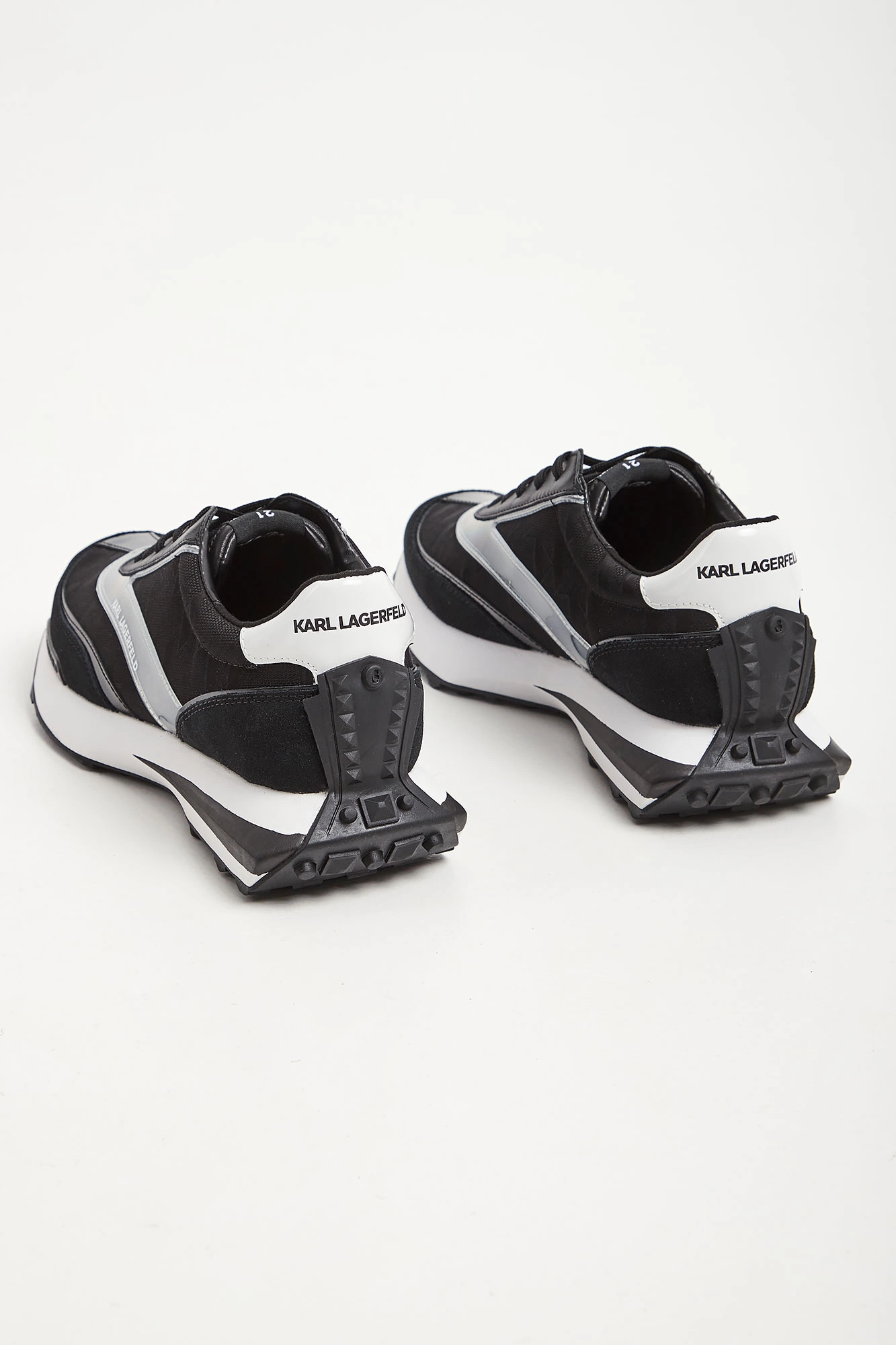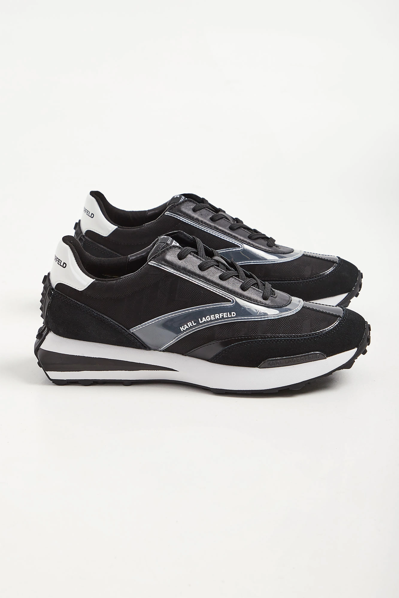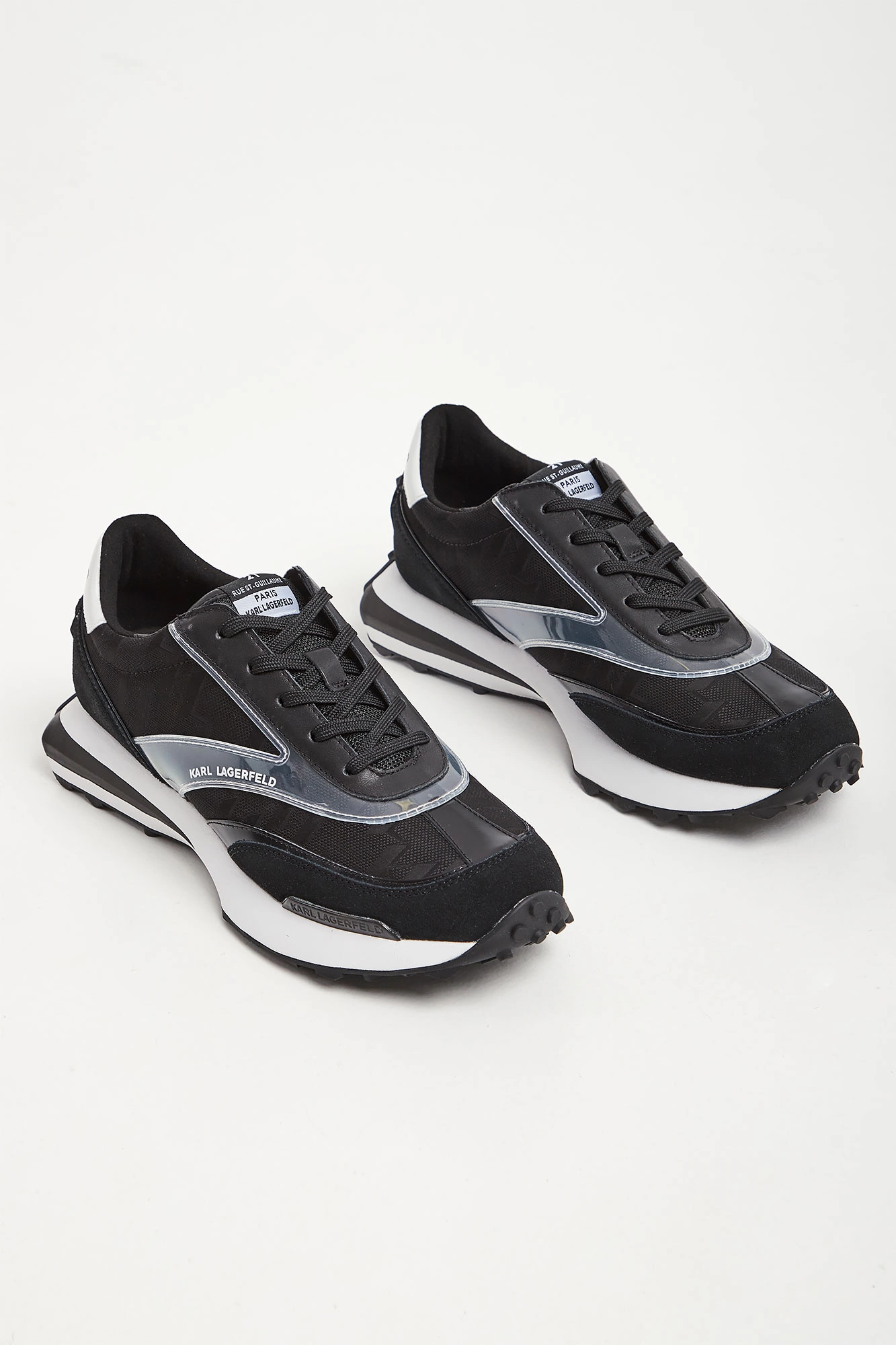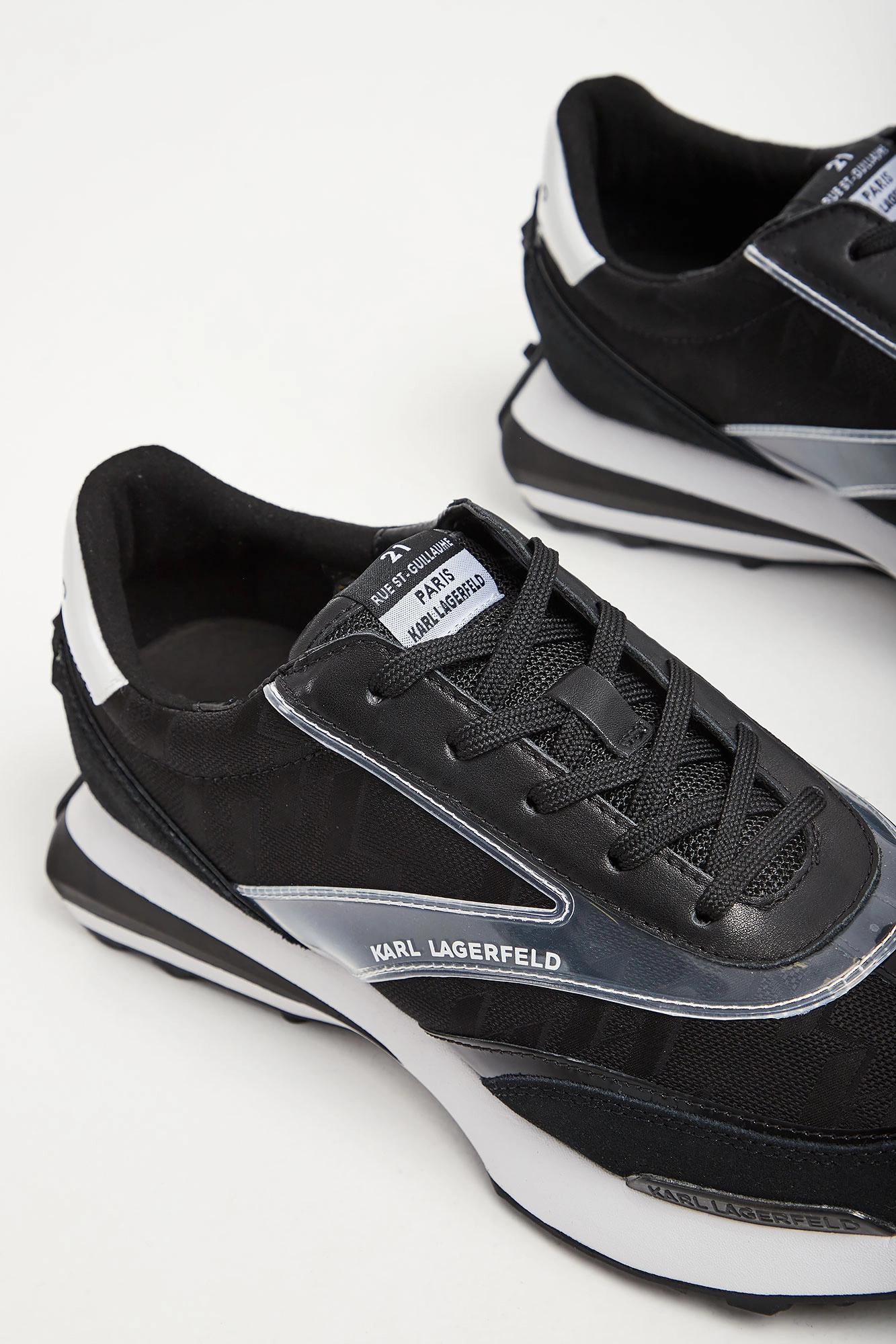 Sneakersy marki Karl Lagerfeld w czarnym kolorze. Zaokrąglony nosek. Wiązane za pomocą sznurówek. Na całości wstawki zamszowej skóry, nadruku z nazwą . Po bokach sygnowana, transparentna wstawka gumy. Z tyłu biała, połyskująca skóra z tłoczona nazwą marki. Wyściółka sygnowana.