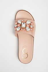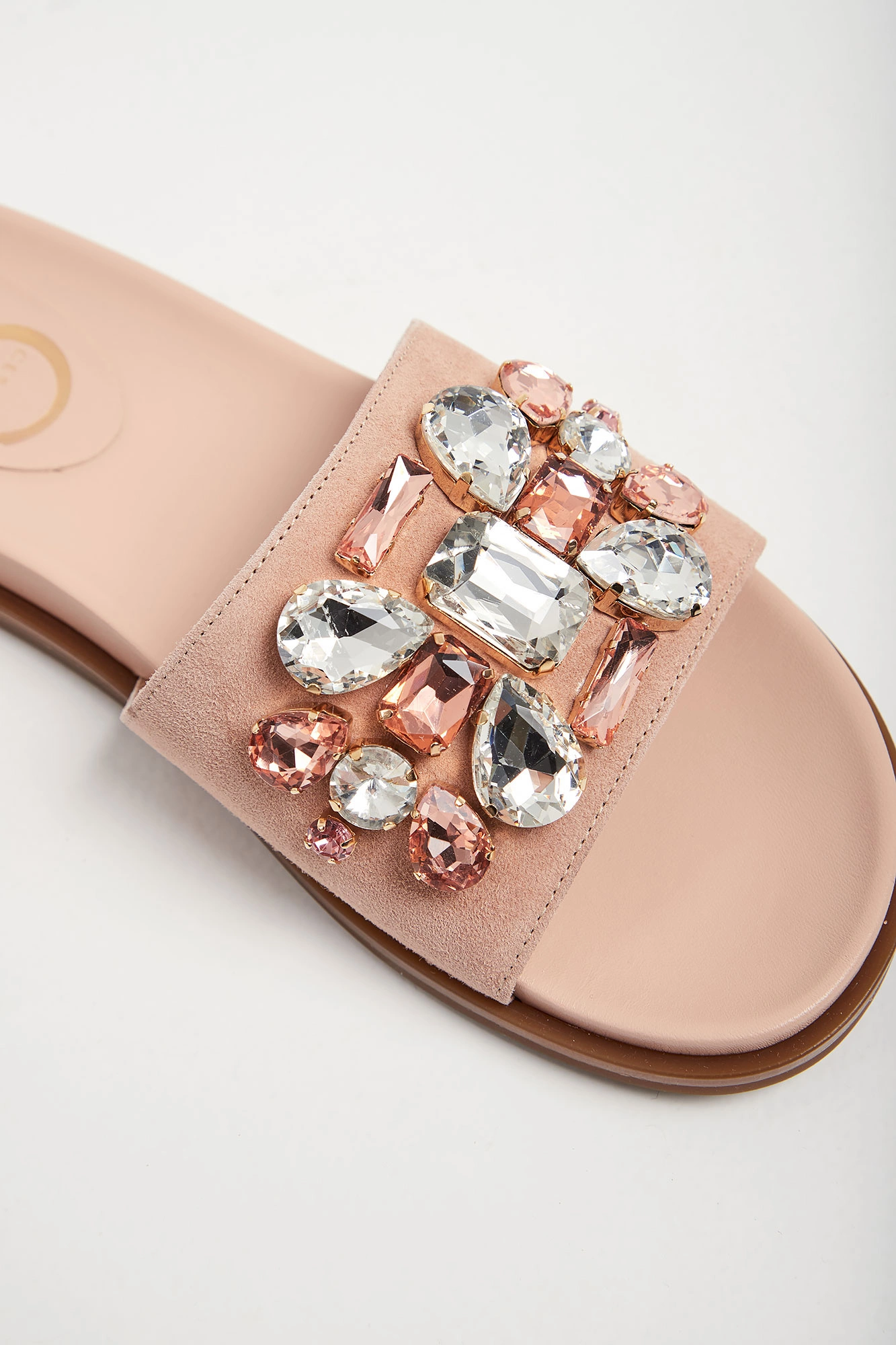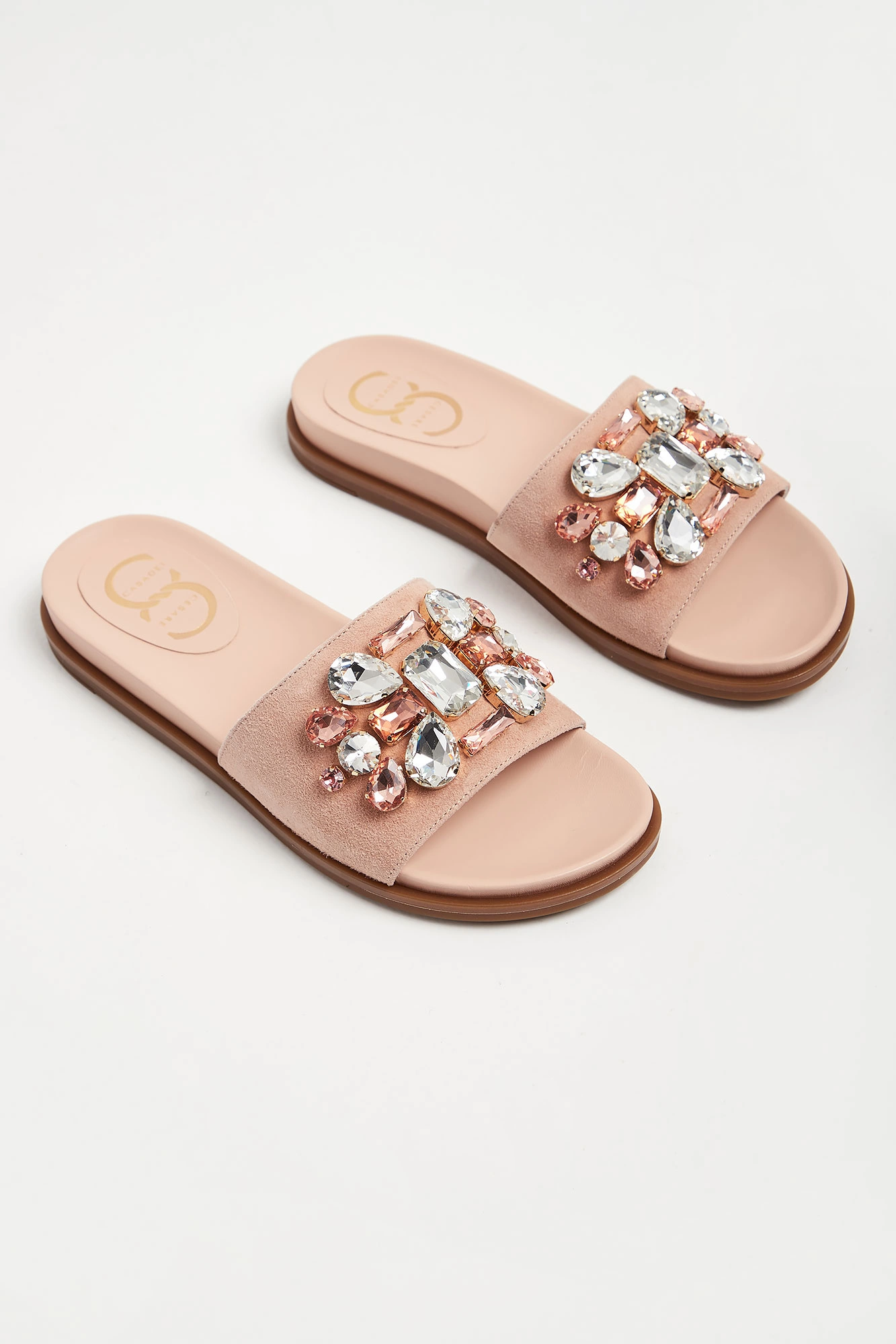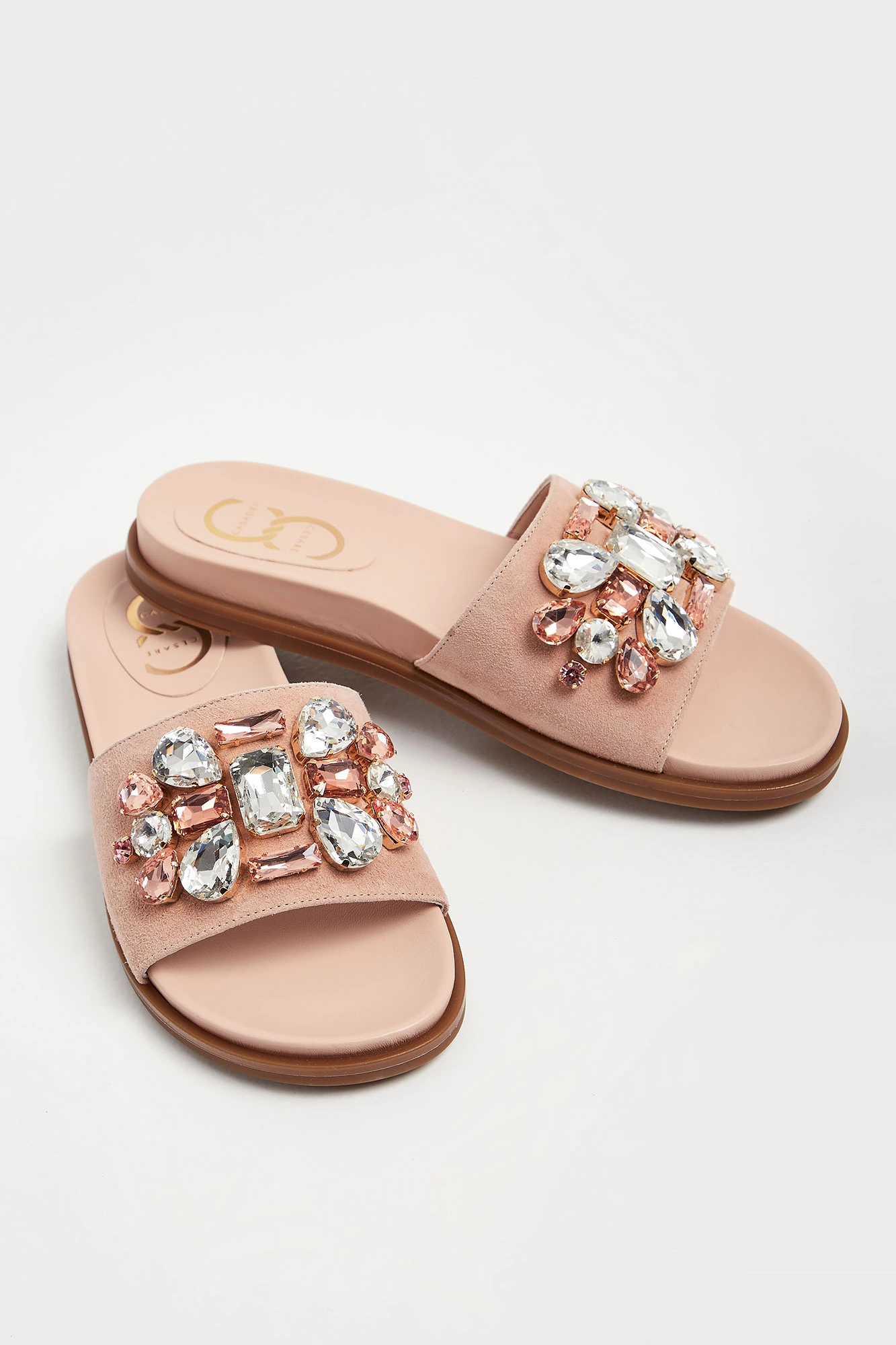 Klapki marki Cesare Casadei w kolorze pudrowego różu. Z przodu szeroki pasek wykończony, ozdobnymi, kolorowymi kamieniami. Podeszwa profilowana. Wyściółka sygnowana. Wykonane z naturalnej skóry.
