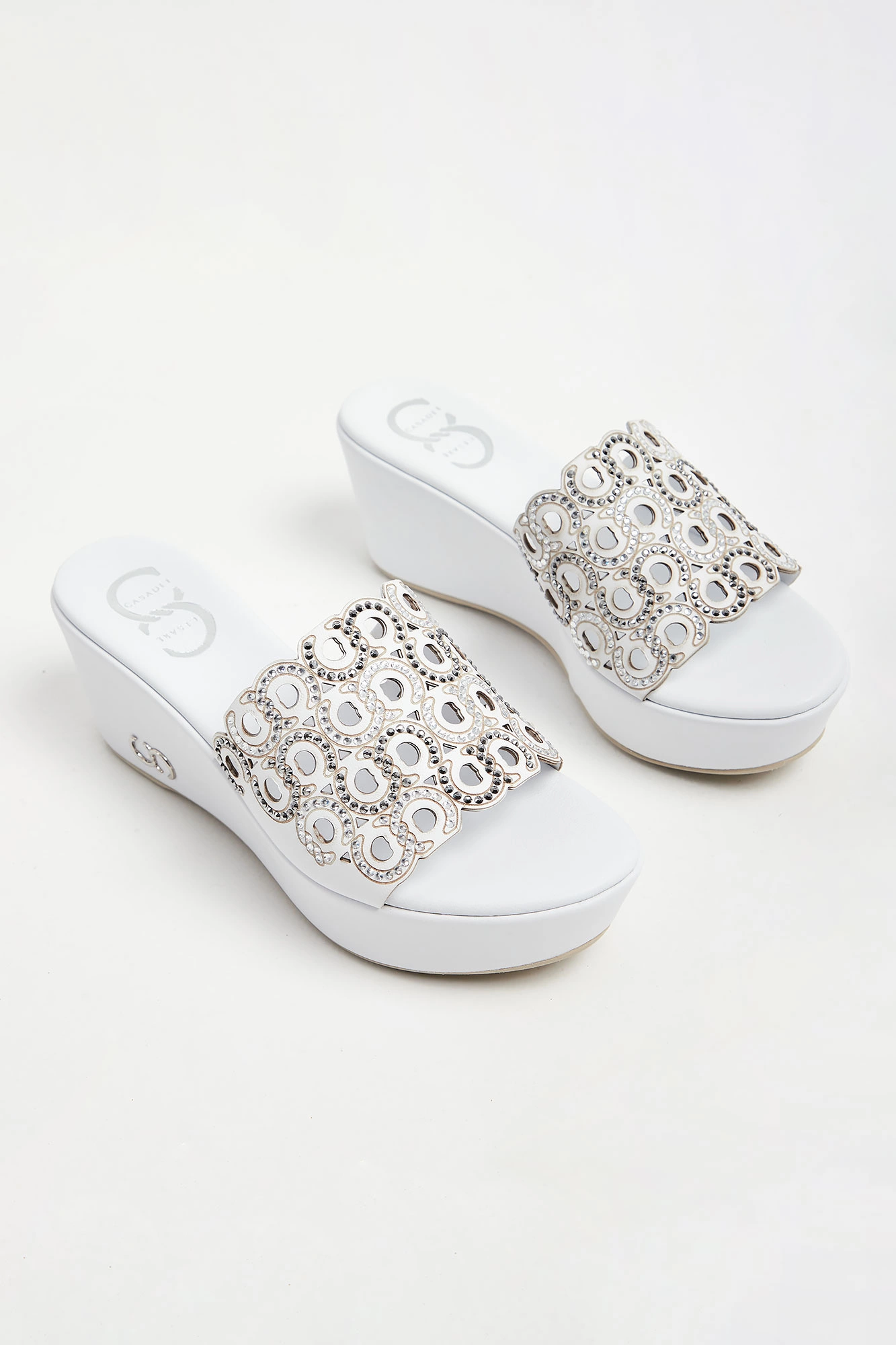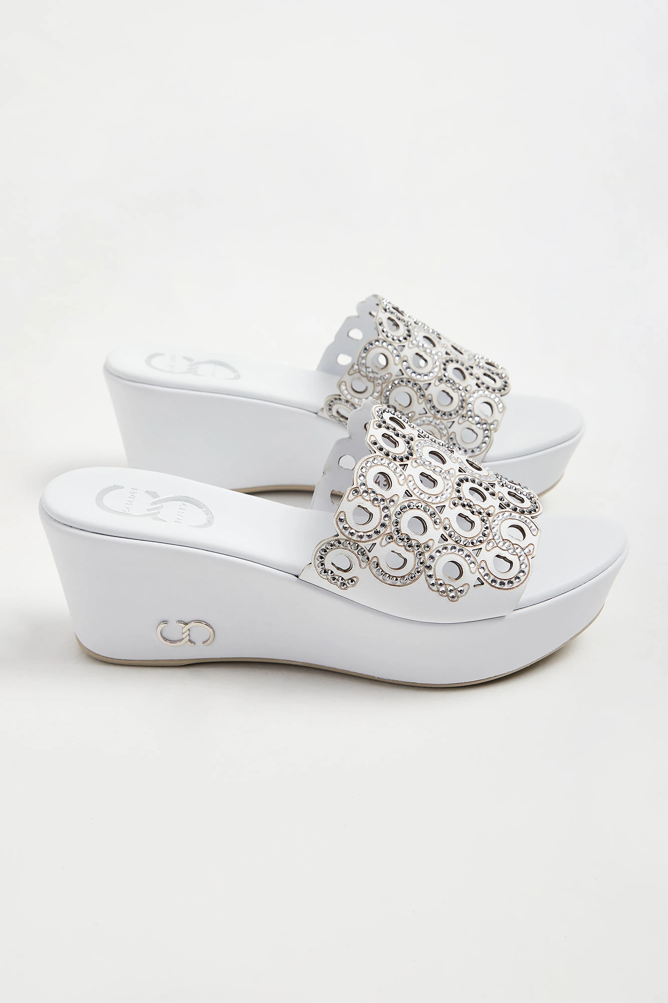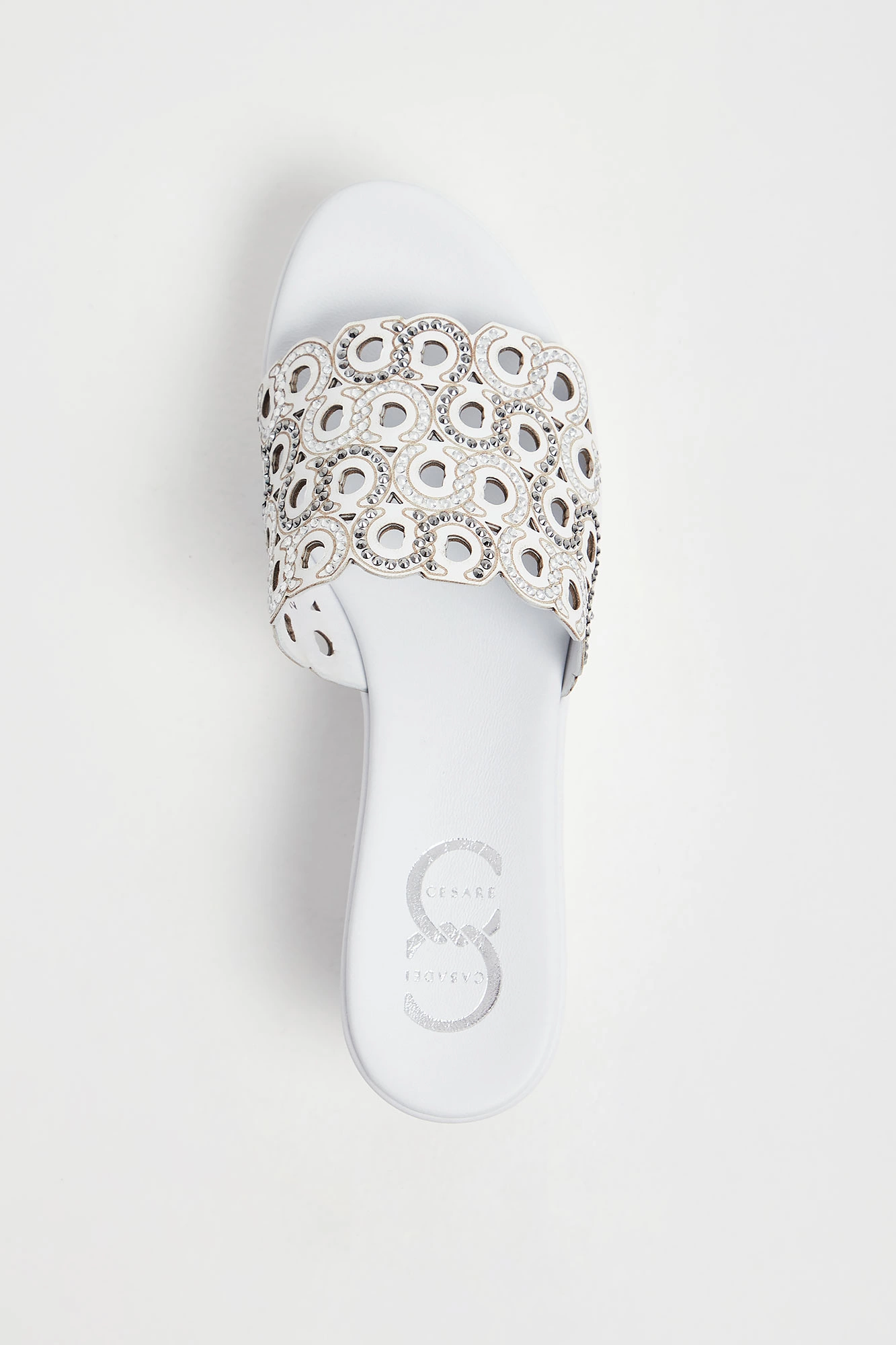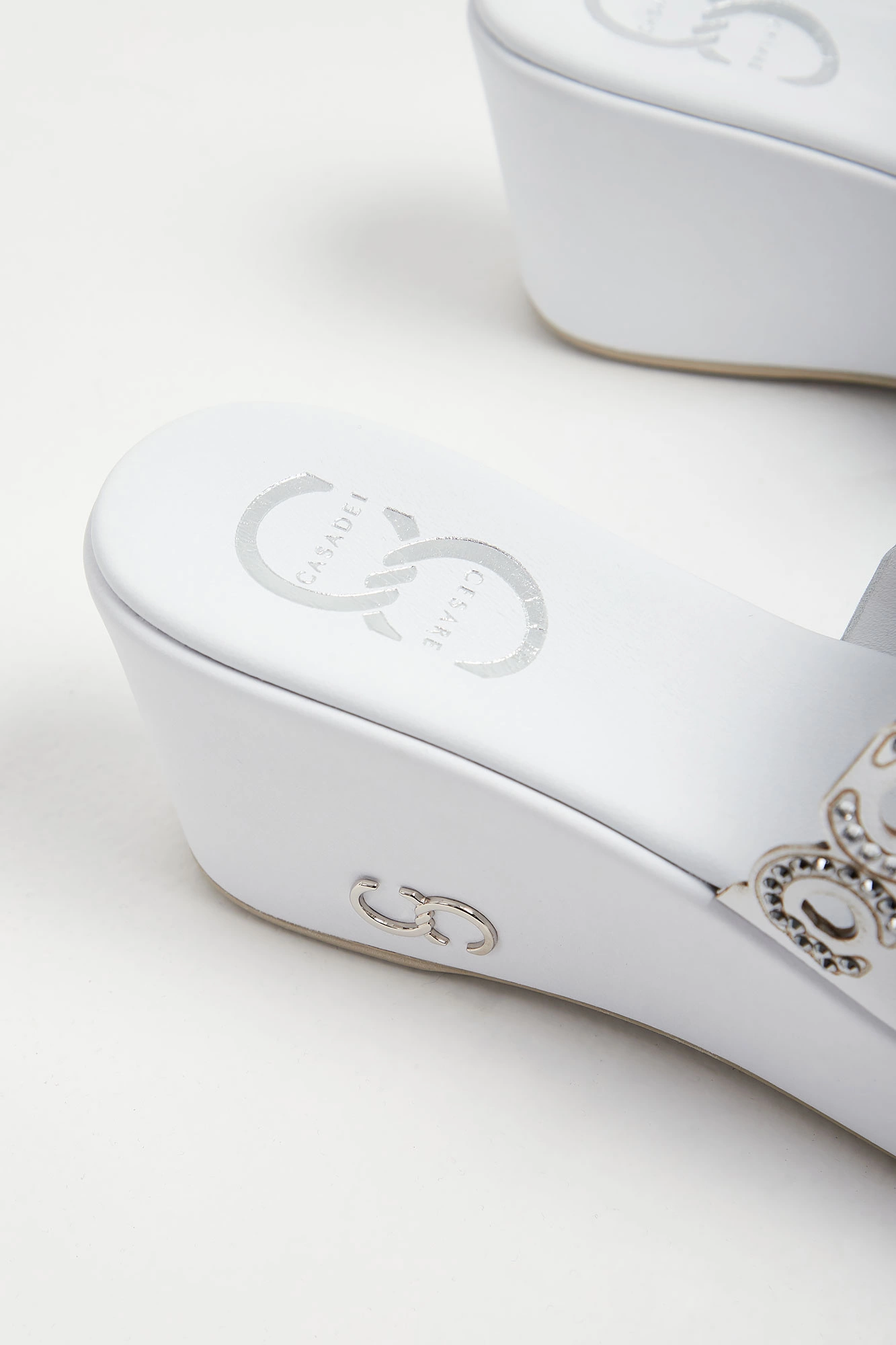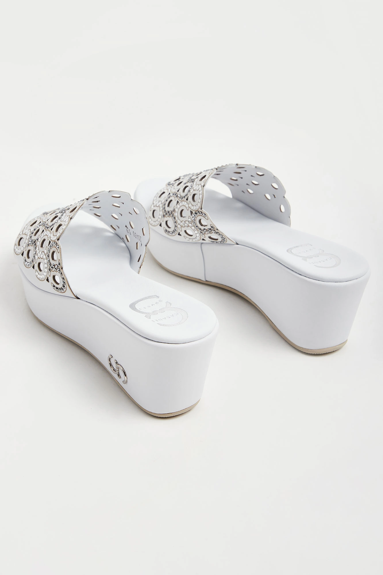 Klapki na koturnie marki Cesare Casadei w białym kolorze. Z przodu szeroki, ażurowy pasek ozdobiony połyskującymi kryształkami. Podeszwa tłoczona i sygnowana. Z boku metalowa zawieszka w kształcie logo. Wykonane ze skóry naturalnej.