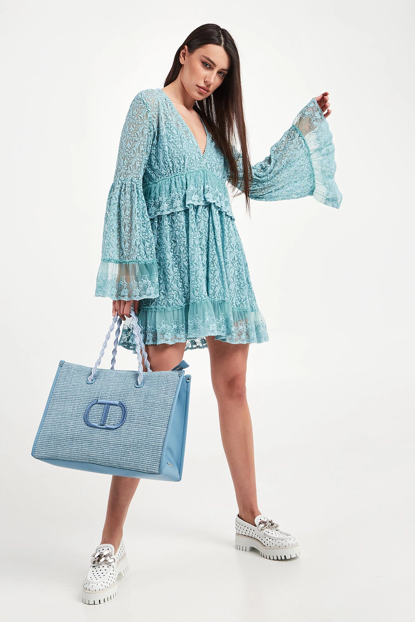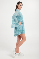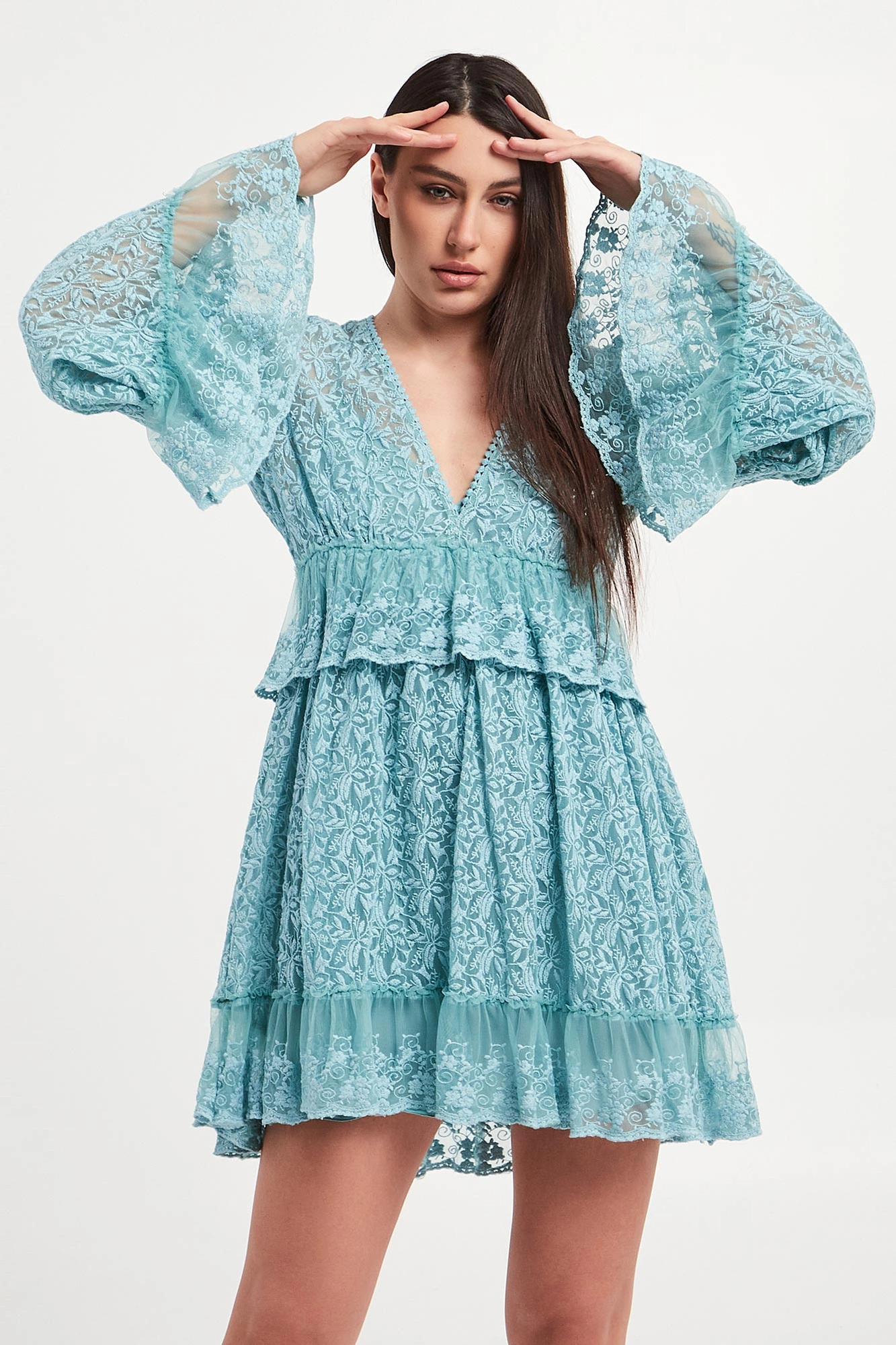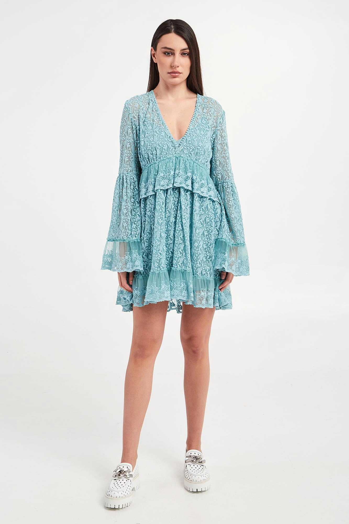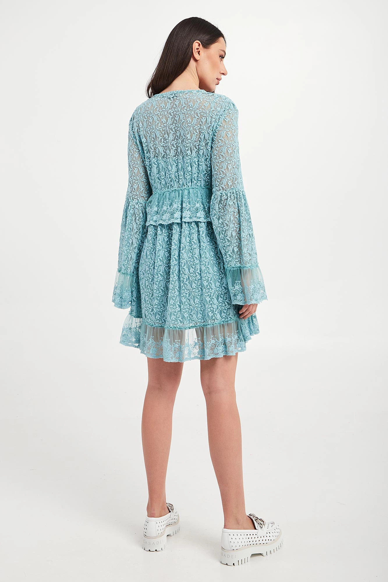 Sukienka marki Pinko w turkusowym kolorze. Fason regular fit, długość mini. Wykonana z ażurowej, koronkowej tkaniny. Dekolt typu v-neck ozdobiony haftem. W pasie i u dołu falbany. Rękawy długie, rozszerzające się ku dołowi. W zestawie podszewka. Wykonana z mieszanki bawełny oraz wiskozy.
