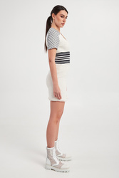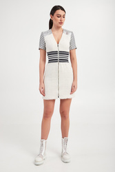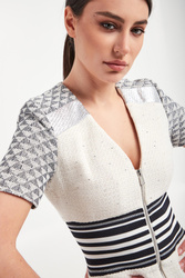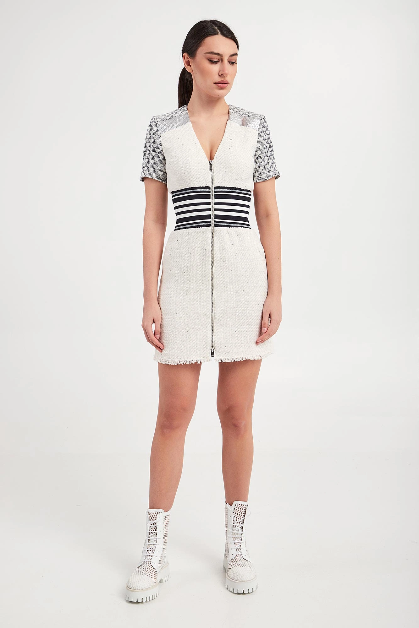 Sukienka marki Pinko w kremowo-szarym kolorze. Fason typu slim, o długości mini. Na całości połyskująca, metalizowana nić. W talii elastyczny ściągacz w biało-granatowym kolorze. Dekolt typu v-neck. U góry ozdobny lampas w srebrnym kolorze. Zapinana za pomocą dwukierunkowego zamka błyskawicznego w srebrnym kolorze. Dół wykończony ozdobnym strzępieniem. Wykonana z bawełnianej tkaniny o splocie bouclé.
