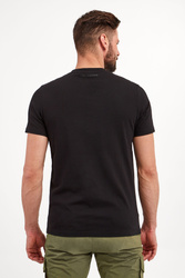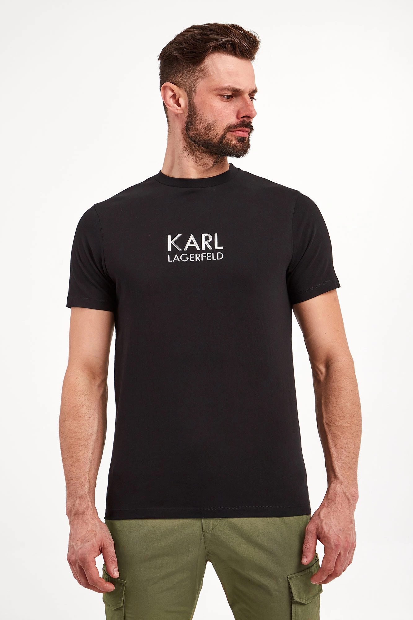 T-shirt marki Karl Lagerfeld w czarnym kolorze. Model z linii "Karl Cares", która wspiera zrównoważoną modę. Fason slim fit. Na froncie srebrny, gumowany nadruk z nazwą marki. Dekolt typu o-neck zakończony ściągaczem. Krótkie rękawy i dół wykończone lamówką. Na linii karku nadruk z logo. Wykonany z czystej bawełny.