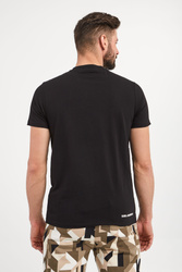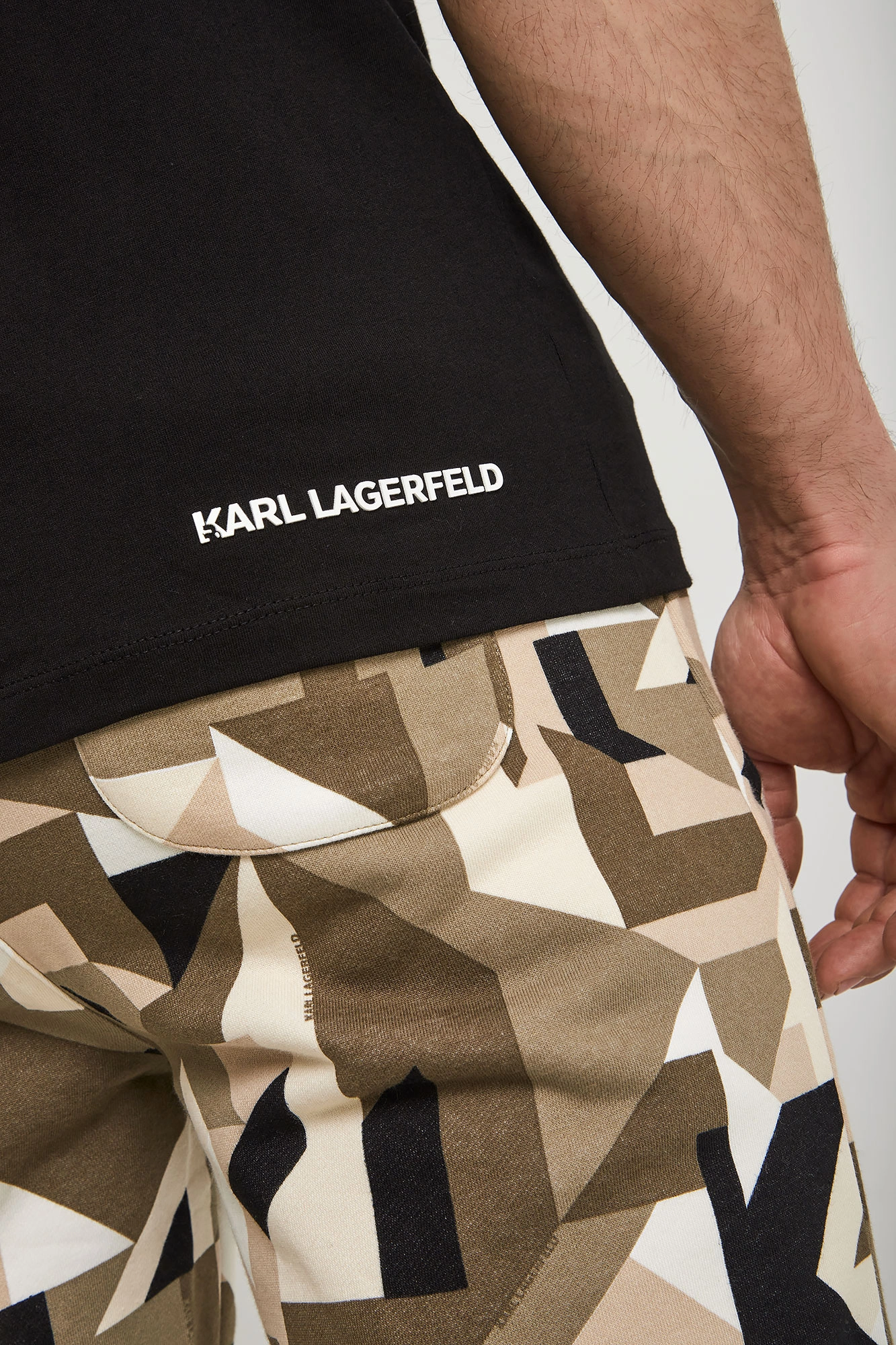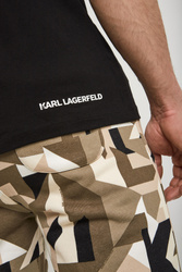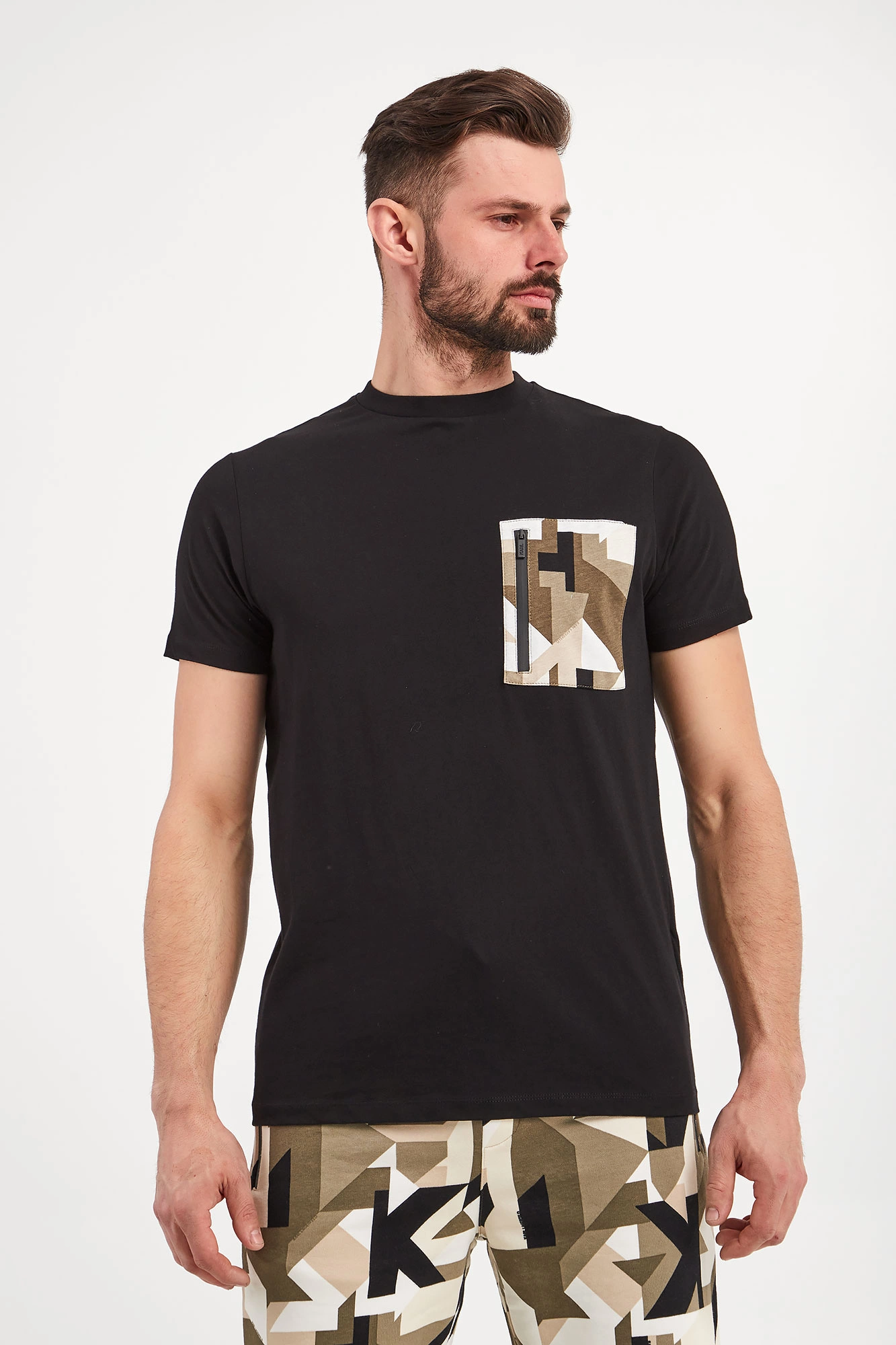 T-shirt marki Karl Lagerfeld w czarnym kolorze. Model z linii "Karl Cares", która wspiera zrównoważoną modę. Fason slim fit. z boku zapinana kieszeń w zielono-biało-czarny wzór. Dekolt typu o-neck zakończony ściągaczem. Krótkie rękawy i dół wykończone lamówką. Wykonany ze stuprocentowej bawełny.