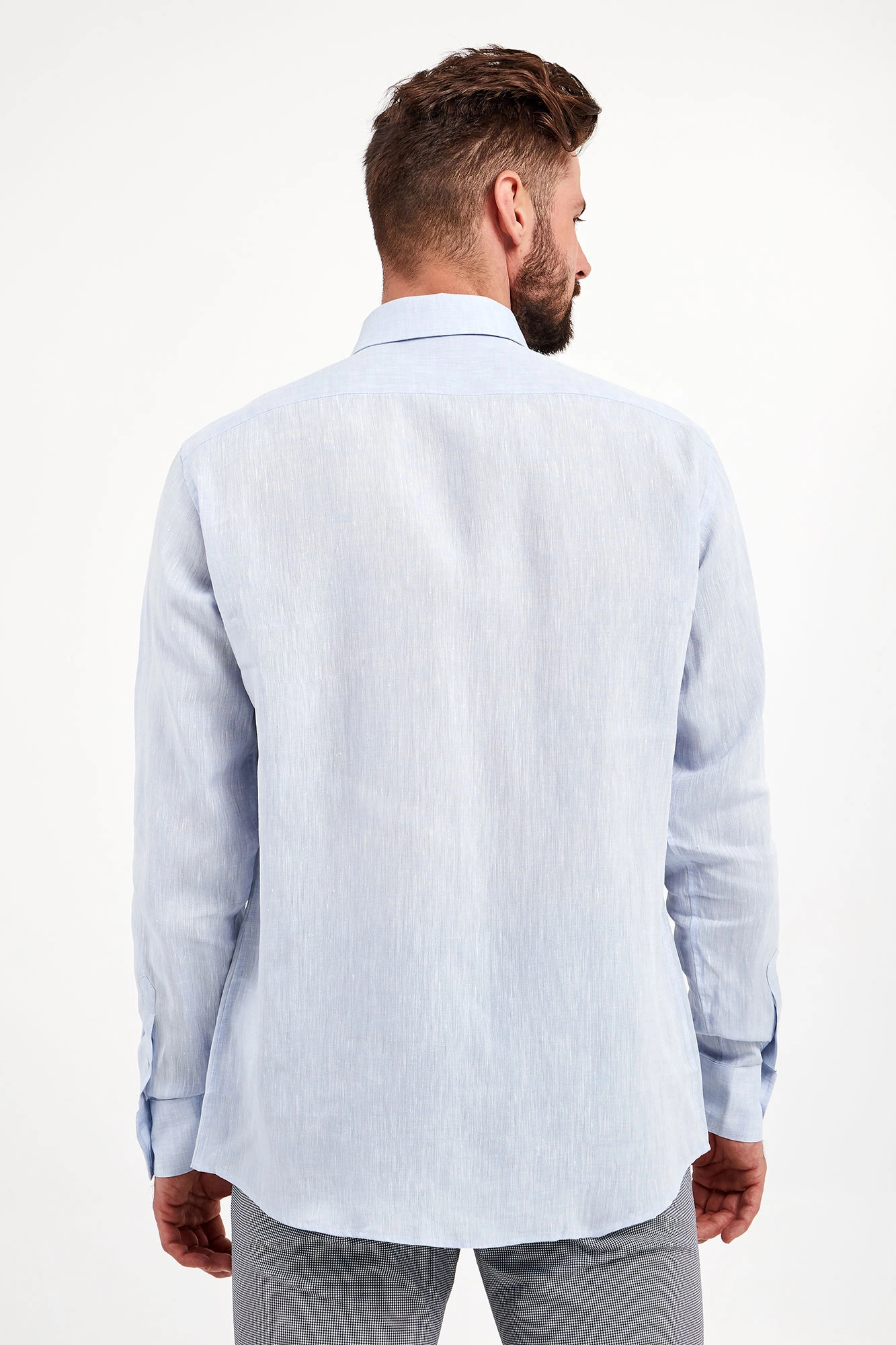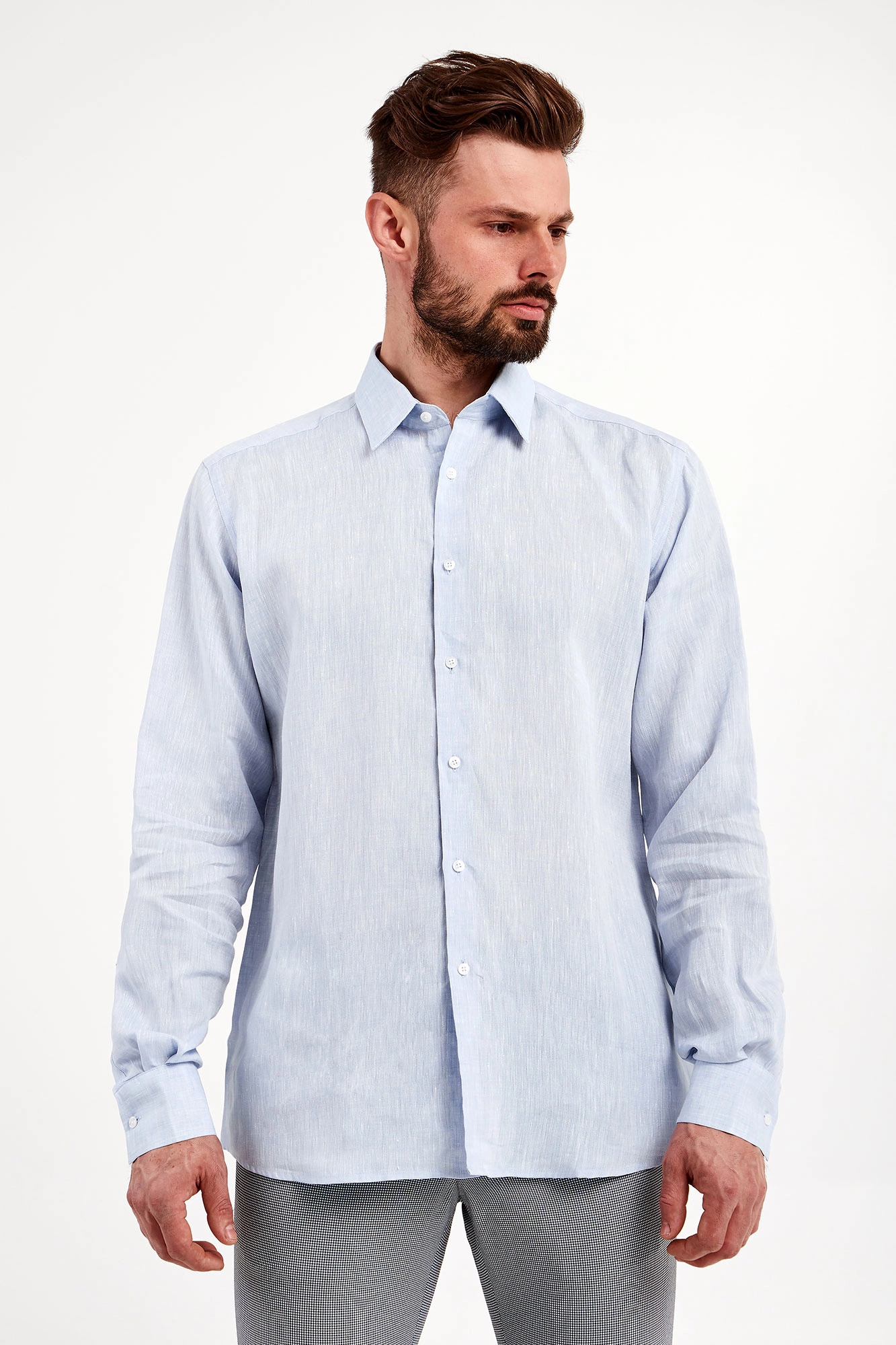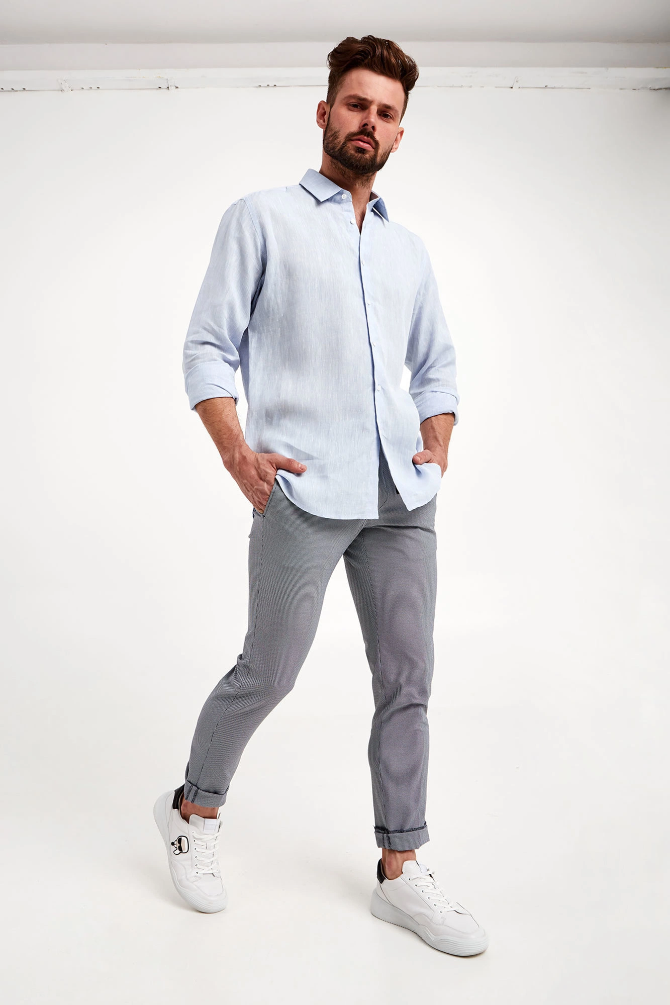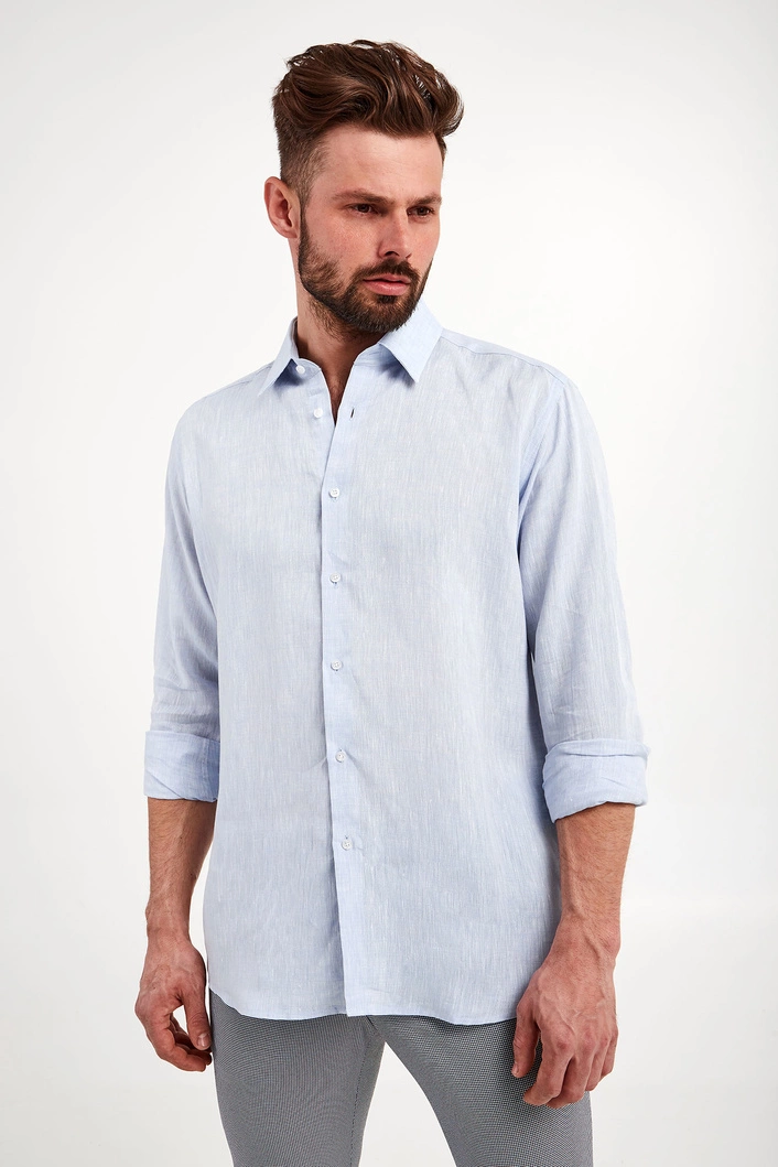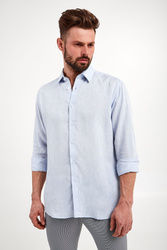 Koszula lniana marki Karl Lagerfeld w błękitnym kolorze. Fason regular fit. Zapinana za pomocą opalizujących, sygnowanych guzików. klasyczny kołnierzyk typu kent. Proste rękawy zakończone zapinanymi mankietami.
