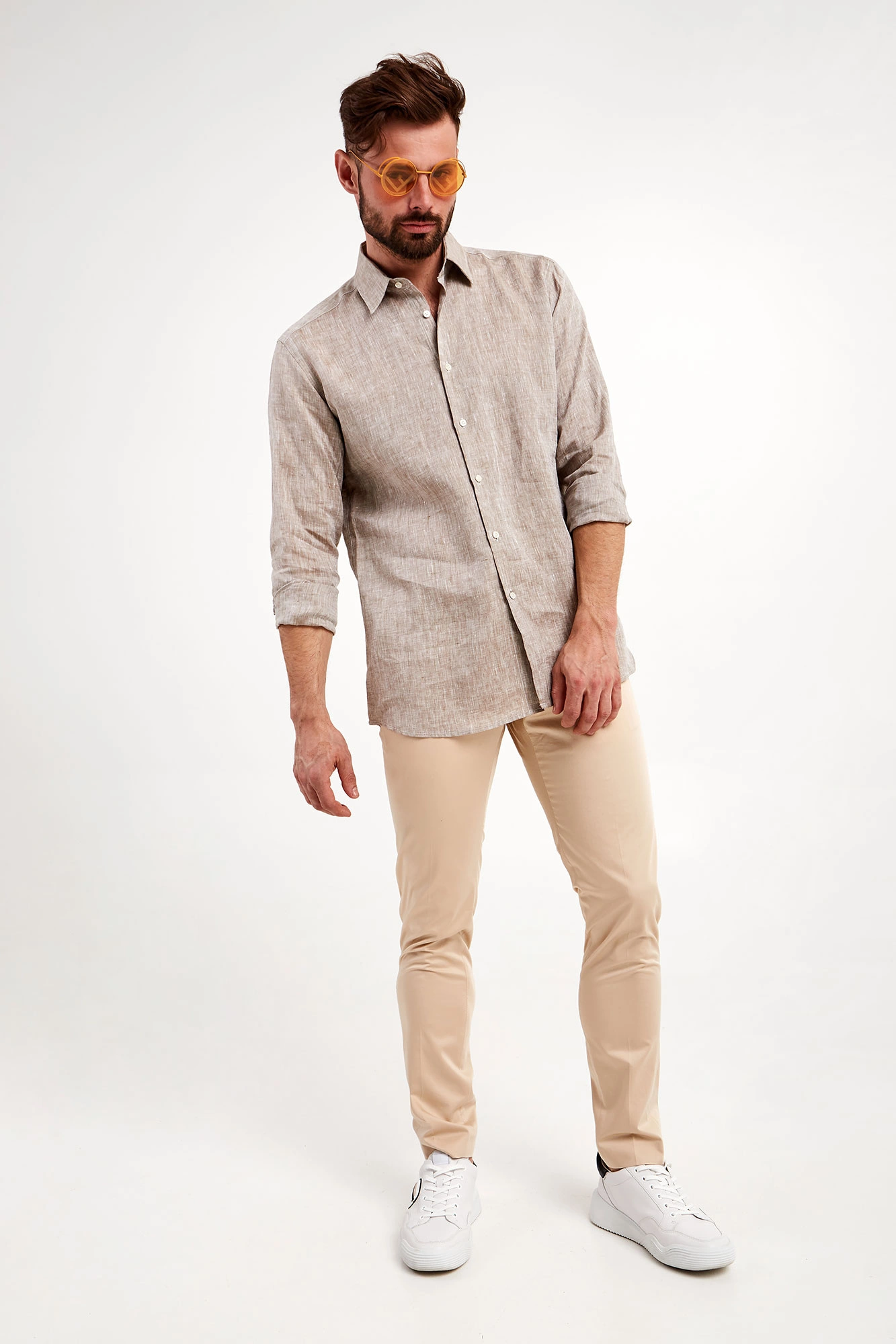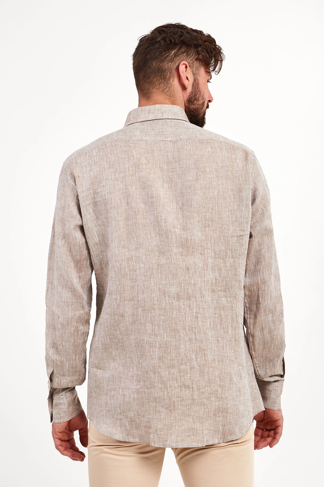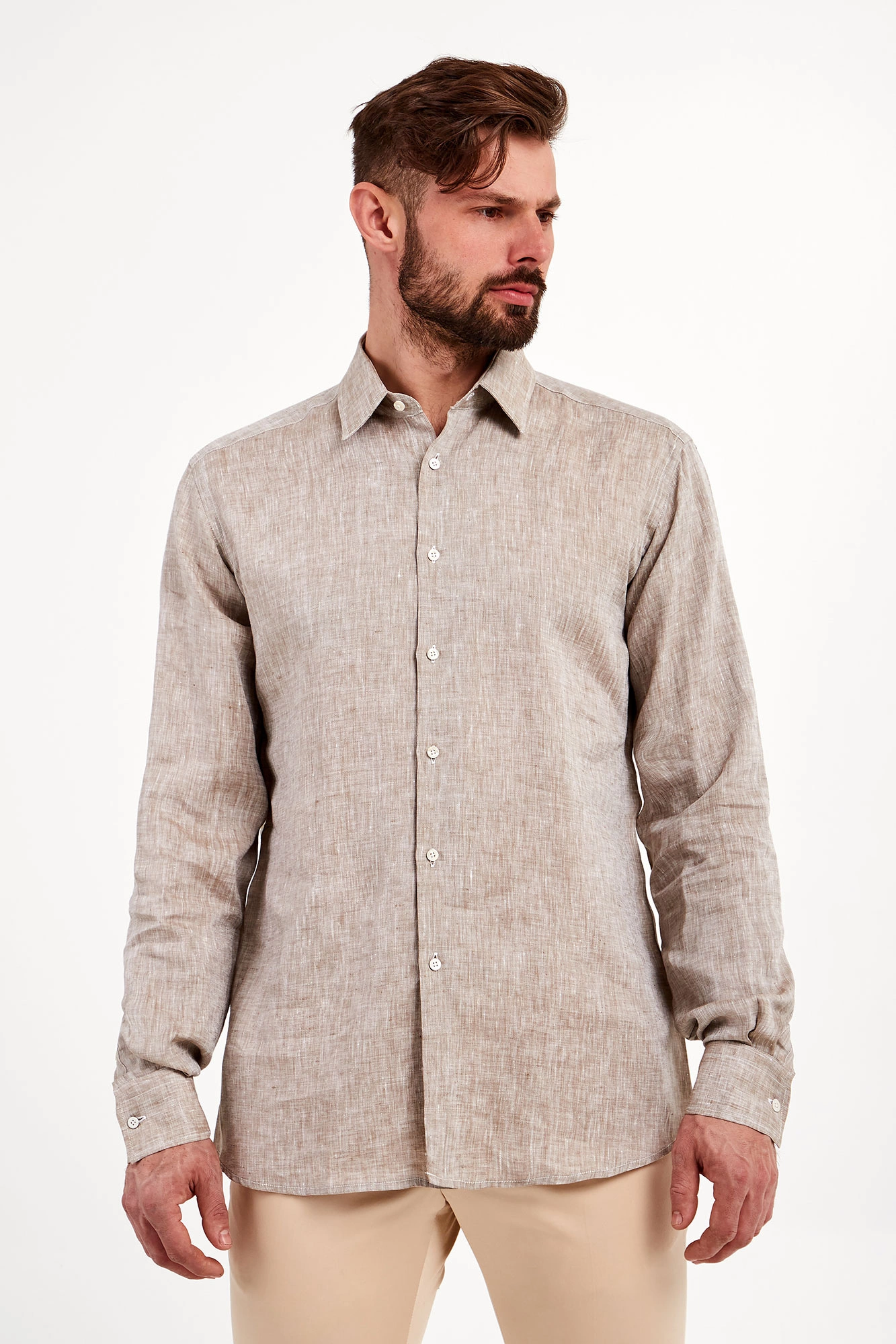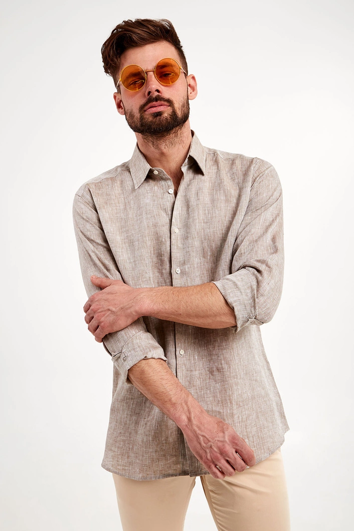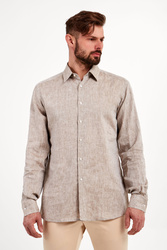 Koszula marki Karl Lagerfeld w kolorze chłodnego, beżowego melanżu. Fason regular fit. Zapinana za pomocą opalizujących, sygnowanych guzików. klasyczny kołnierzyk typu kent. Proste rękawy zakończone zapinanymi mankietami. Wykonana z czystego lnu.