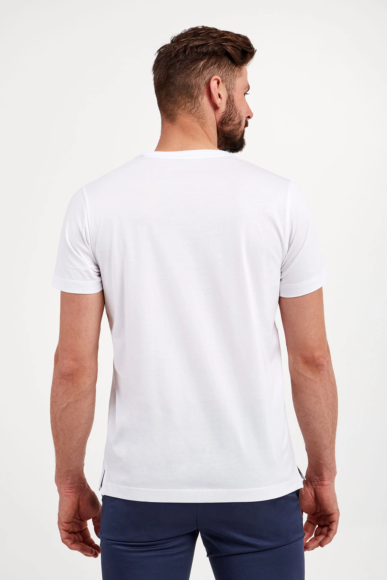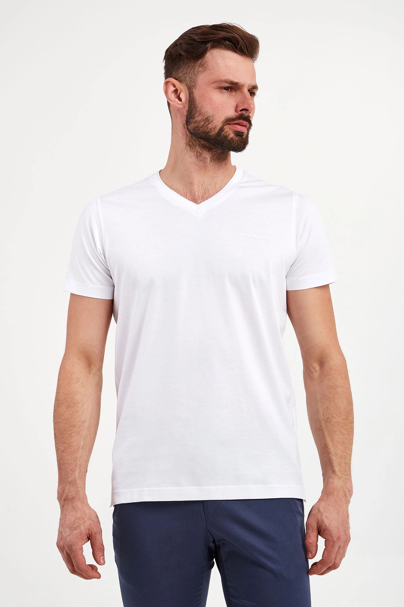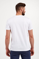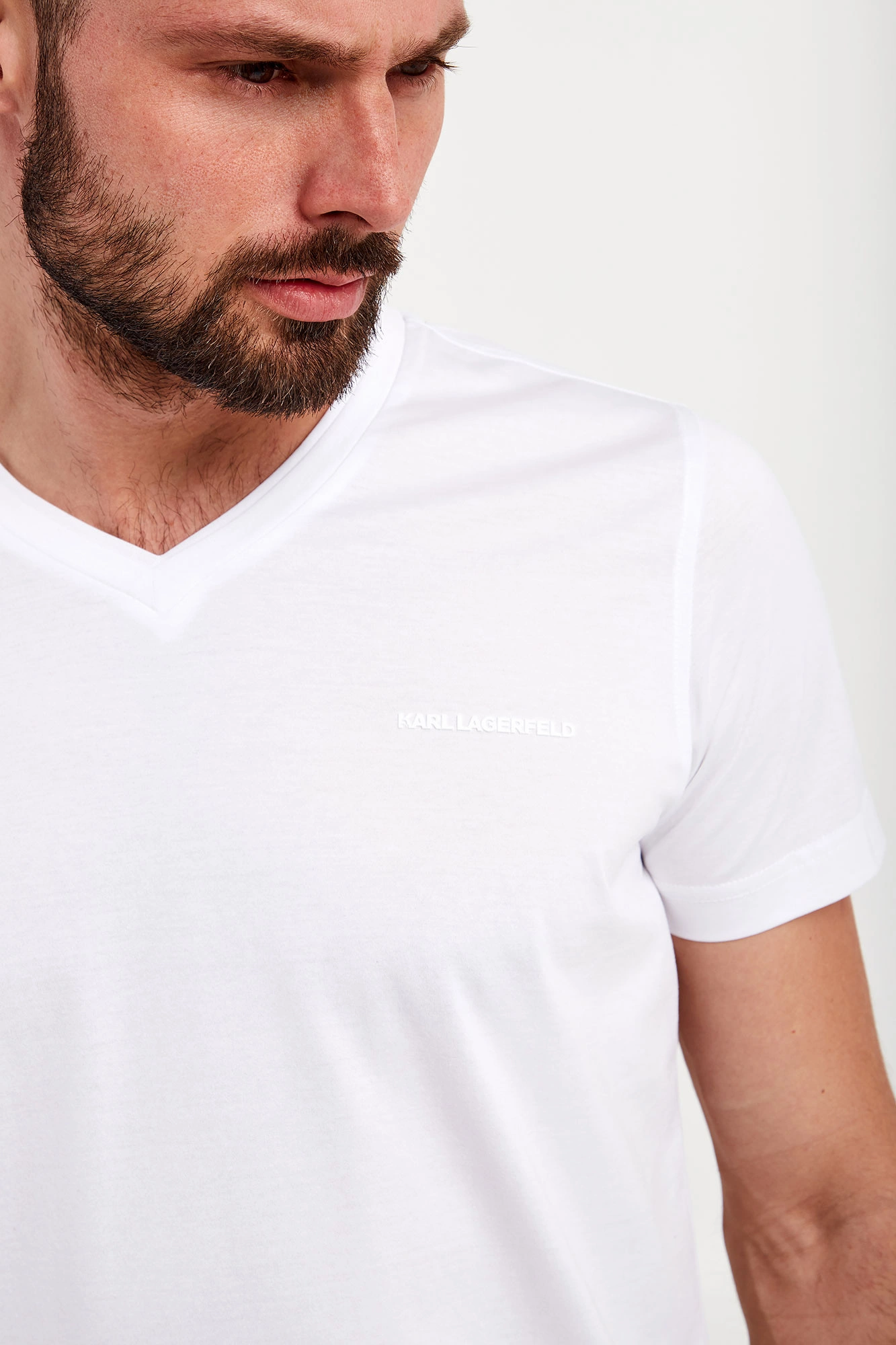 T-shirt marki Karl Lagerfeld w białym kolorze. Fason slim fit. Z boku gumowany, biały nadruk z logo. Dekolt typu v-neck wykończony ściągaczem. Krótkie rękawy i dół zakończone lamówką. Po bokach niewielkie rozcięcia. Wykonany z czystej bawełny.