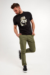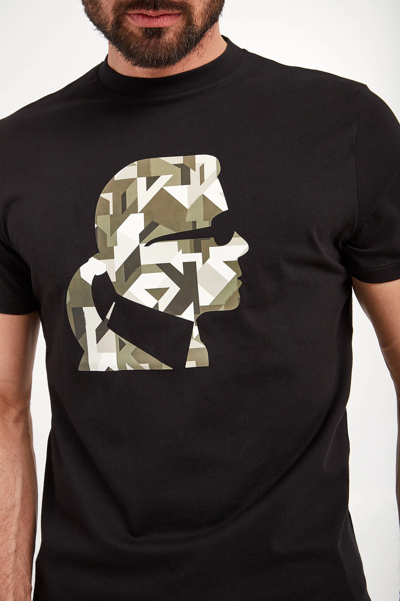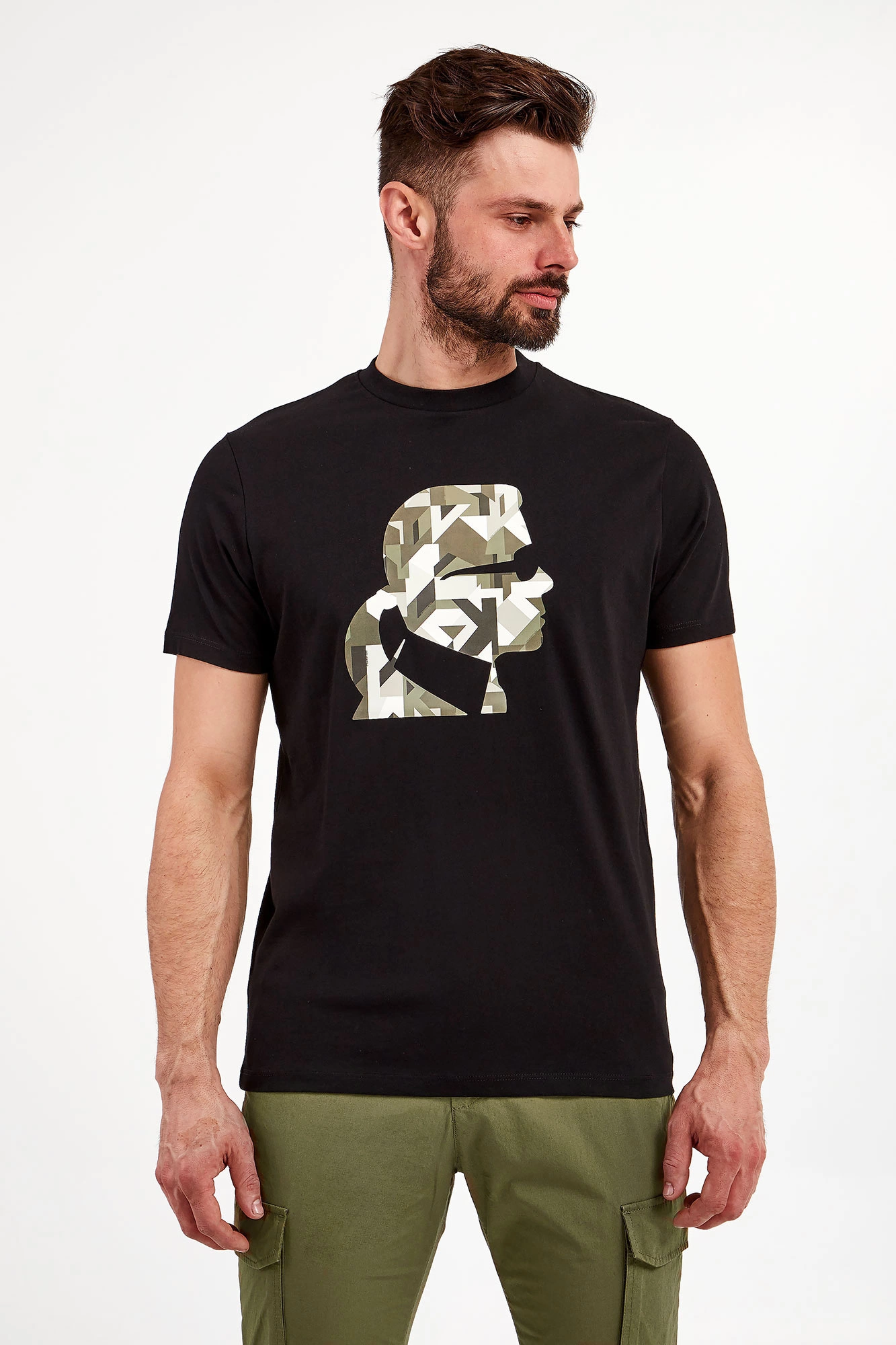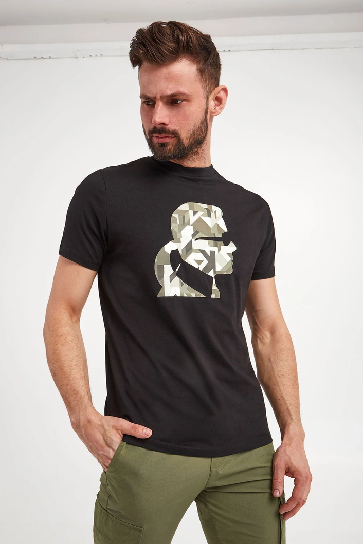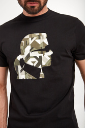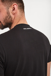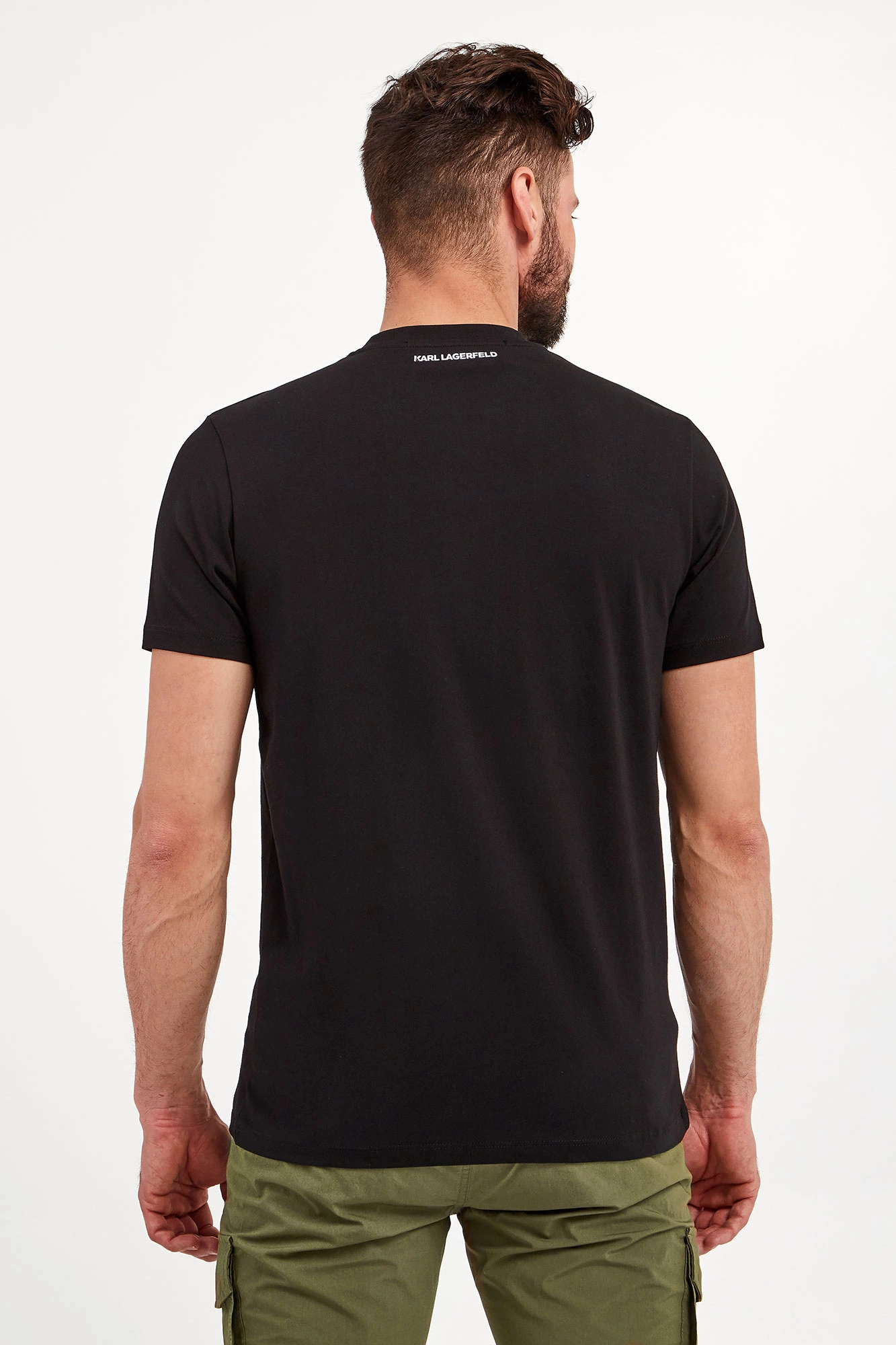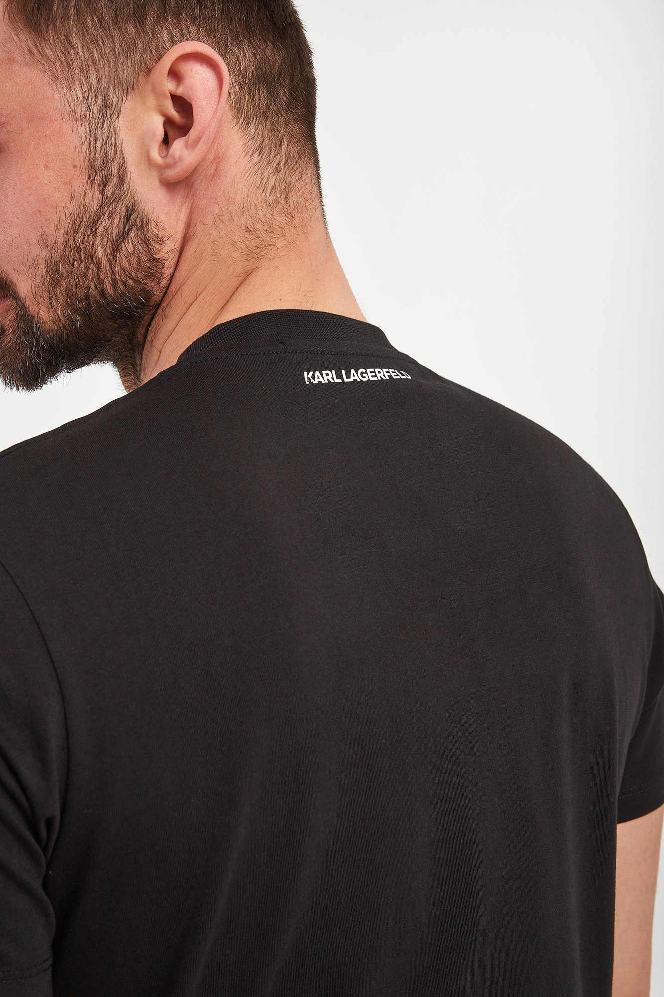 T-shirt marki Karl Lagerfeld w czarnym kolorze. Model z linii "Karl Cares", która wspiera zrównoważoną modę. Fason slim fit. Na froncie zielono-biały nadruk z wizerunkiem założyciela marki. Dekolt typu o-neck zakończony ściągaczem. Krótkie rękawy i dół wykończone lamówką. Na linii karku czarny nadruk z logo. Wykonany ze stuprocentowej bawełny.