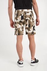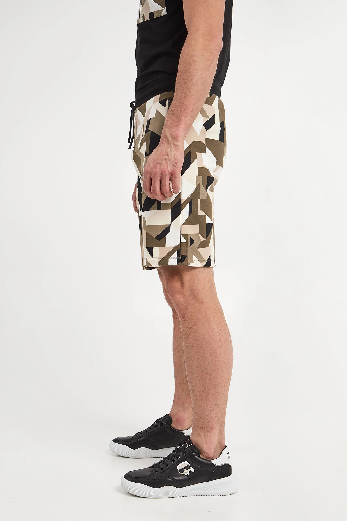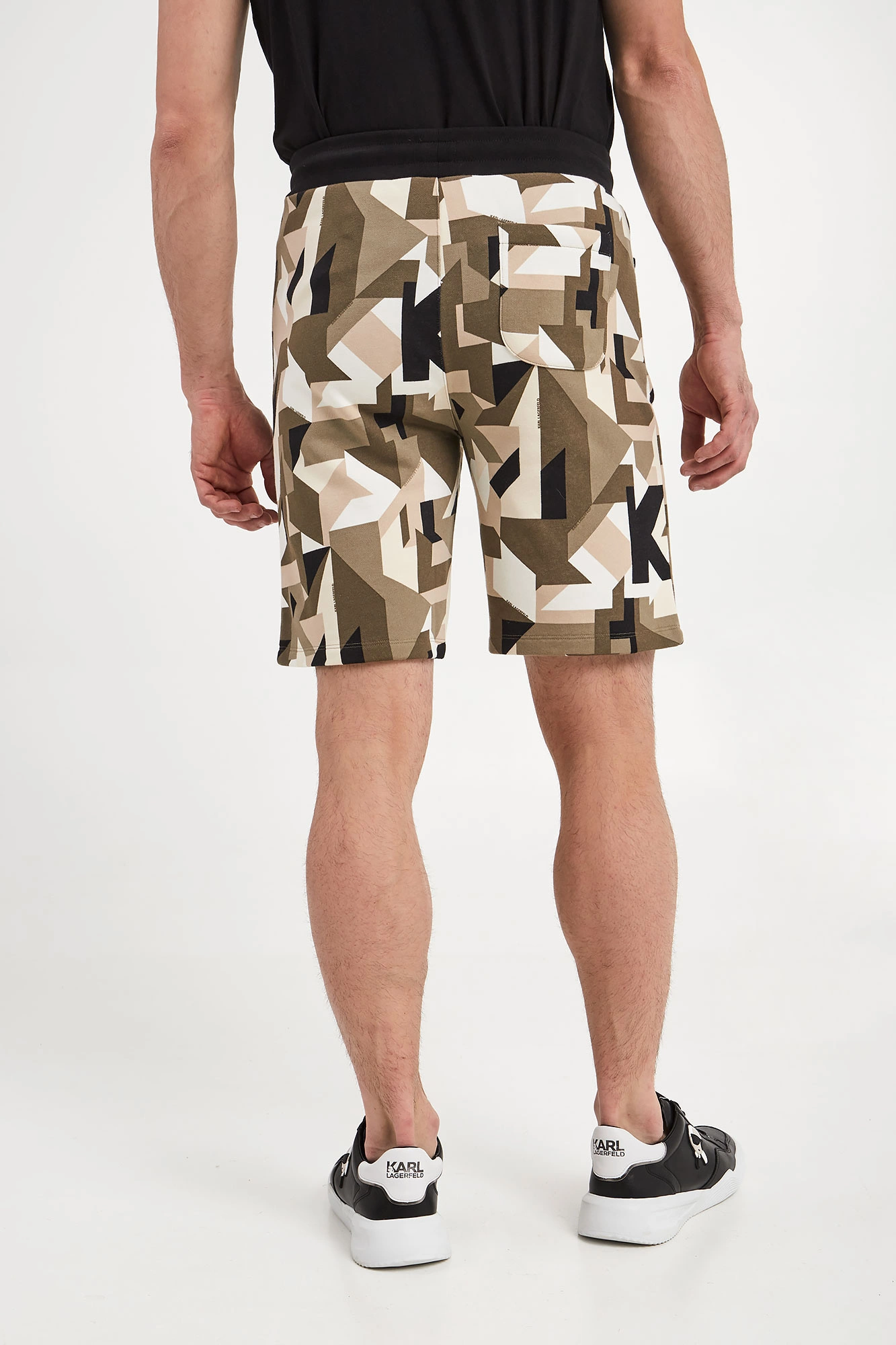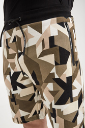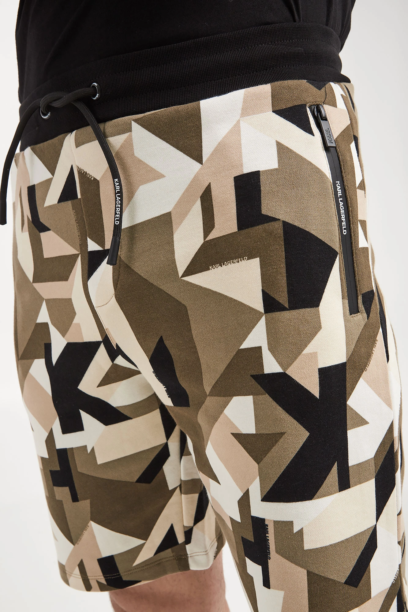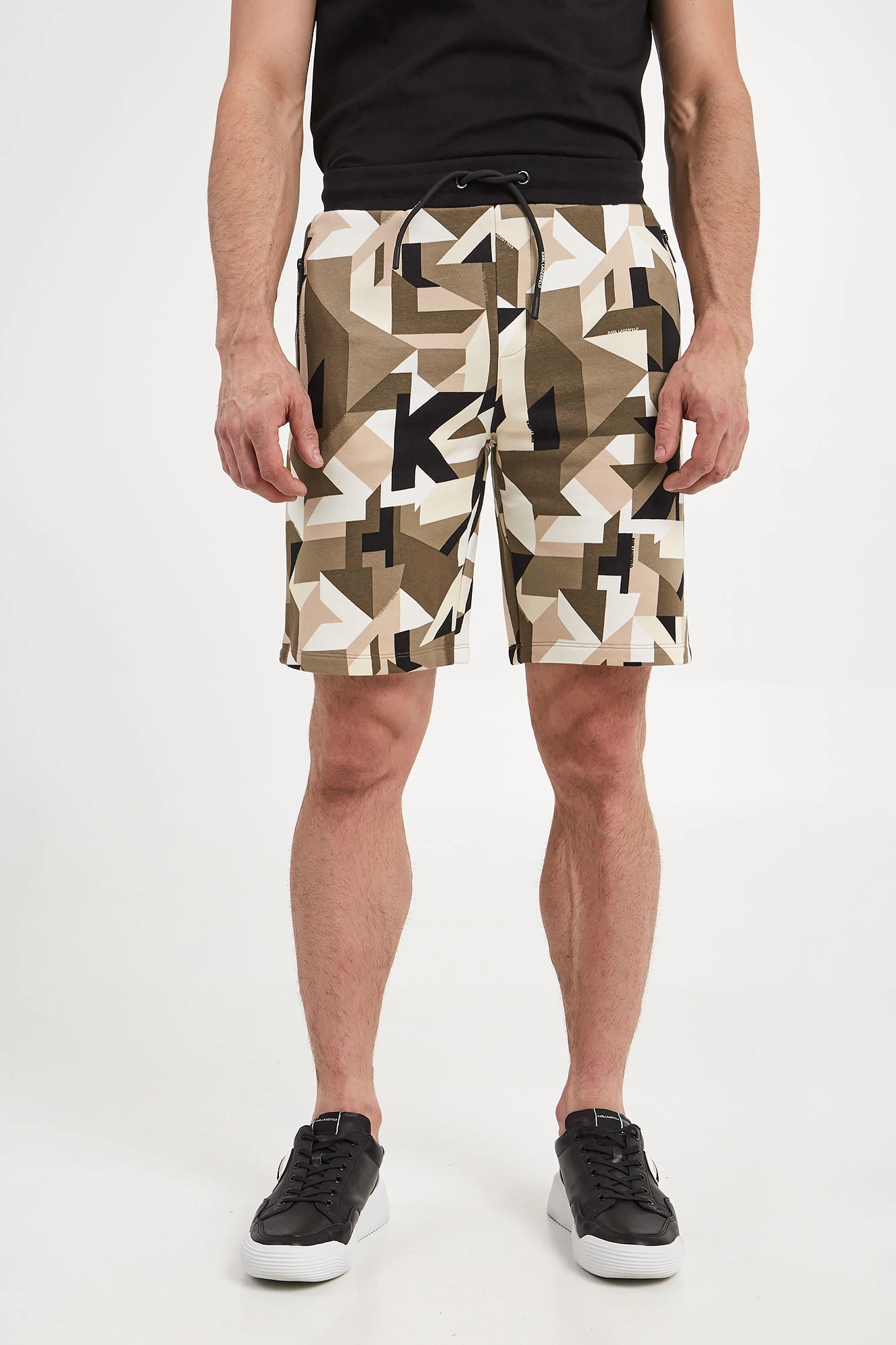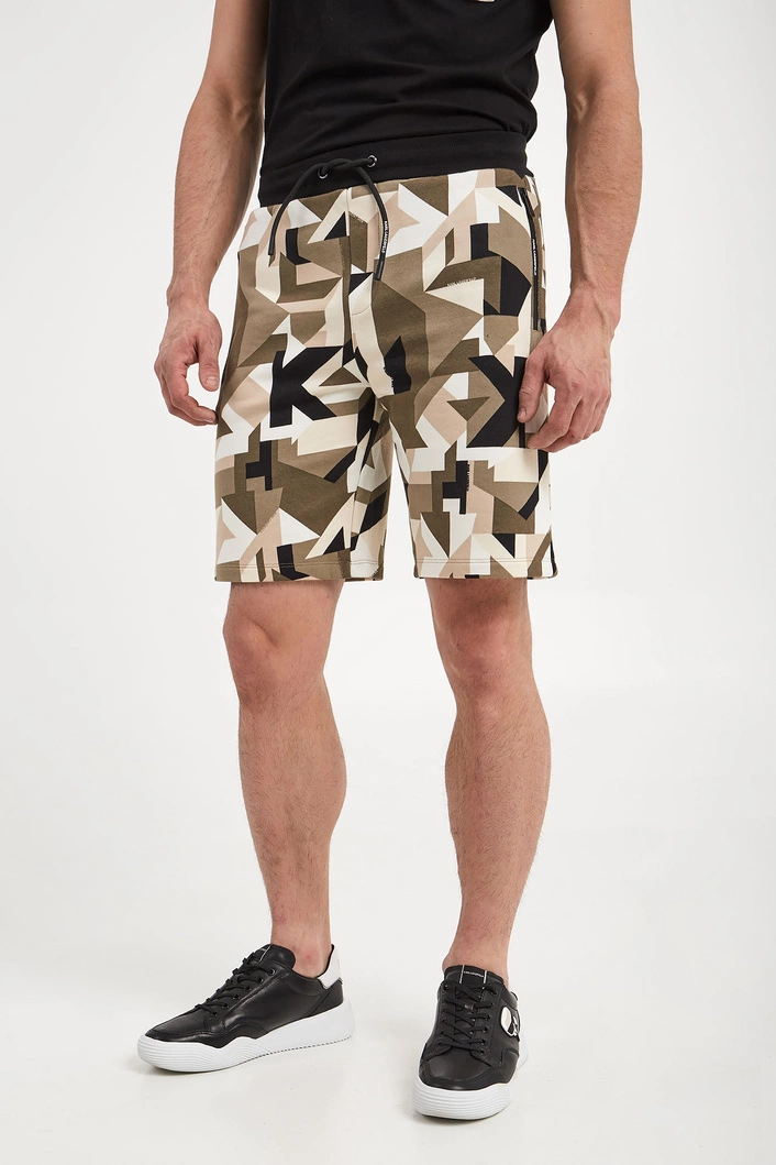 Spodenki marki Karl Lagerfeld. Na całości wielokolorowy nadruk w postaci monogramu marki. Fason typu regular fit. Model z trzema kieszeniami. Z przodu dwie zapinane na czarny, sygnowany zamek. Z tyłu jedna niezapinana. W talii ściągacz regulowany za pomocą troczków w czarnym kolorze. Wykonane z miłego w dotyku materiału.