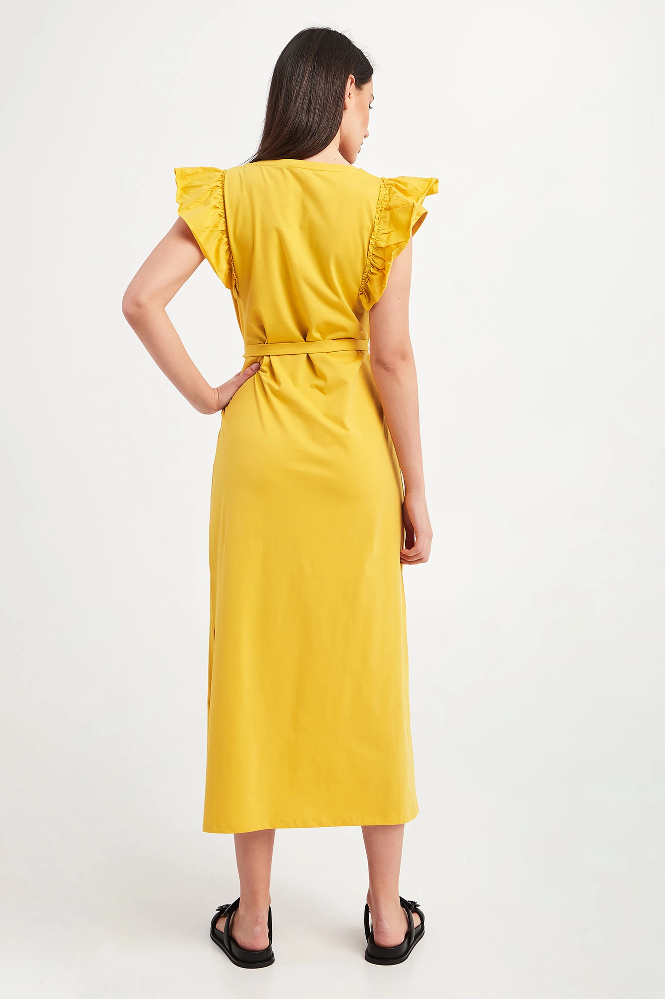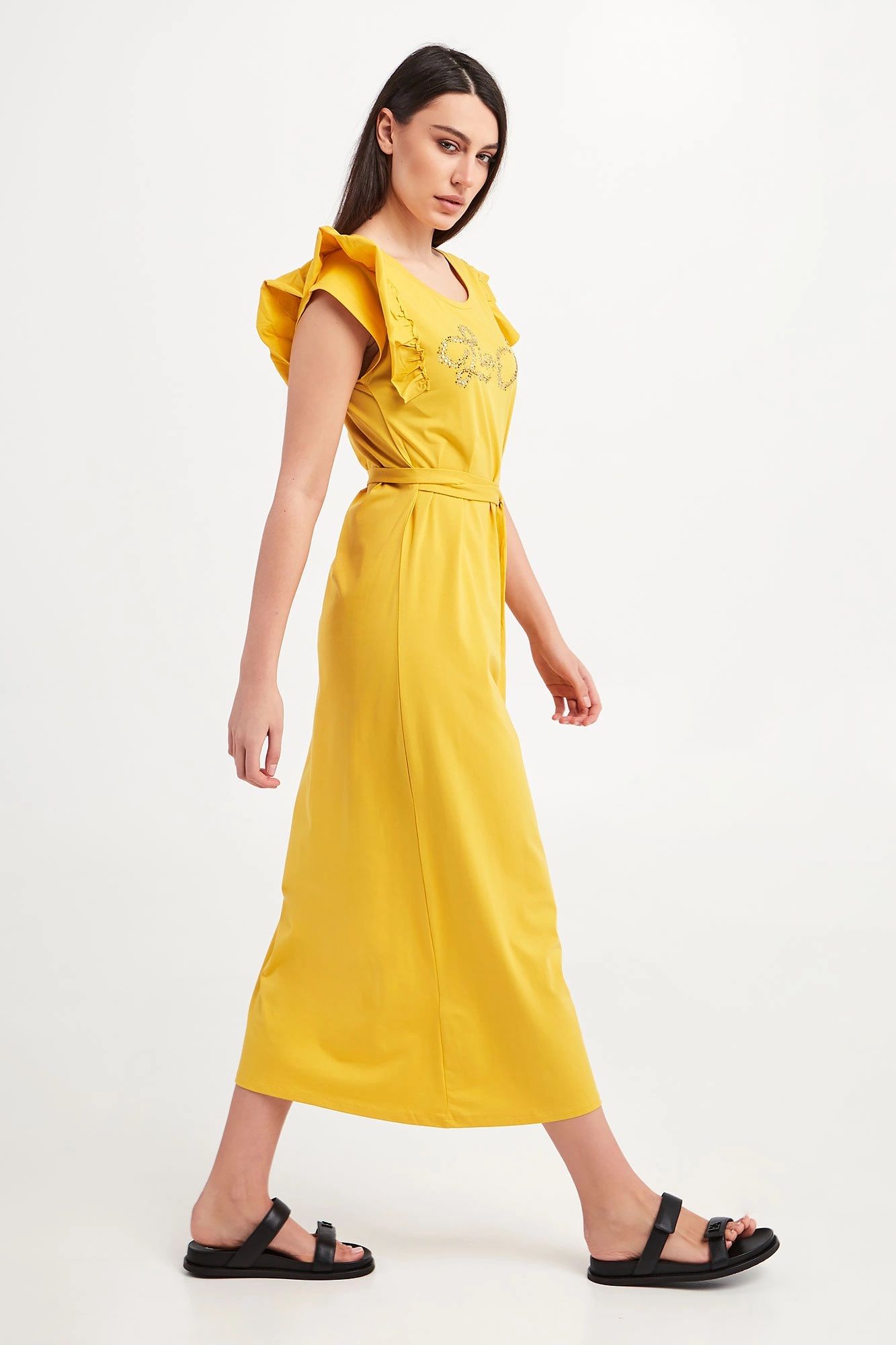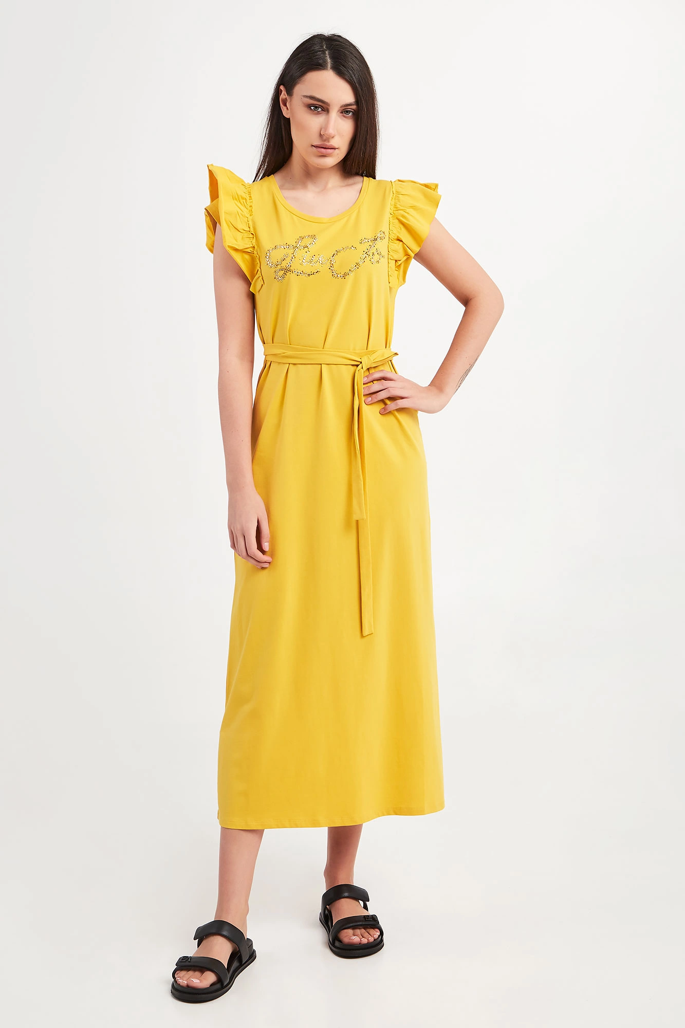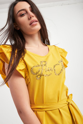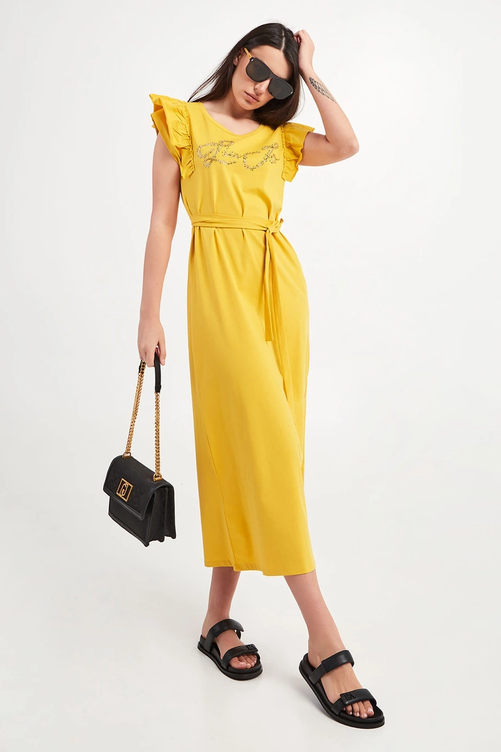 Sukienka marki Liu Jo w zielonym kolorze. Fason regular fit, długość midi. Z przodu logo marki wykonane z kryształków w różnych odcieniach złota. Krótkie rękawy zakończone falbankami. Okrągły dekolt. W talii dodatkowy pasek. Po boku rozcięcie. Wykonana z bawełnianej tkaniny z domieszką elastycznych włókien.