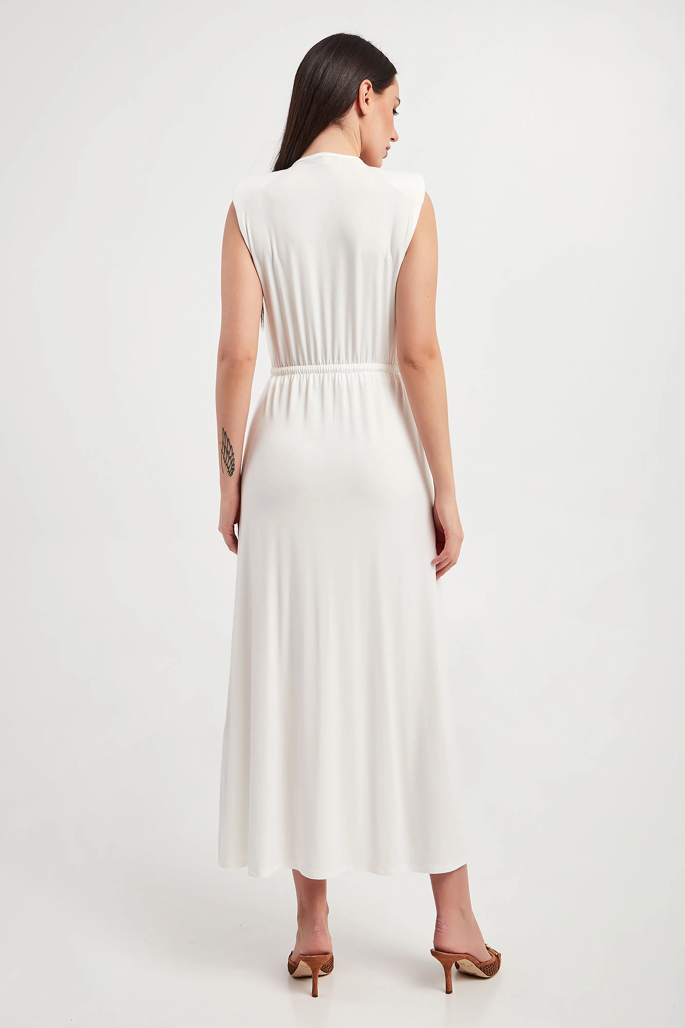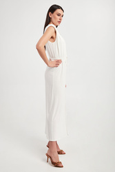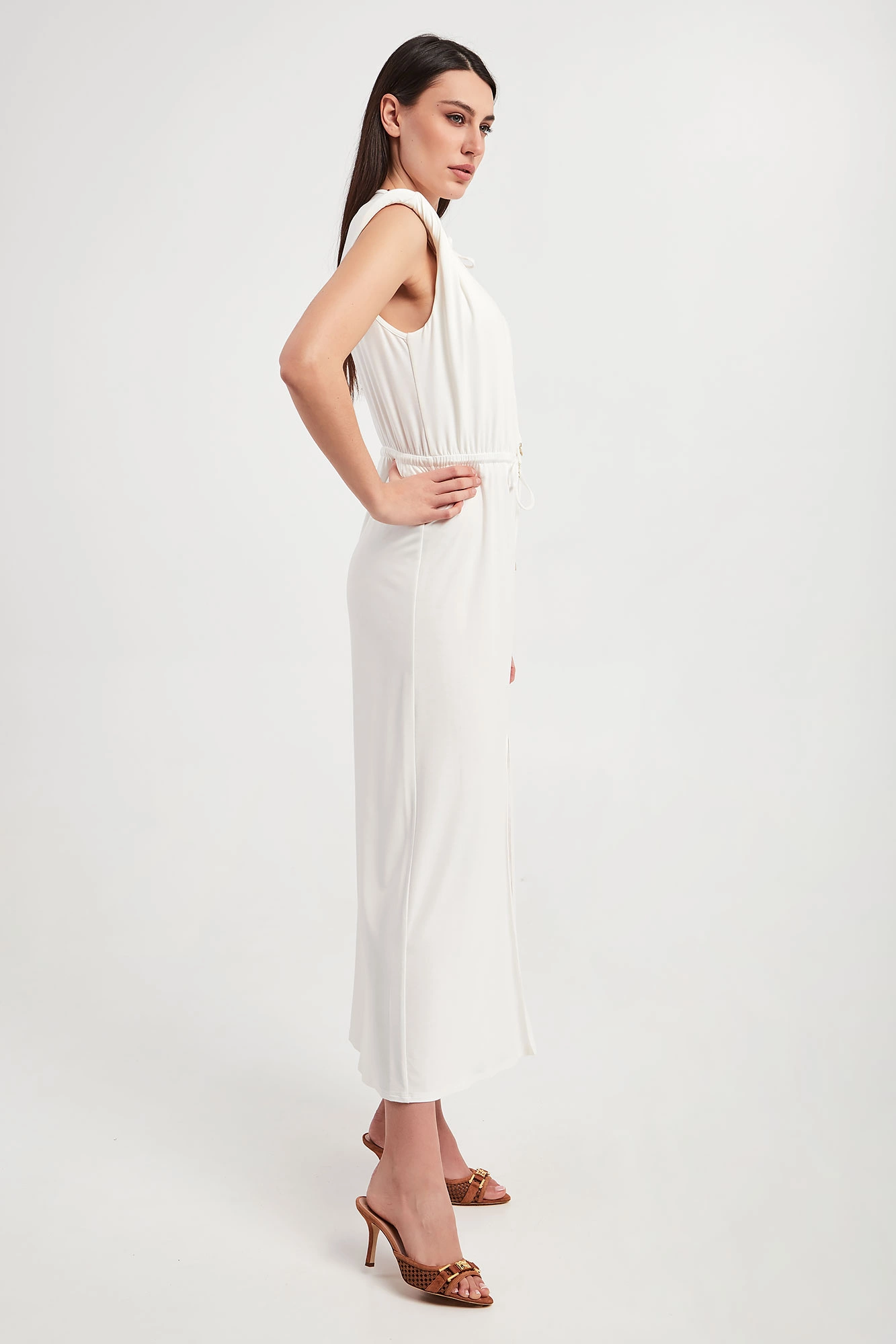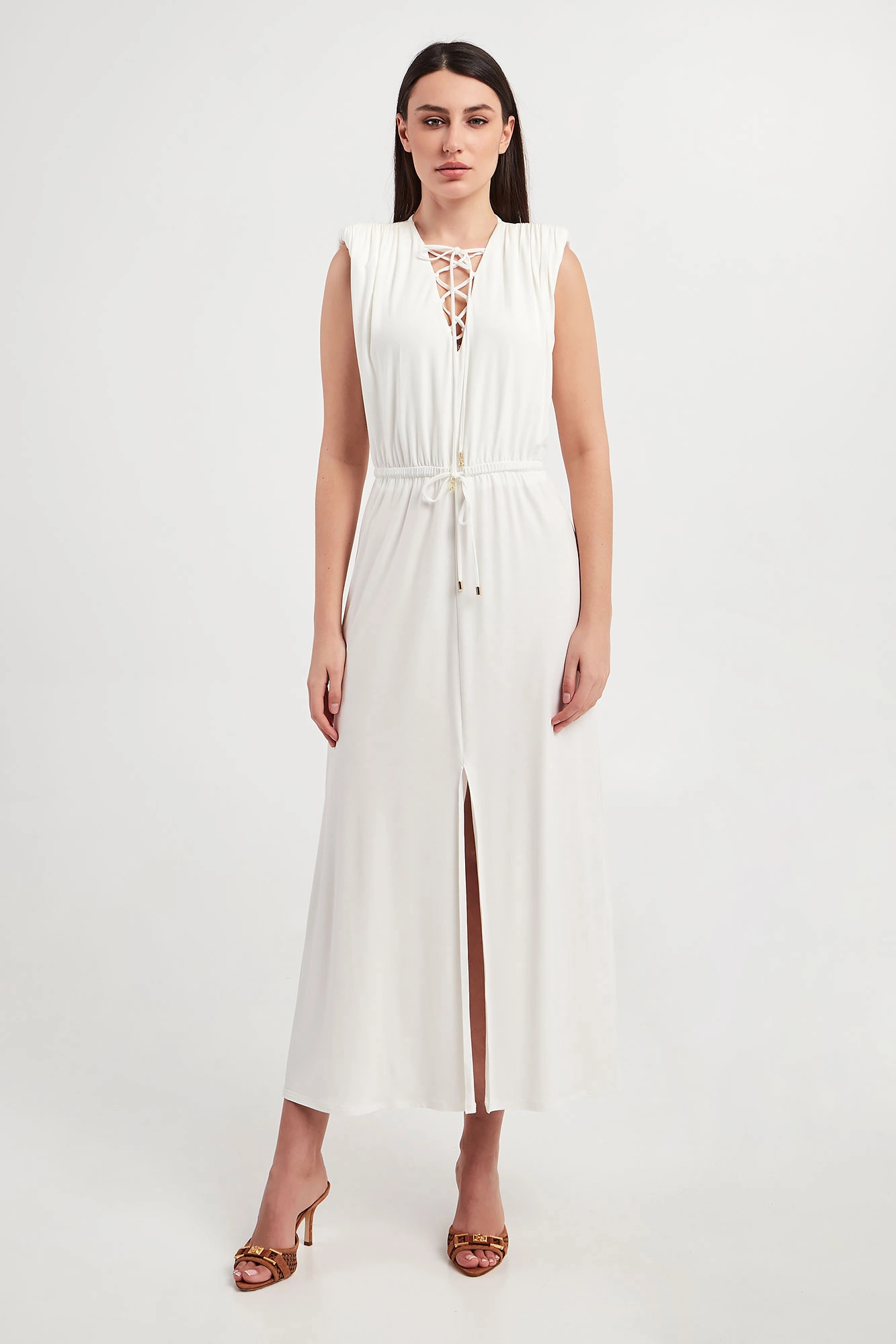 Sukienka marki Patrizia Pepe w białym kolorze. Fason slim, długości midi. Dekolt typu v-neck wykończony ozdobnym wiązaniem z metalowymi zawieszkami w kształcie logo marki w złotym kolorze. W pasie elastyczny ściągacz regulowany za pomocą troczków. W ramionach poduszki. Z przodu ozdobne rozcięcie. Wykonana z elastycznej wiskozy, pochodzącej z kontrolowanych i odpowiedzialnie zarządzanych źródeł.