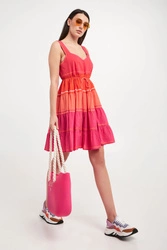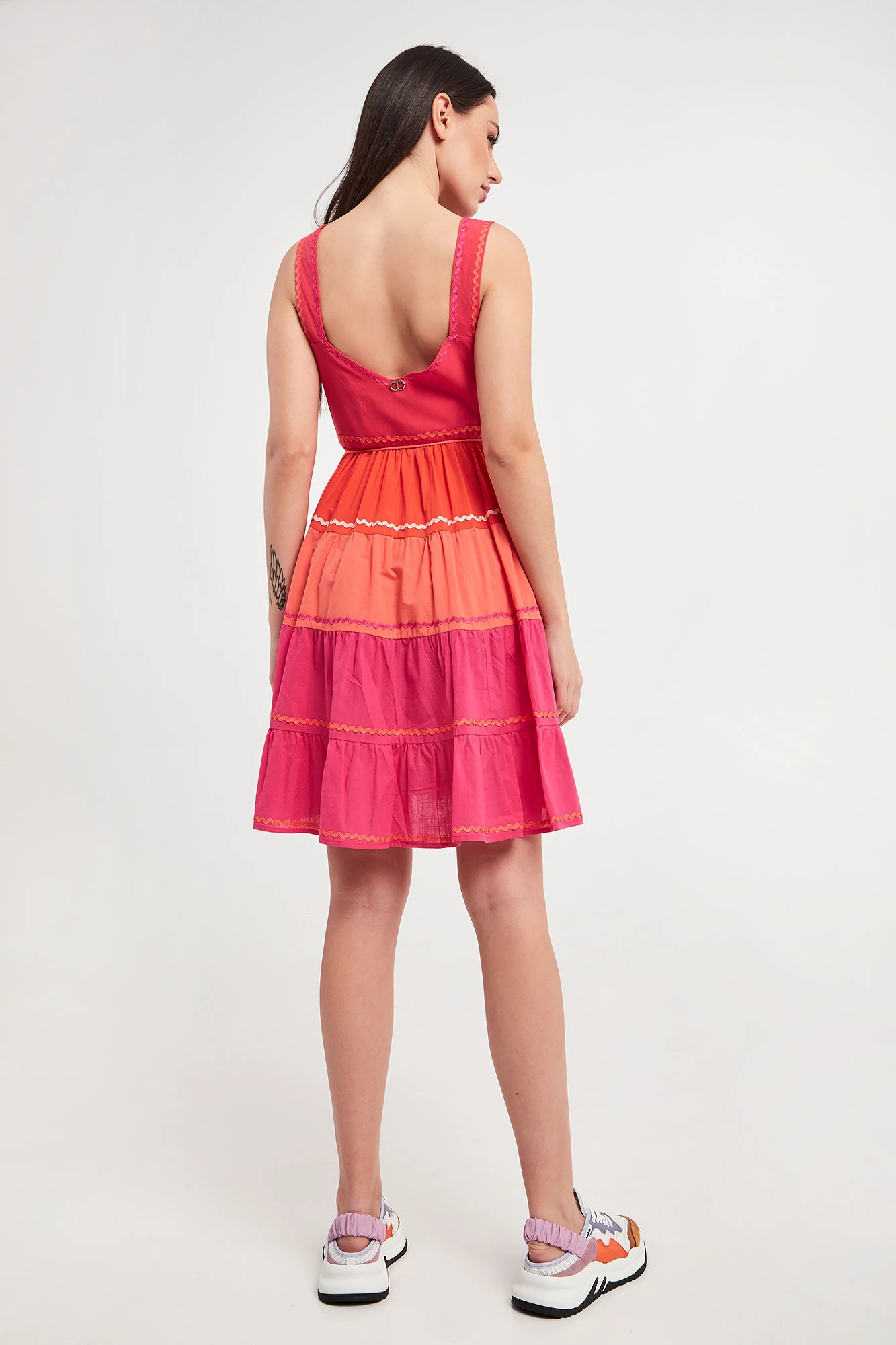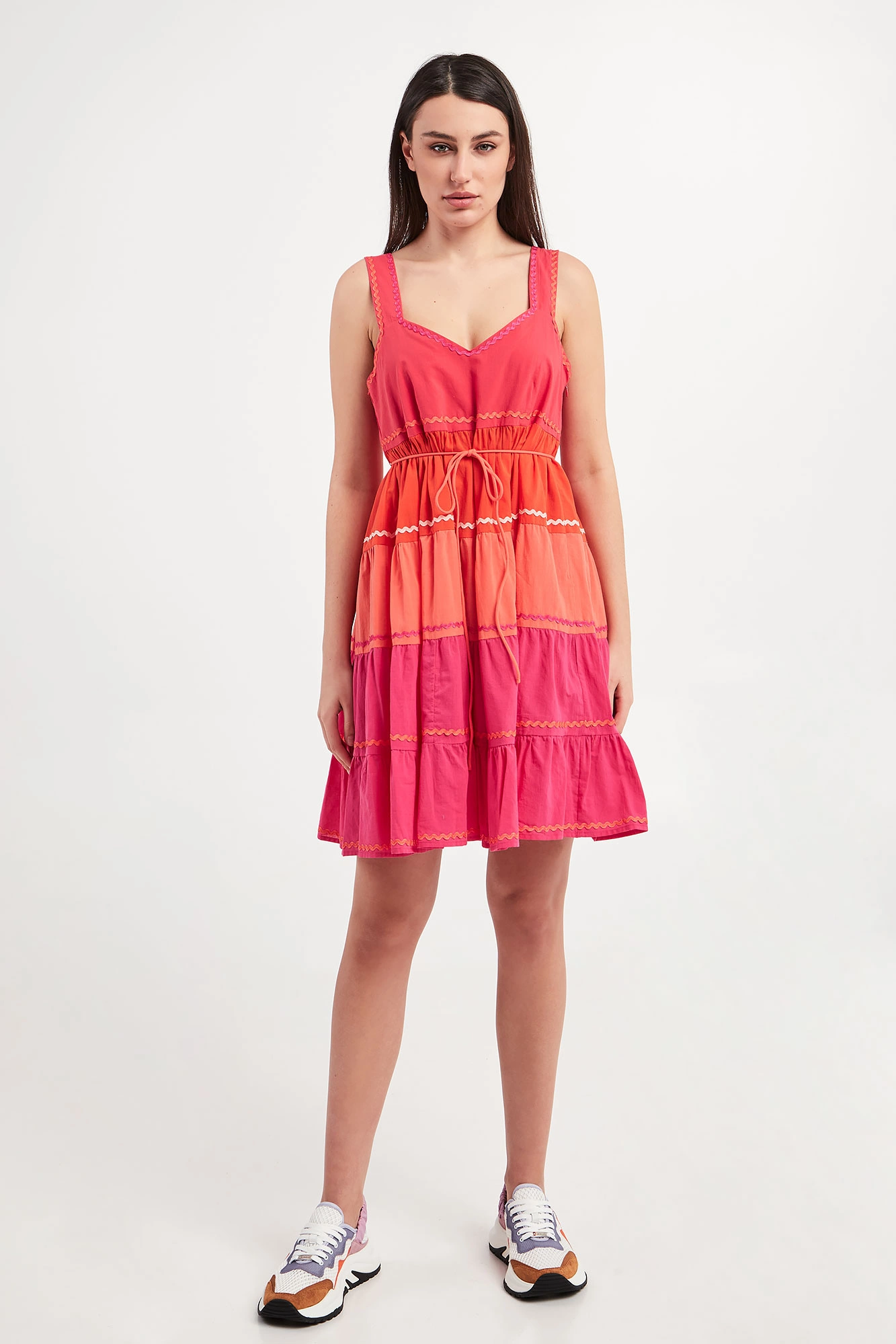 Sukienka marki Twinset w pomarańczowo-różowym kolorze. Fason relaxed fit, długość mini. Na ramiączkach. Dekolt typu v-neck. Na całości ozdobne, wielokolorowe hafty. Dół wykończony plisowaniem. Zapinana po boku za pomocą zamka błyskawicznego. Z tyłu metalowa aplikacja z logo i nazwą marki w złotym kolorze. W pasie materiałowy troczek umożliwiający wiązanie. Wykonana z czystej bawełny.