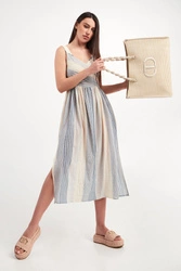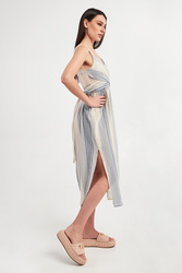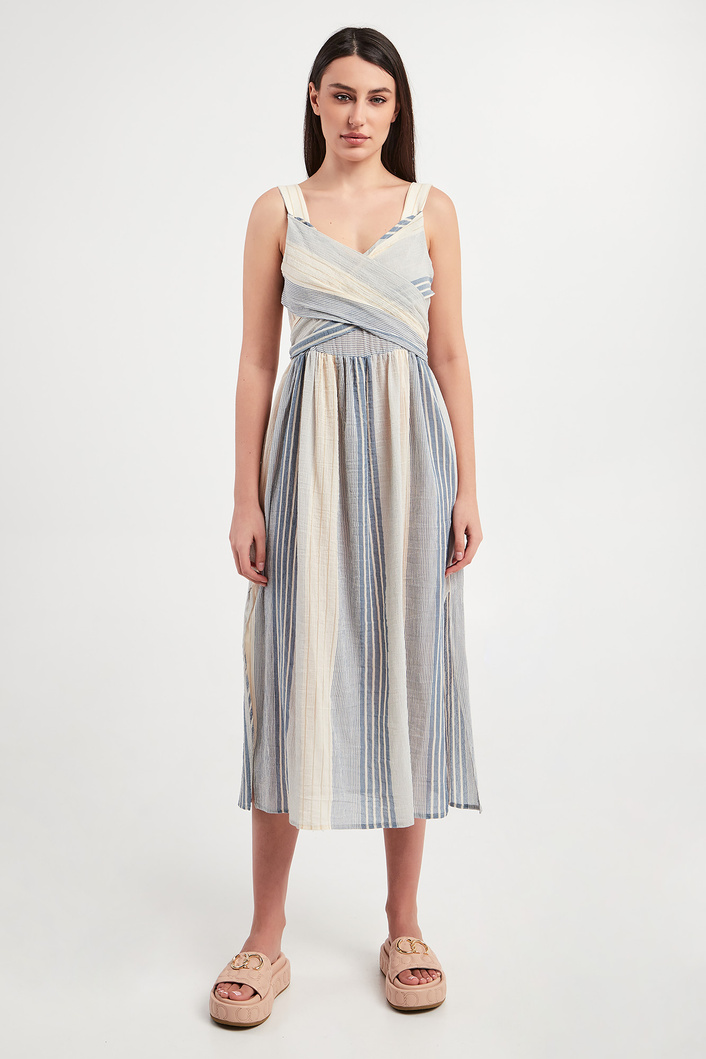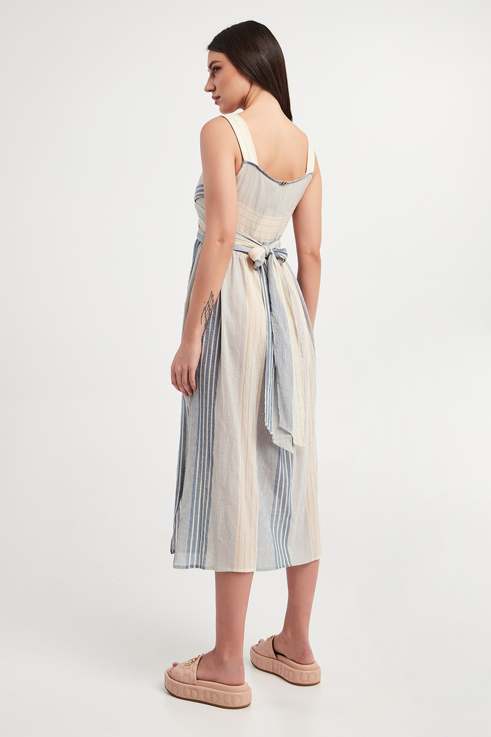 Sukienka marki Twinset. Na całości beżowo-złoto-niebieskie paski. Fason typu regular fit o długości midi. Dekolt typu v-neck. Na ramiączkach, a przy nich ozdobne tasiemki. Po boku zamek błyskawiczny. Z tyłu metalowa aplikacja w kształcie logo i nazwy marki. Po bokach rozcięcia. Wykonana z bawełny.