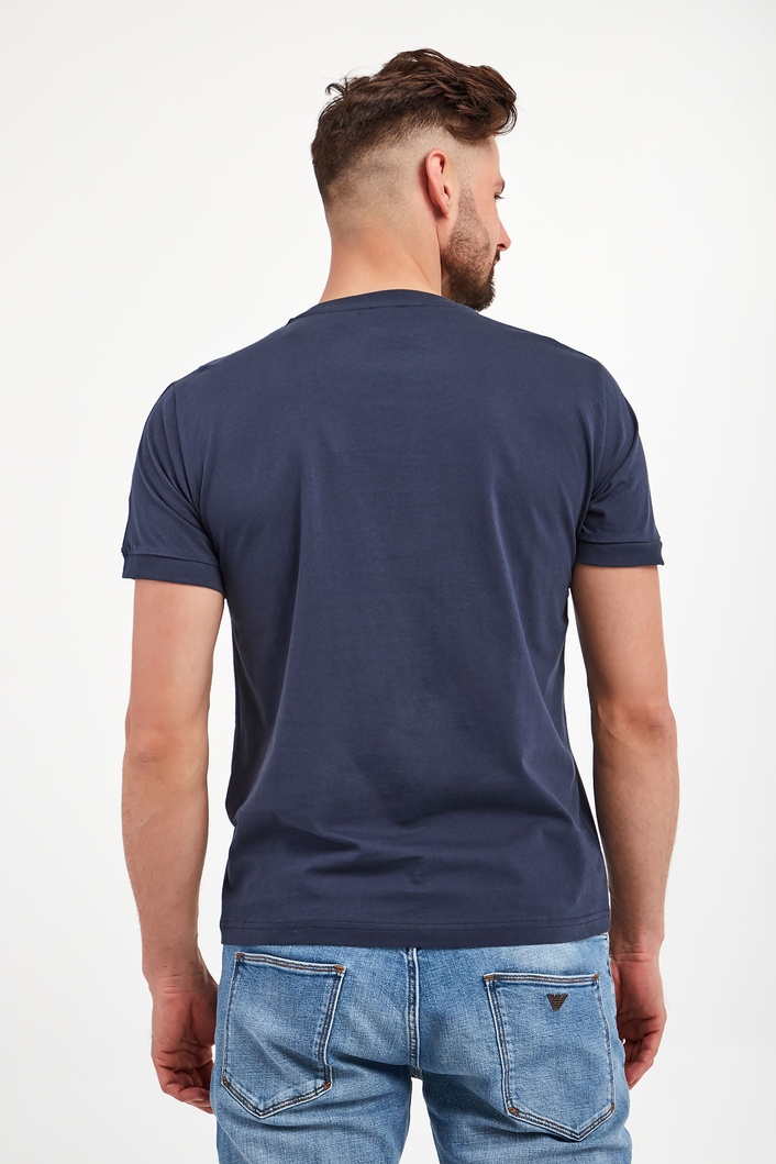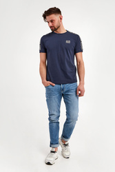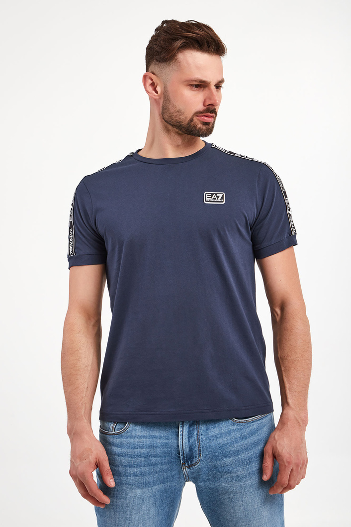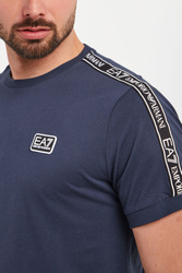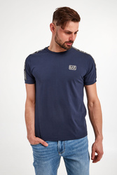 T-shirt marki EA7 Emporio Armani w granatowym kolorze. Fason regular fit. Na froncie biało-czarna, gumowa naszywka z logo. Na ramionach biało-czarne, logowane lampasy. Krótkie rękawy i dekolt typu o-neck wykończone ściągaczami. Dół zakończony lamówką. Wykonany z czystej bawełny.
