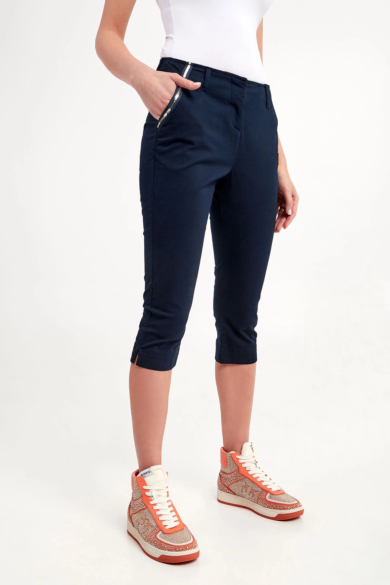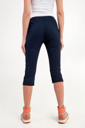 Spodnie marki EA7 Emporio Armani w granatowym kolorze. Fason typu slim. Zapinane na zamek oraz metalową haftkę. Po bokach kieszenie. W pasie szlufki. Kieszenie wykończone lamówką ze złotymi cekinami. Z przodu złota naszywka w postaci nazwy i logo marki. Na dole nogawek delikatne rozcięcia.