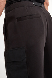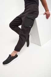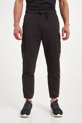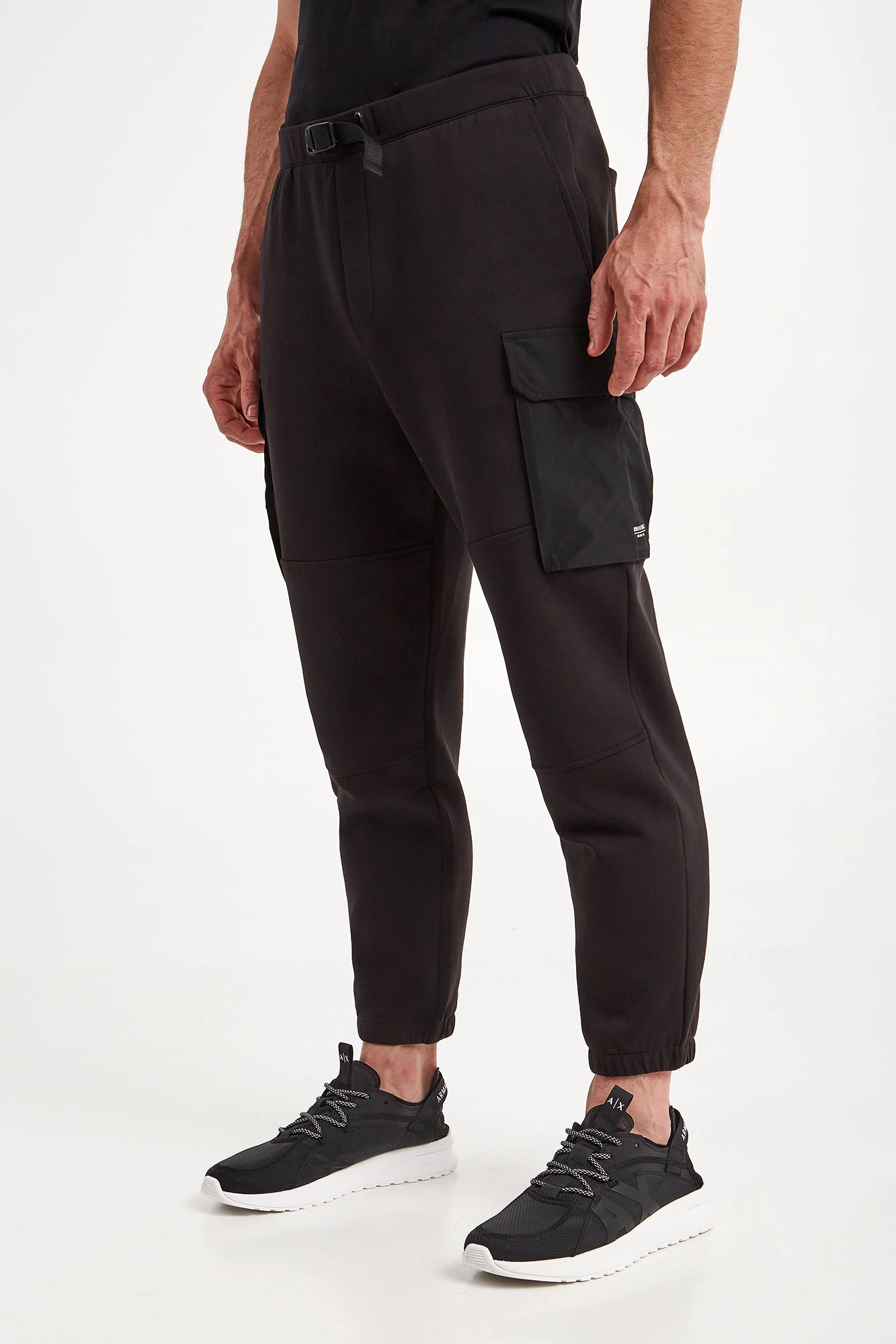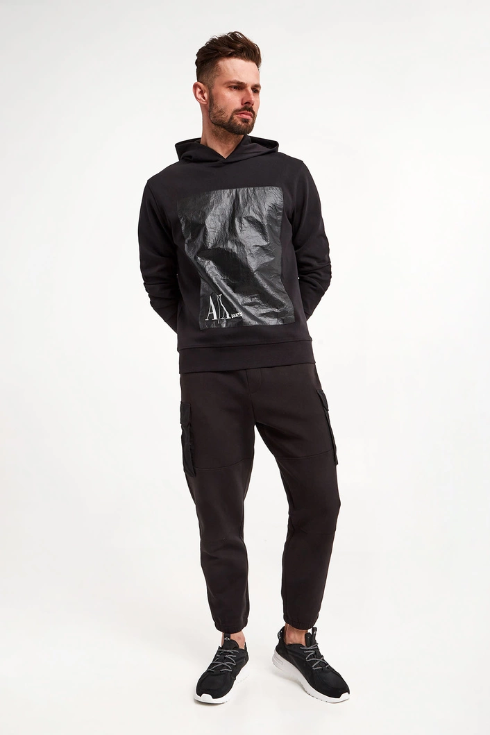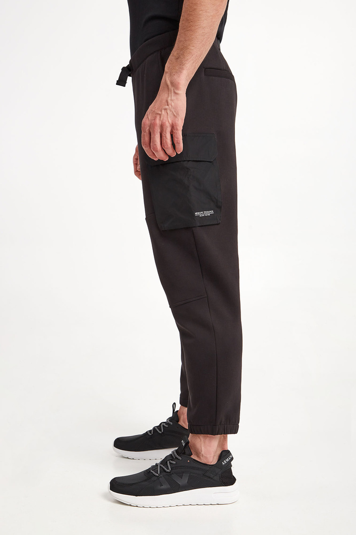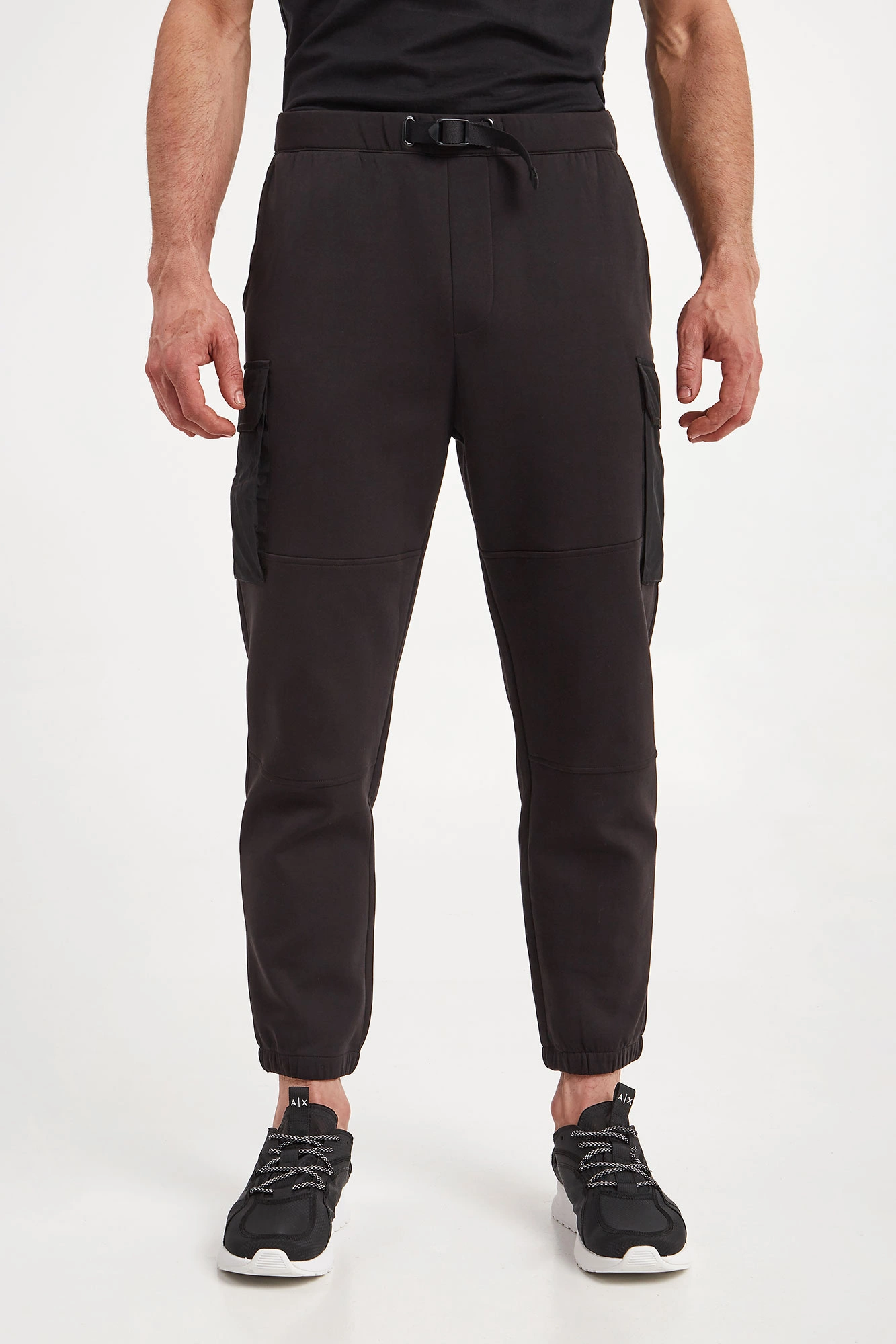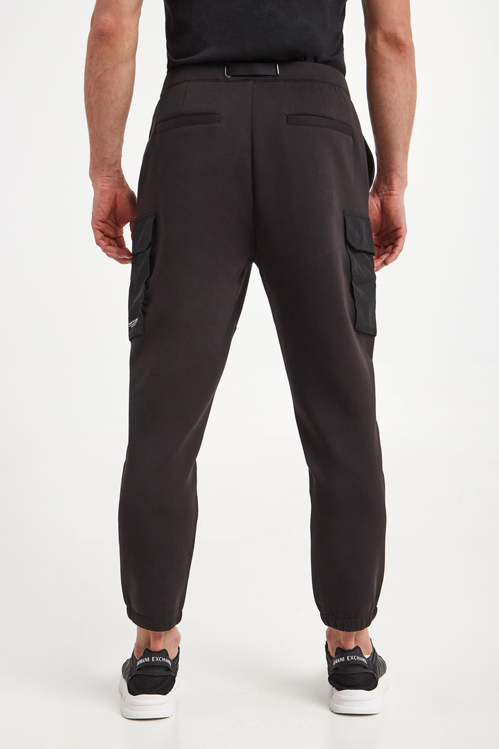 Spodnie marki Armani Exchange w czarnym kolorze. Fason typu slim. Model z sześcioma kieszeniami, z czego dwie typu cargo z patką, zapinane na napy. Na jednej z kieszeni nadruk z nazwą marki w kontrastowym, białym kolorze. W talii ściągacz regulowany za pomocą paska z klamrą. Wykonane z bawełnianej tkaniny.