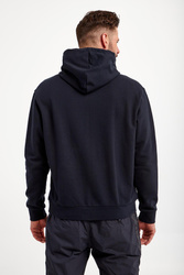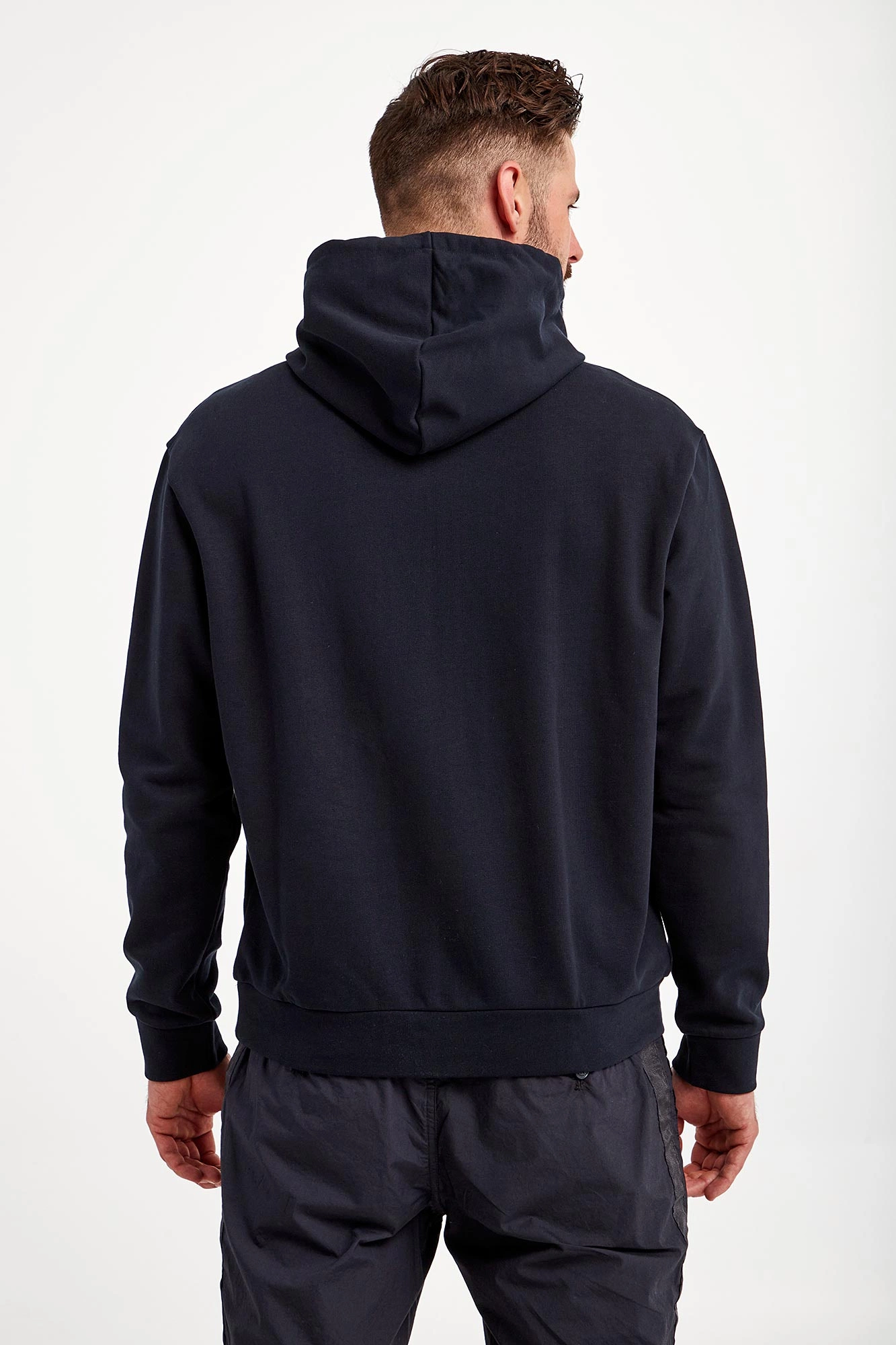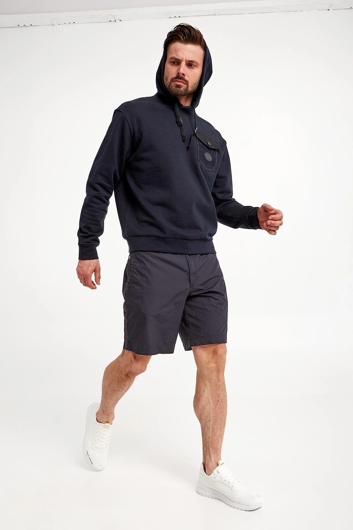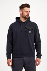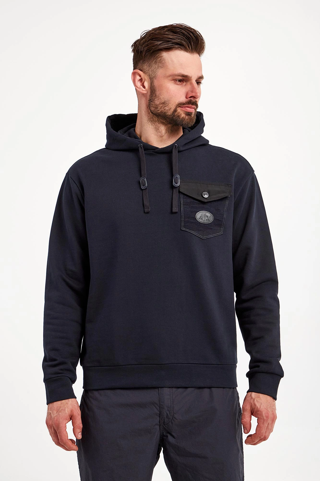 Bluza marki Armani Exchange w granatowym kolorze. Fason typu regular fit. Z kapturem regulowanym za pomocą troczków. Z przodu kieszonka z patka zapinaną za pomocą sygnowanego guzika. Na kieszeni naszywka z wytłoczonym logo marki. Rękawy i dół wykończone elastycznym ściągaczem. Wykonana z grubej, elastycznej bawełny.