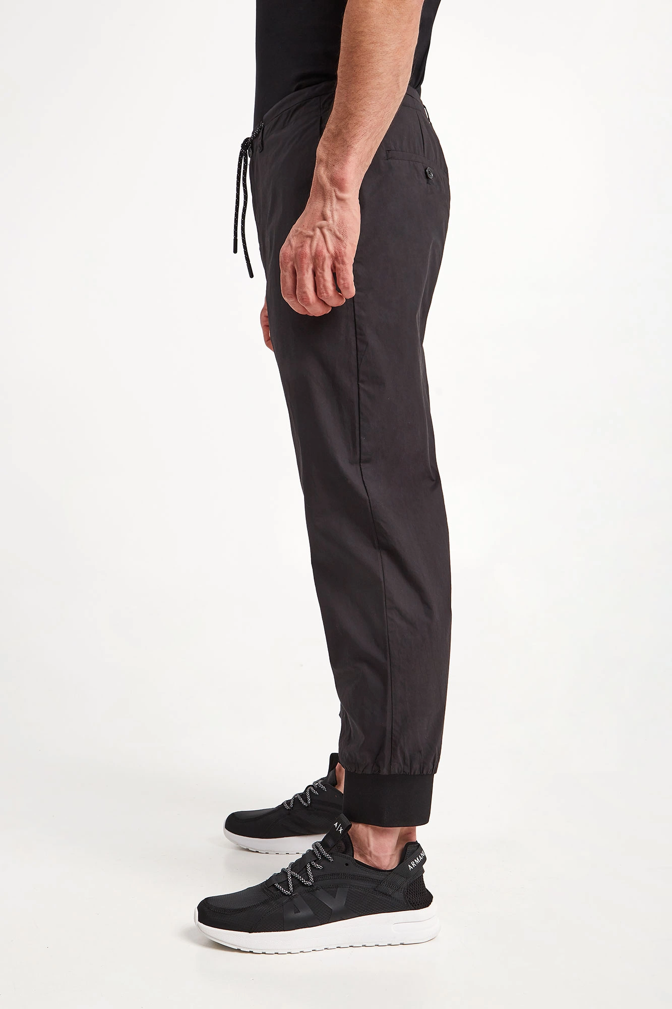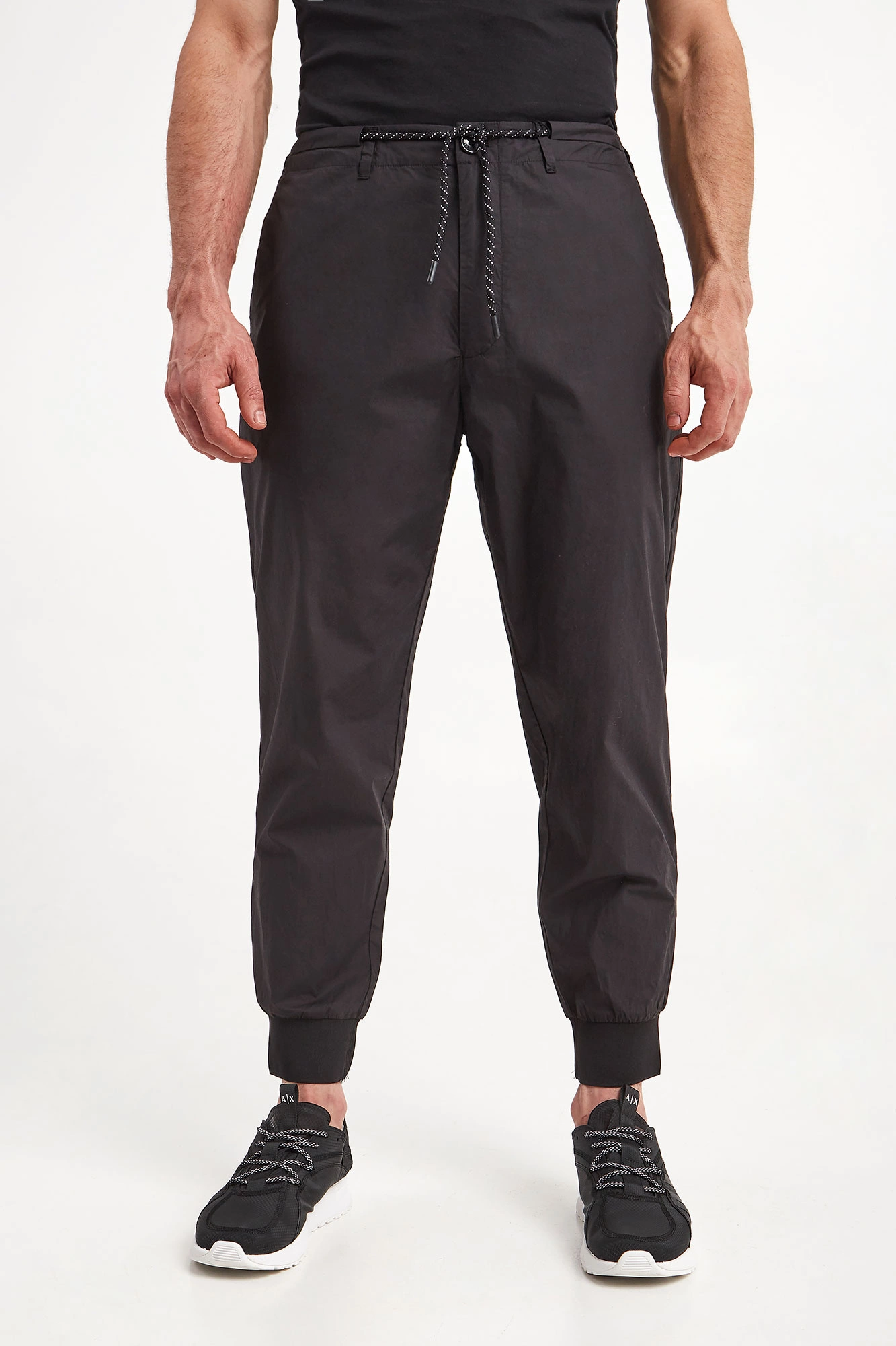 Spodnie marki Armani Exchange w czarnym kolorze. Fason typu jogger. Model czterema kieszeniami, z czego dwie zapinane za pomocą guzików. W talii ściągacz regulowany za pomocą troczków. Zapinane za pomocą zamka błyskawicznego i sygnowanego guzika. Nogawki zakończone ściągaczem. Wykonane z bawełnianej tkaniny.