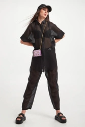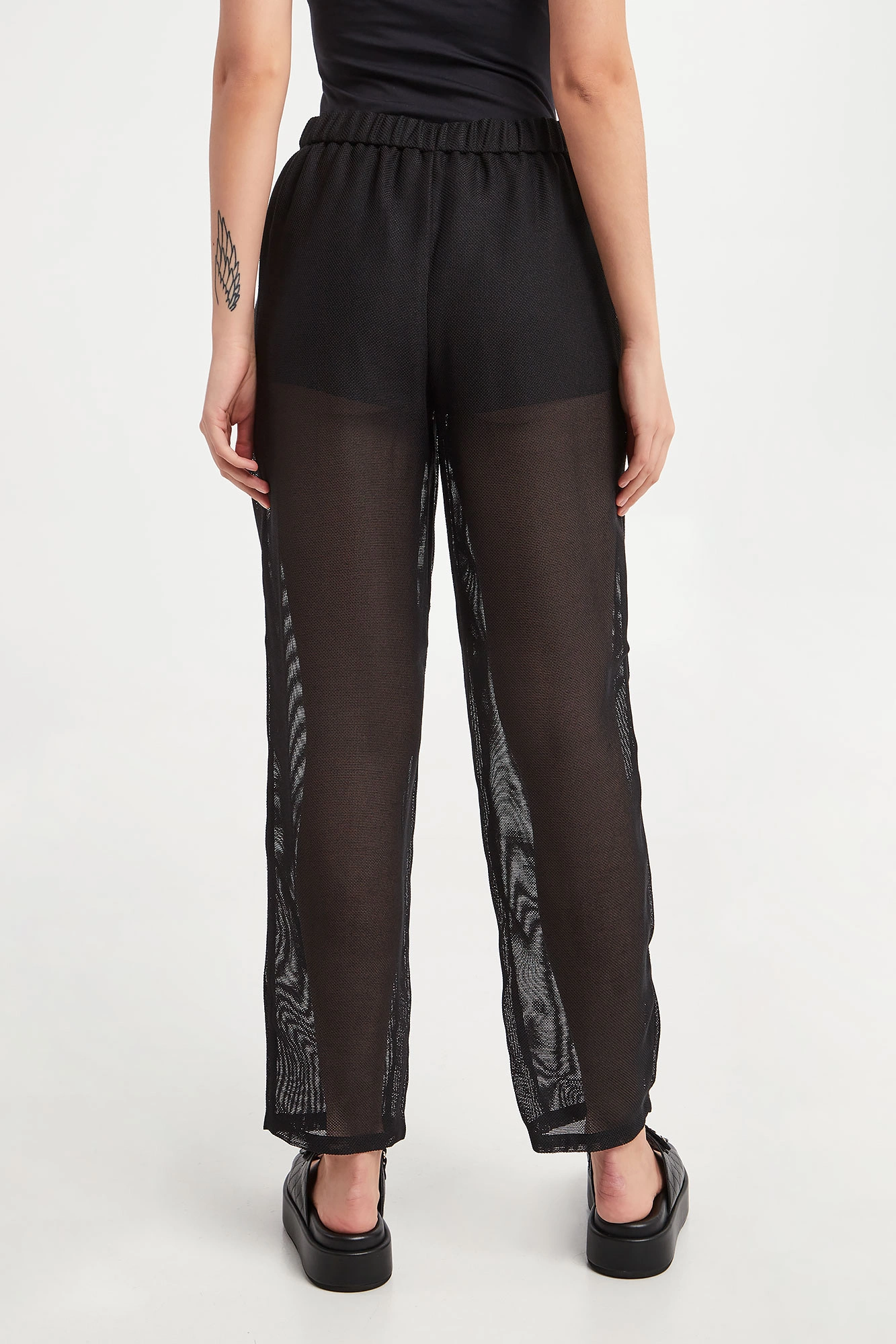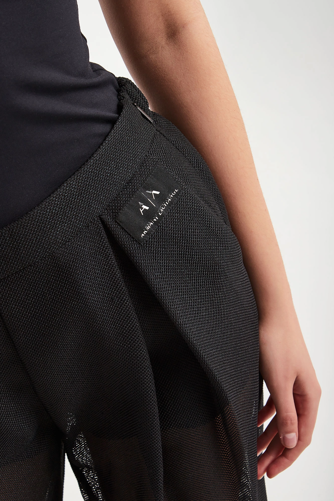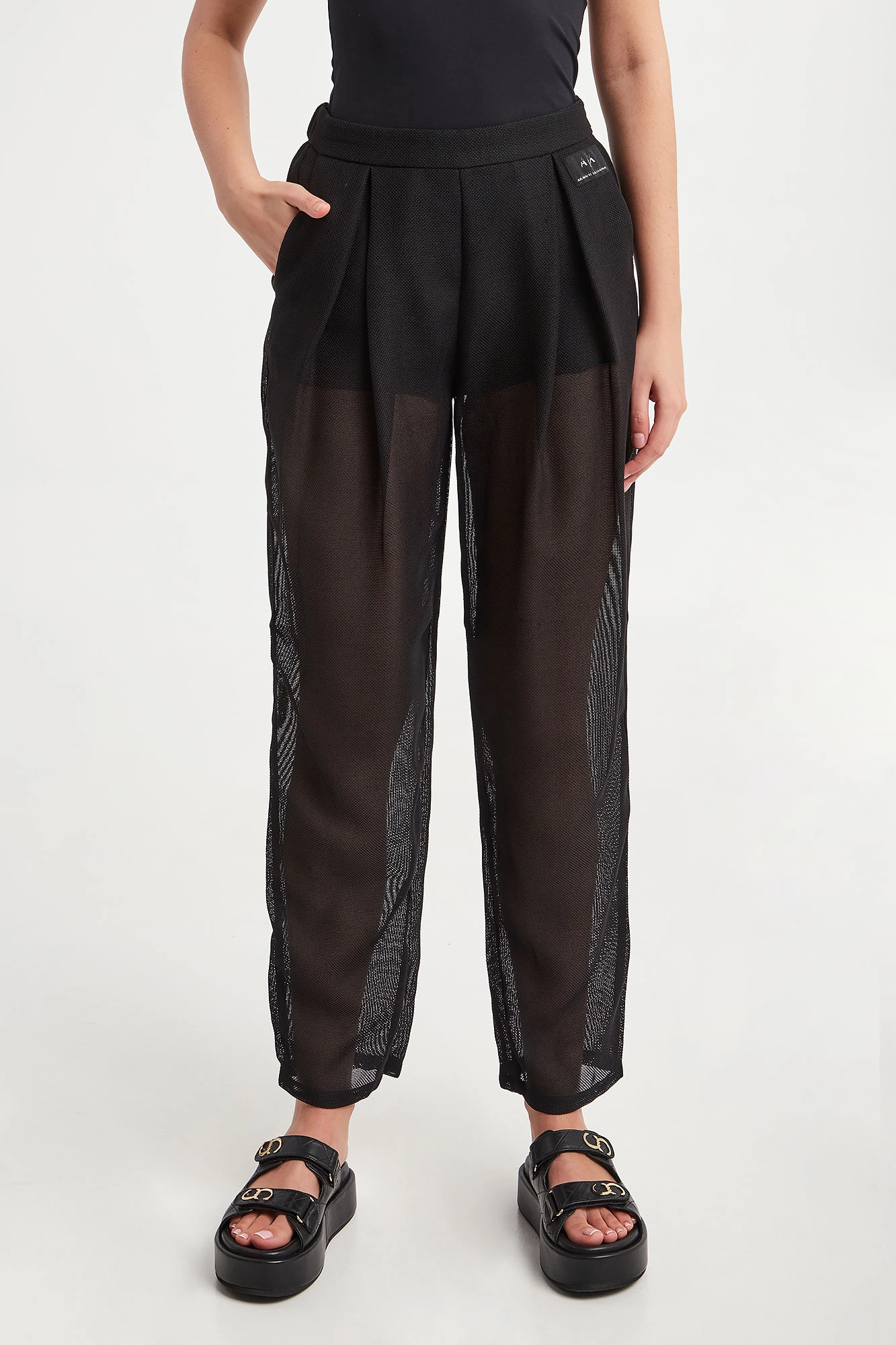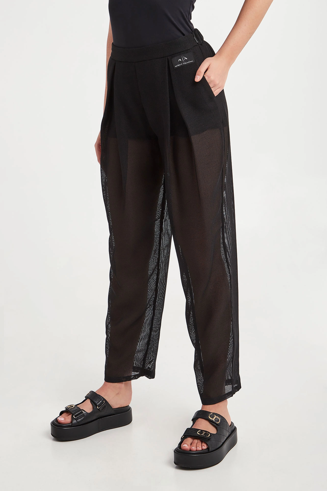 Spodnie marki Armani Exchange w czarnym kolorze. Fason palazzo. W talii elastyczny ściągacz. Z przodu zakładki. Całość wykonana z transparentnej siatki. Z przodu naszywka z nazwą marki w czarnym kolorze. Model z dwoma kieszeniami. Po boku zapinane za pomocą zamka błyskawicznego. Wewnątrz dodatkowa podszewka. Wykonana z przewiewnej tkaniny.