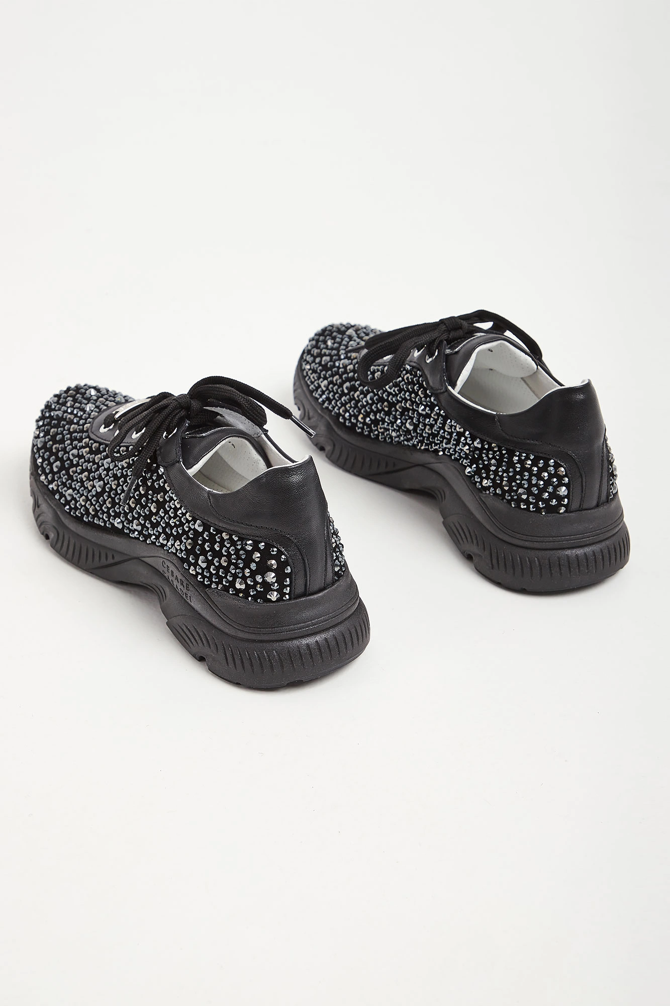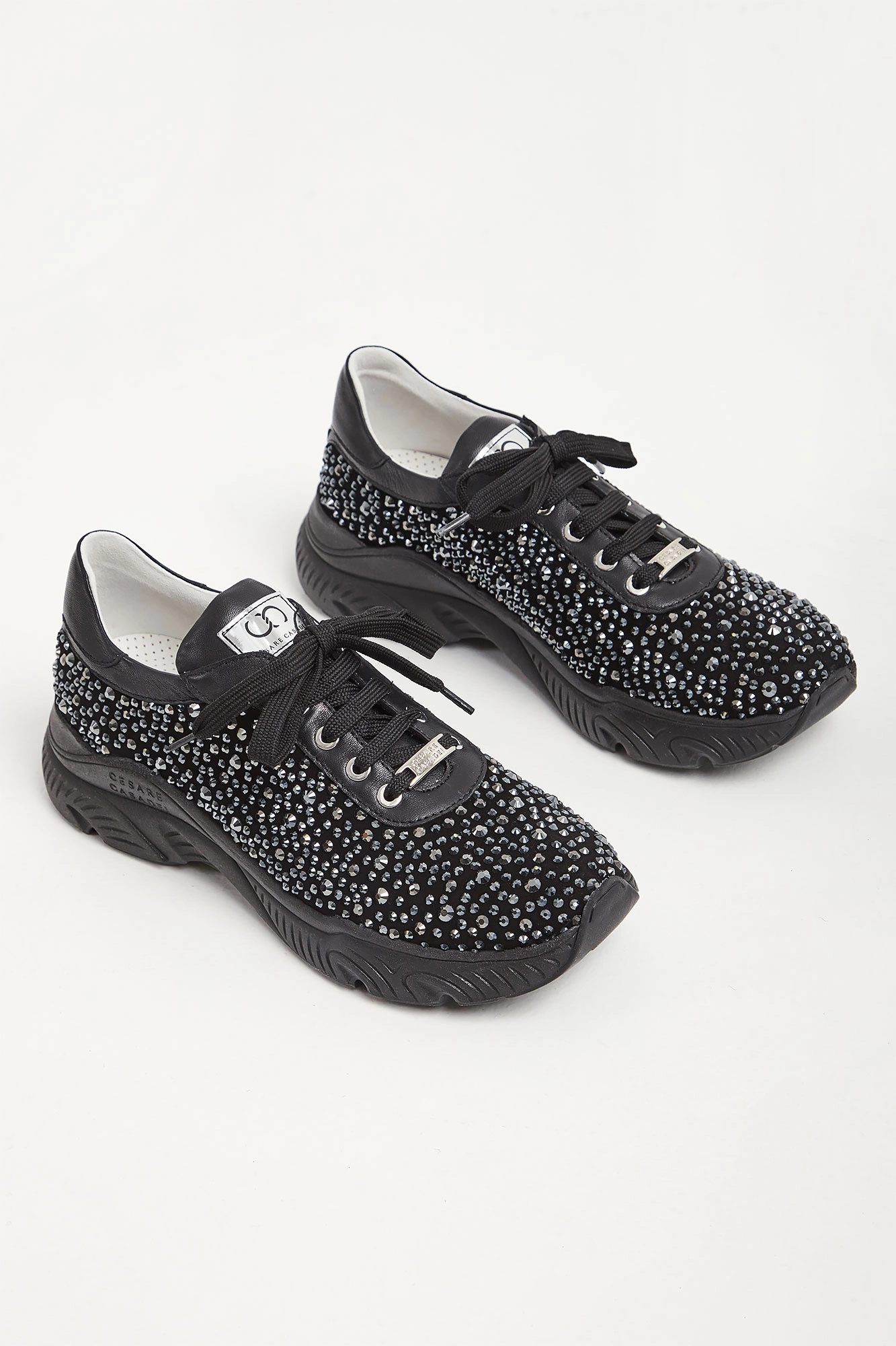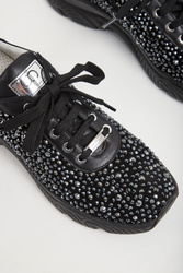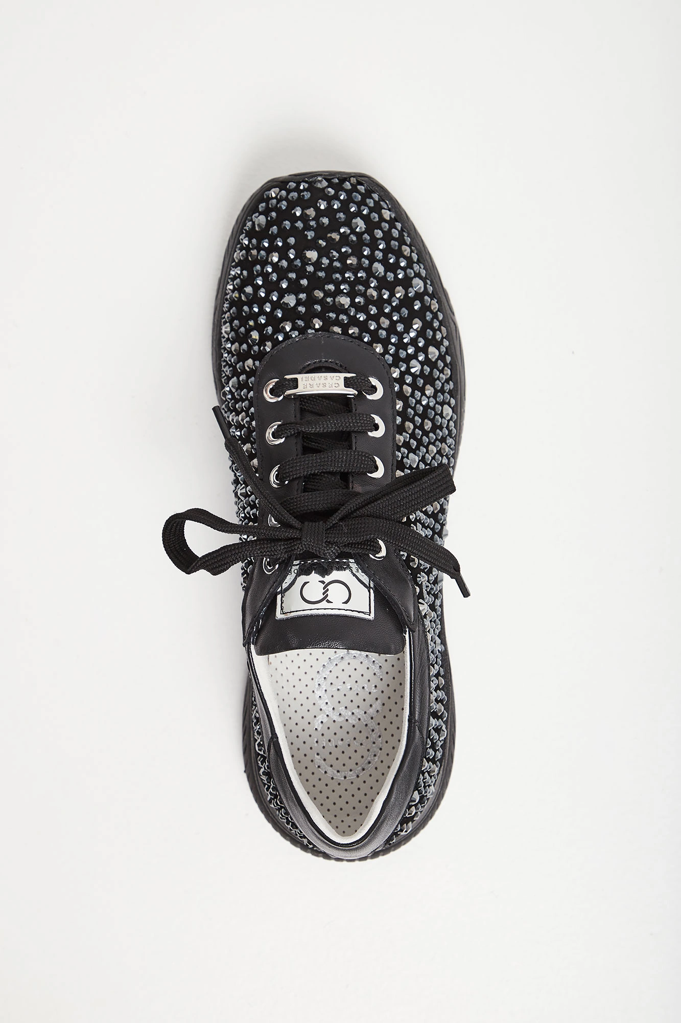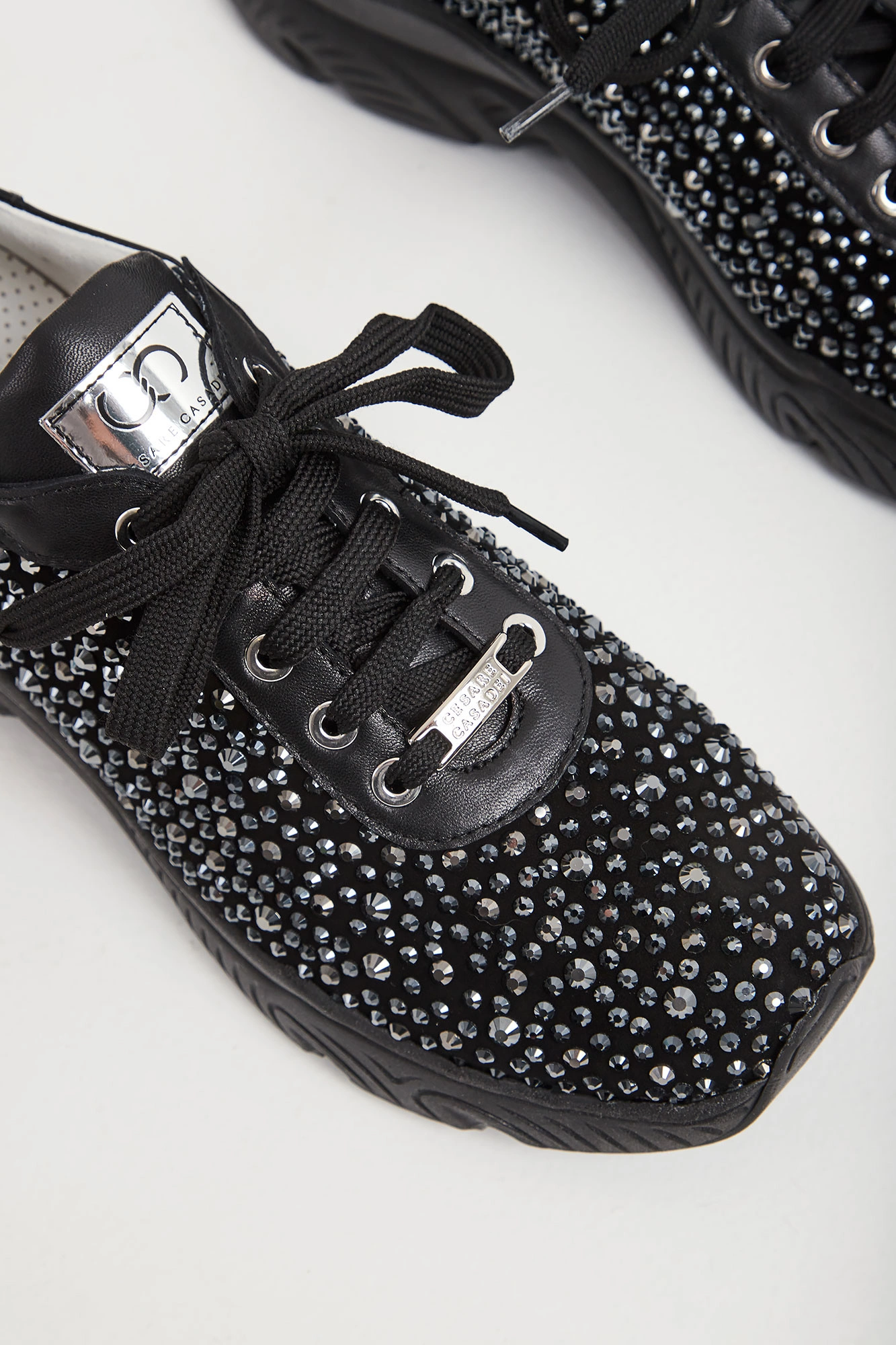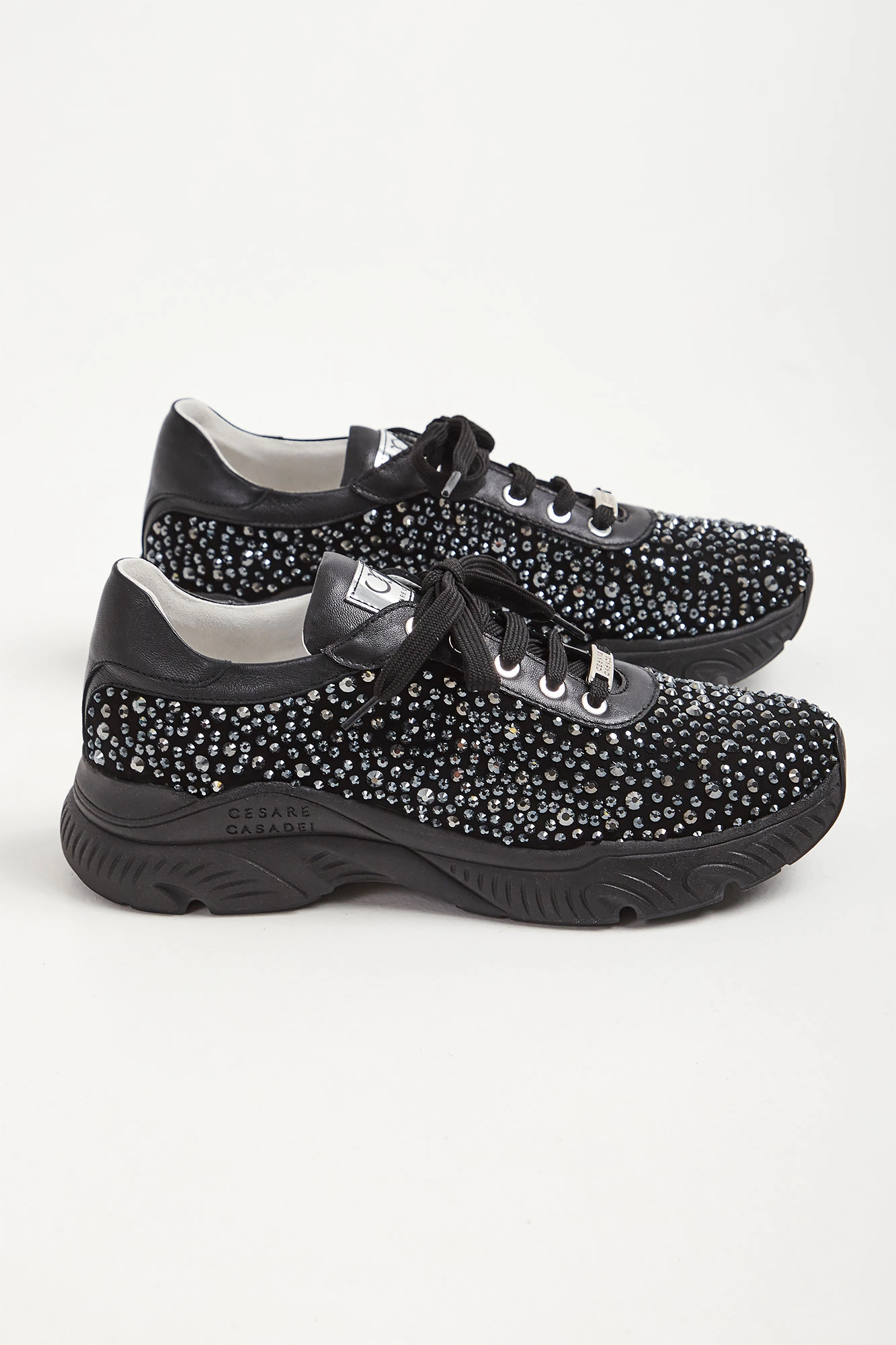 Sneakersy marki Cesare Casadei w czarnym kolorze. Na całości połyskujące kryształki w różnych rozmiarach. Wiązane za pomocą czarnych, materiałowych sznurówek. U dołu srebrna, sygnowana zawieszka. Czarna, tłoczona podeszwa. Wykonane ze skóry naturalnej.