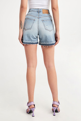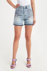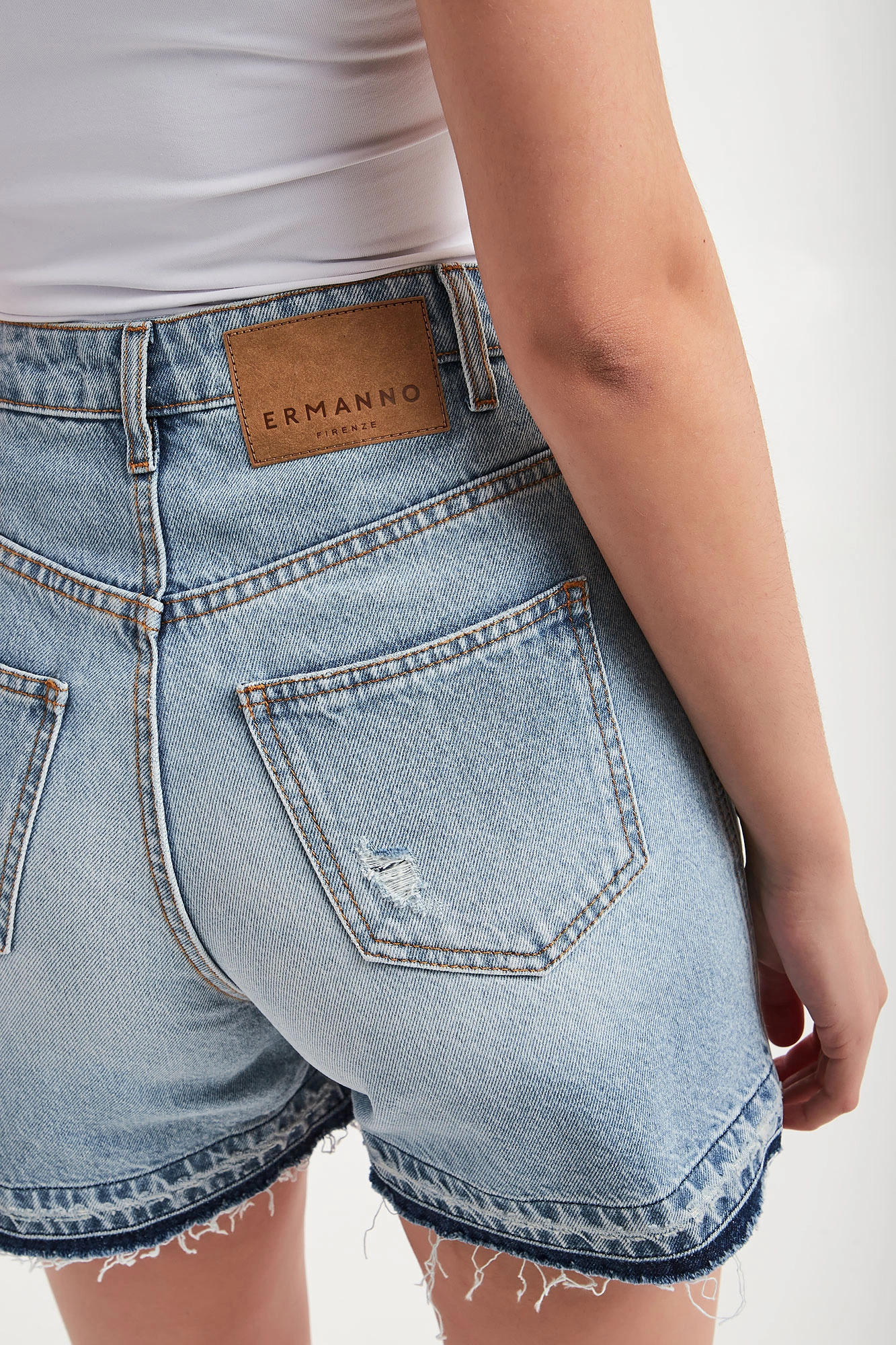 Spodenki jeansowe marki Ermanno Firenze w niebieskim kolorze. Fason typu skinny. Zapinane za pomocą sygnowanych guzików w złotym kolorze. Model z pięcioma kieszeniami. Z przodu kolorowe cyrkonie. Nogawki wykończone strzępieniem. W pasie szlufki. Z tyłu skórzana naszywka z tłoczoną nazwy marki.