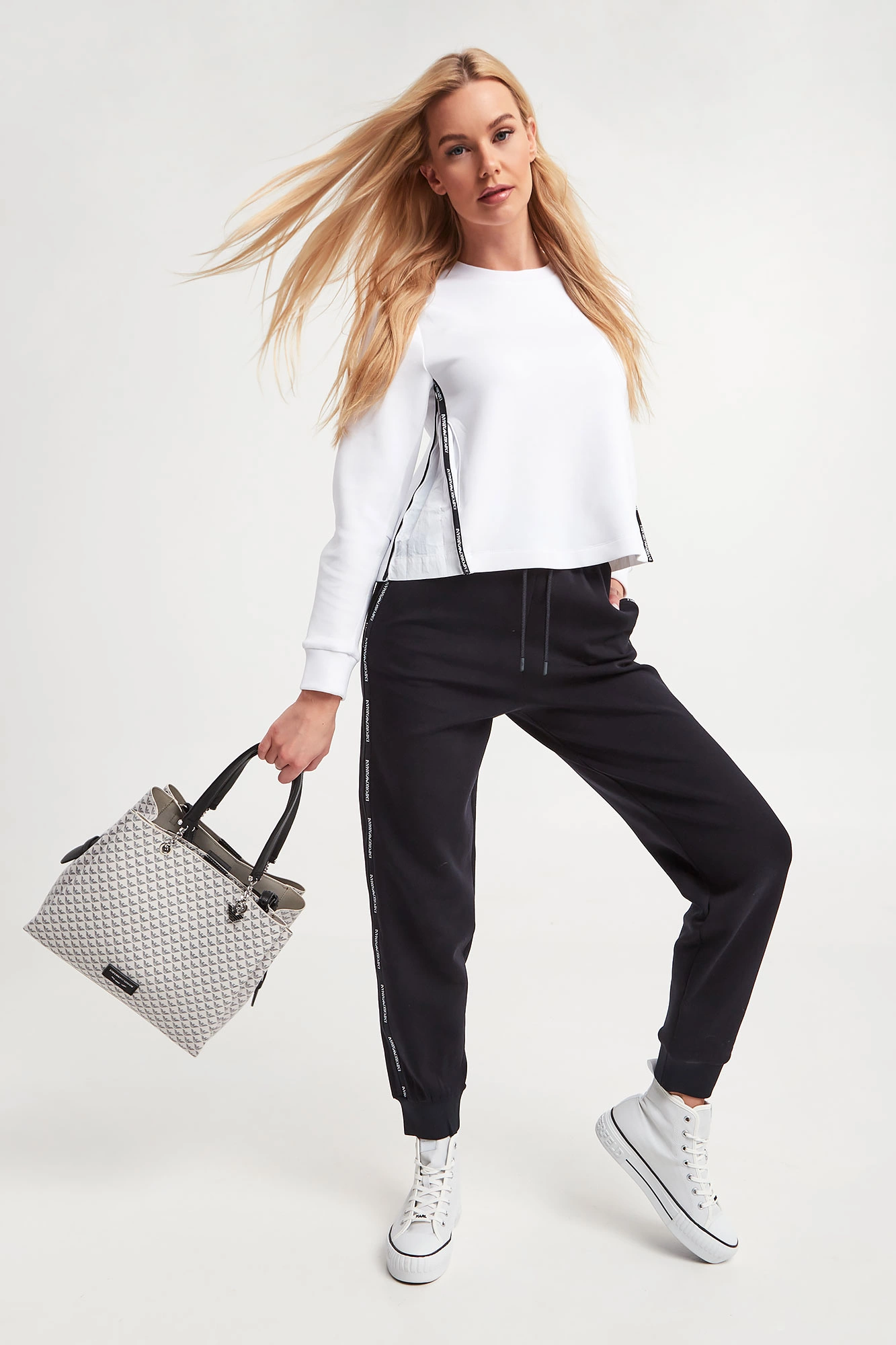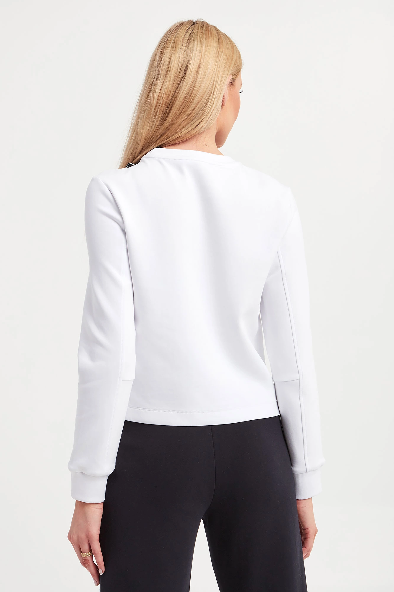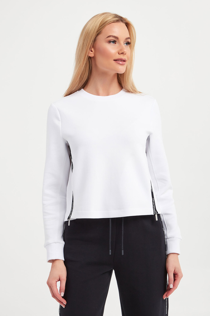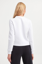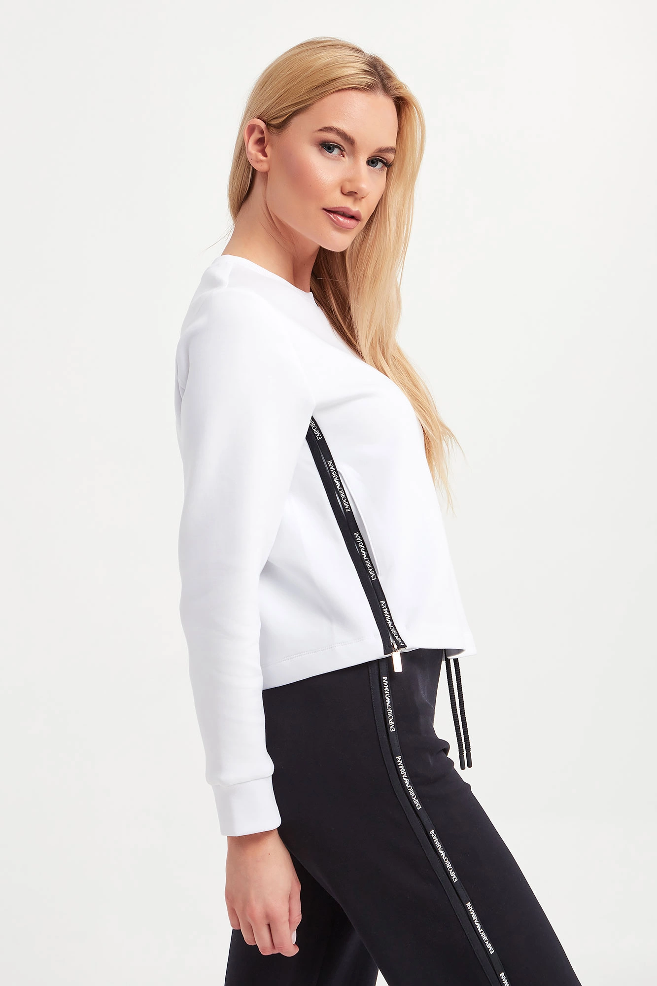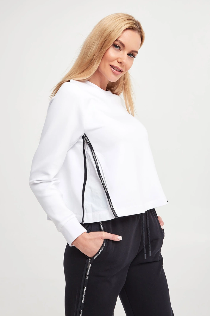 Bluza marki Emporio Armani w białym kolorze. Fason typu regular fit. Okrągły dekolt typu o-neck i długie rękawy wykończone elastycznym ściągaczem. Po bokach zamki błyskawiczne wykończone czarnym, logowanym lampasem i wpuszczane kieszenie. Wykonana z elastycznej bawełny.
