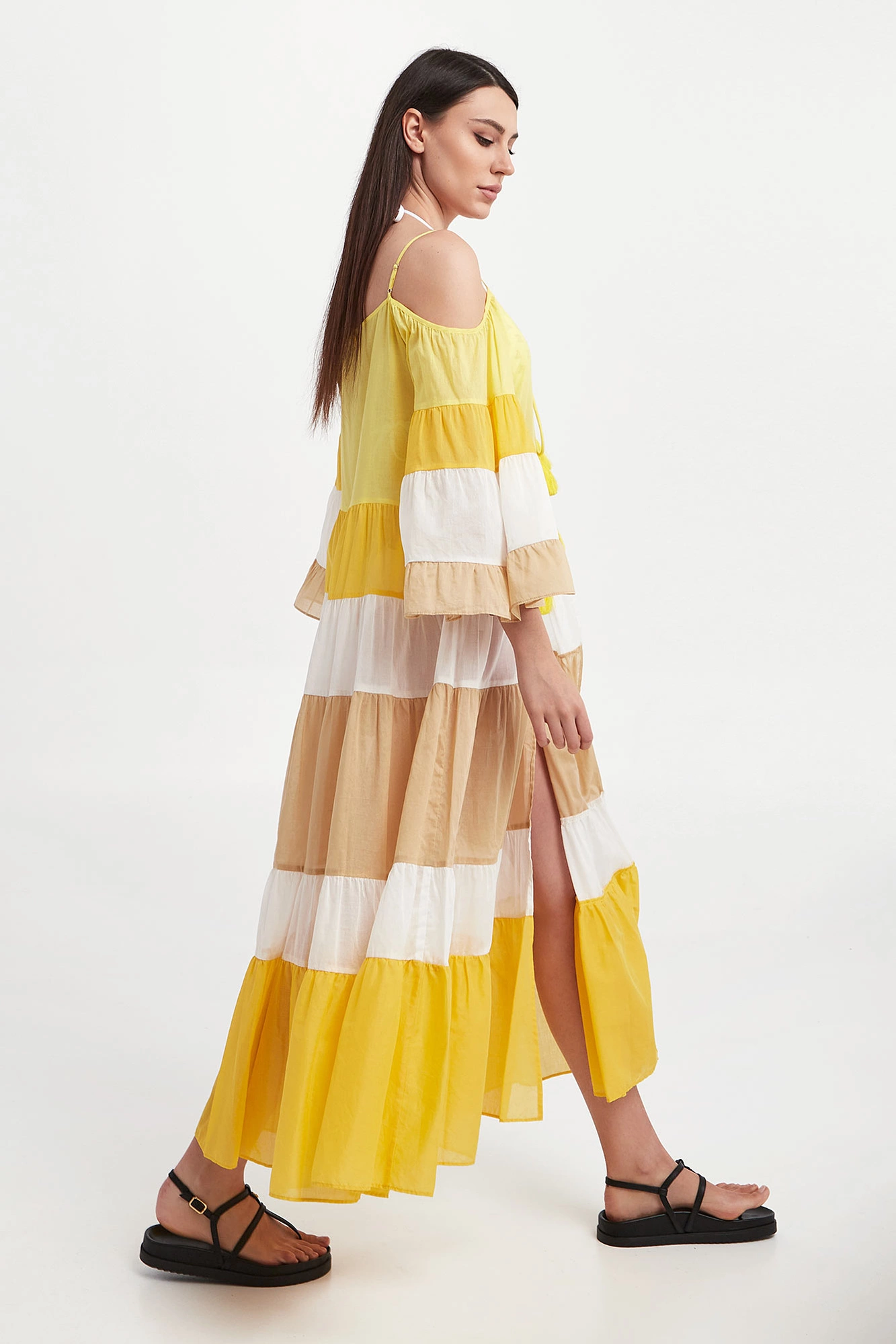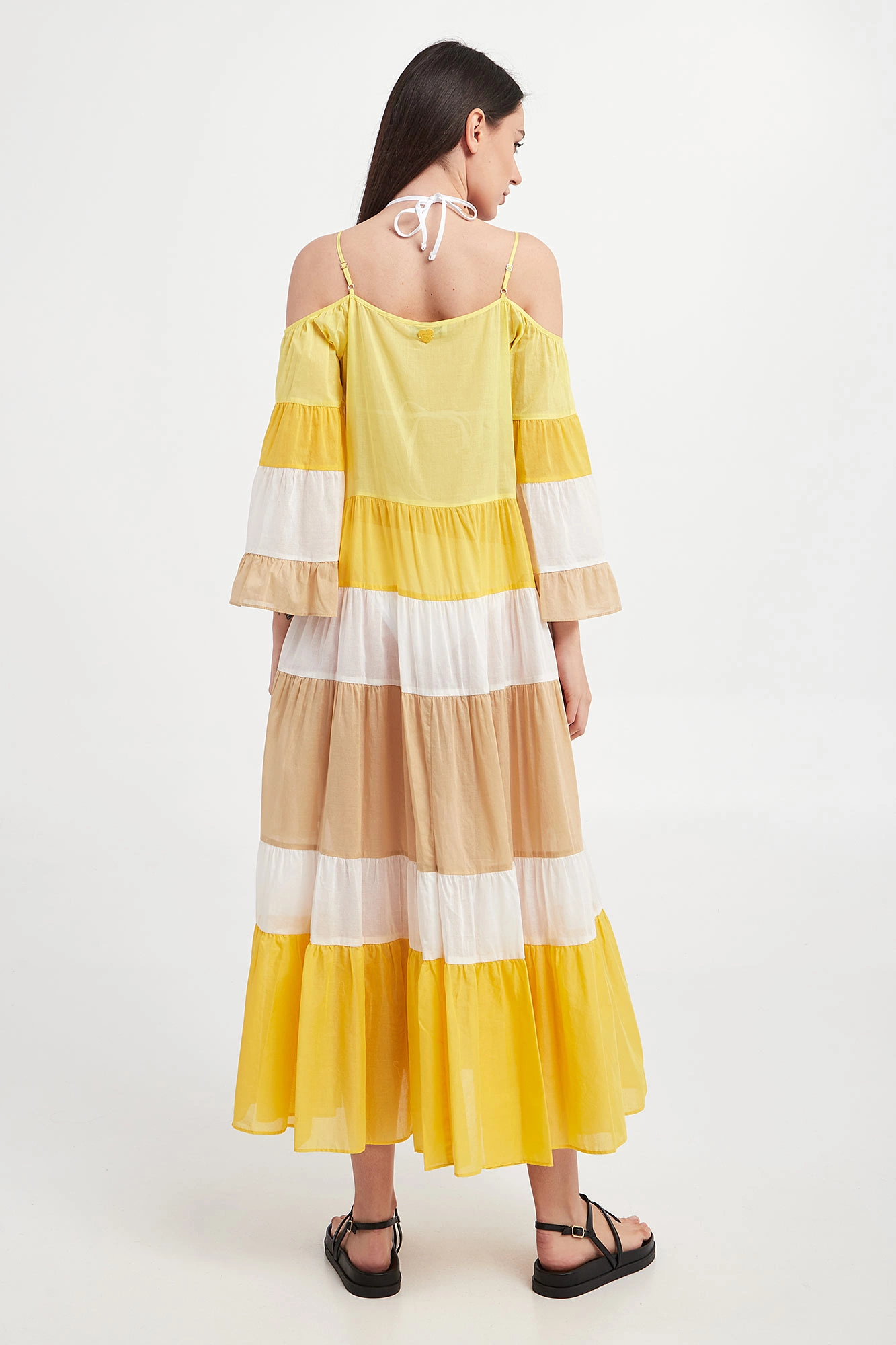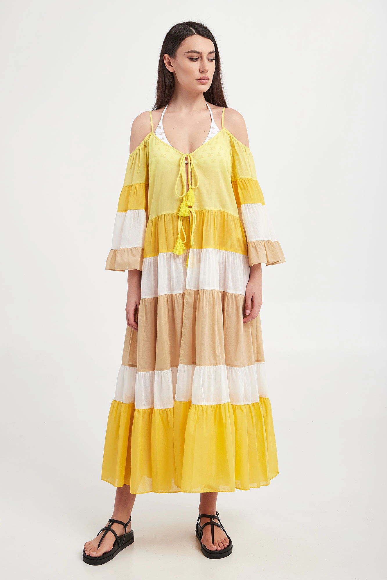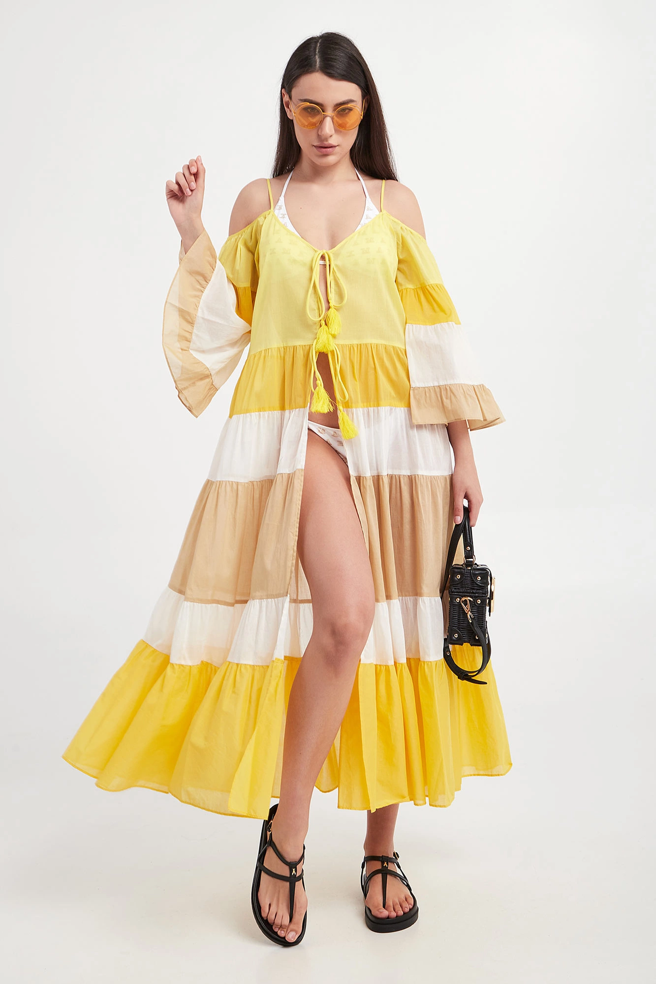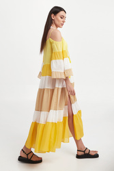 Sukienka plażowa marki Twinset U&B w żółto-biało-beżowe, poziome pasy. Fason relaxed fit, długość maxi. Wiązana z przodu za pomocą troczków z ozdobnymi chwostami. Na ramionach wycięcia. Cienkie ramiączka regulowane. Rękawy o długości 3/4 i dół wykończone falbaną. Wykonana z czystej bawełny.