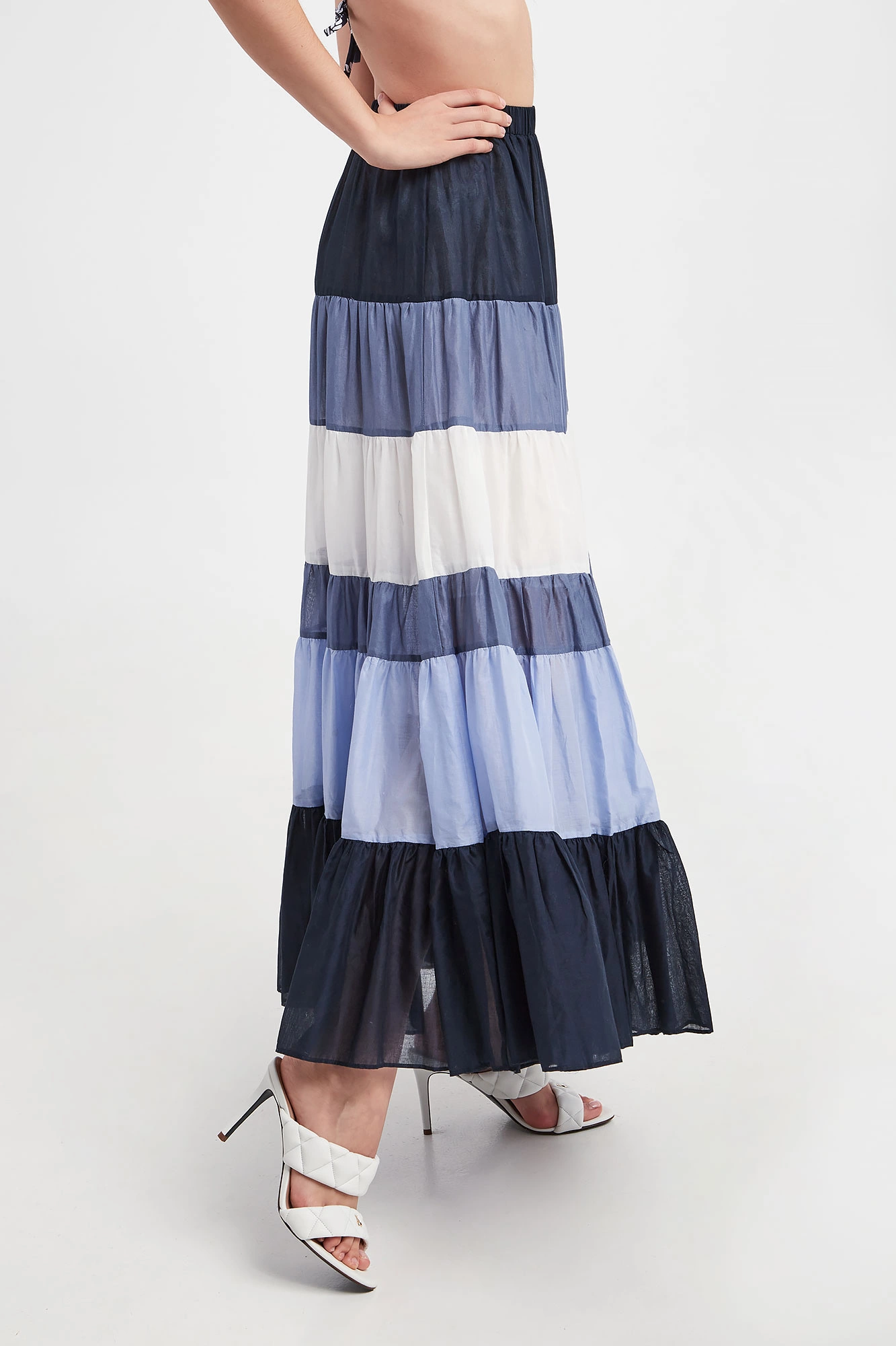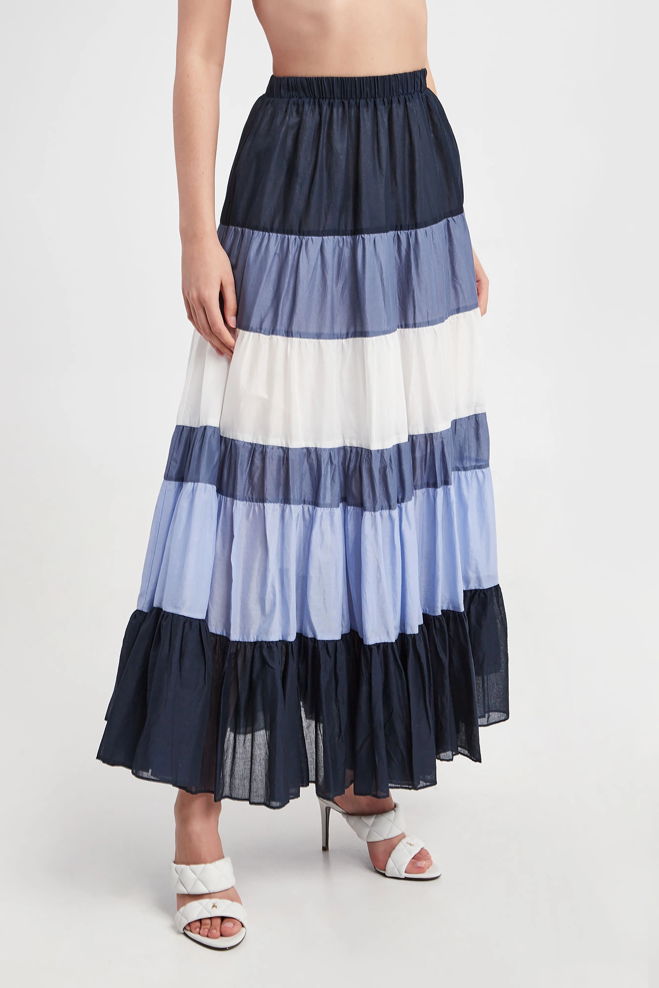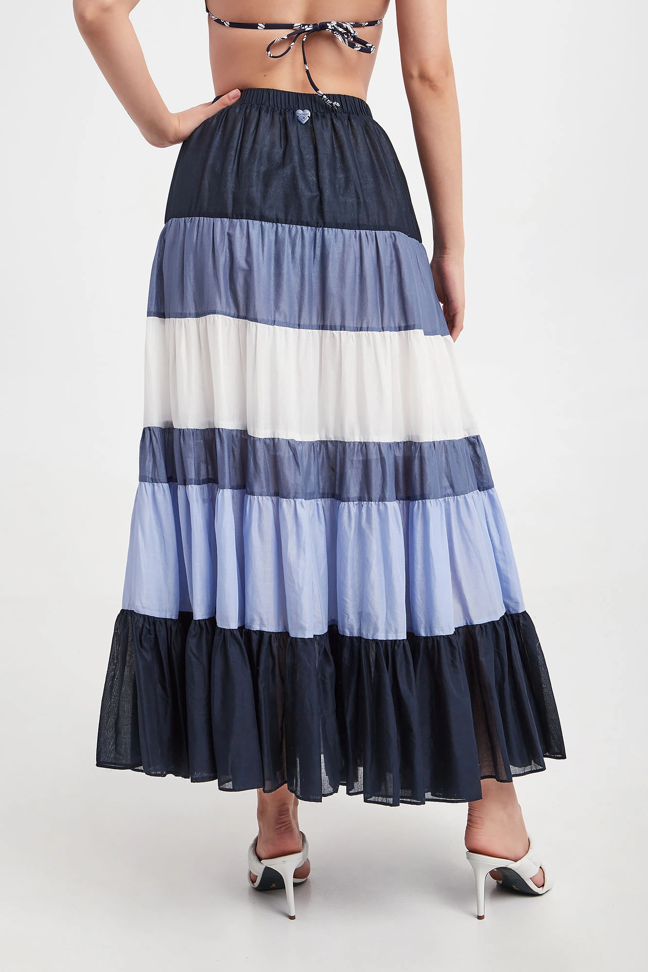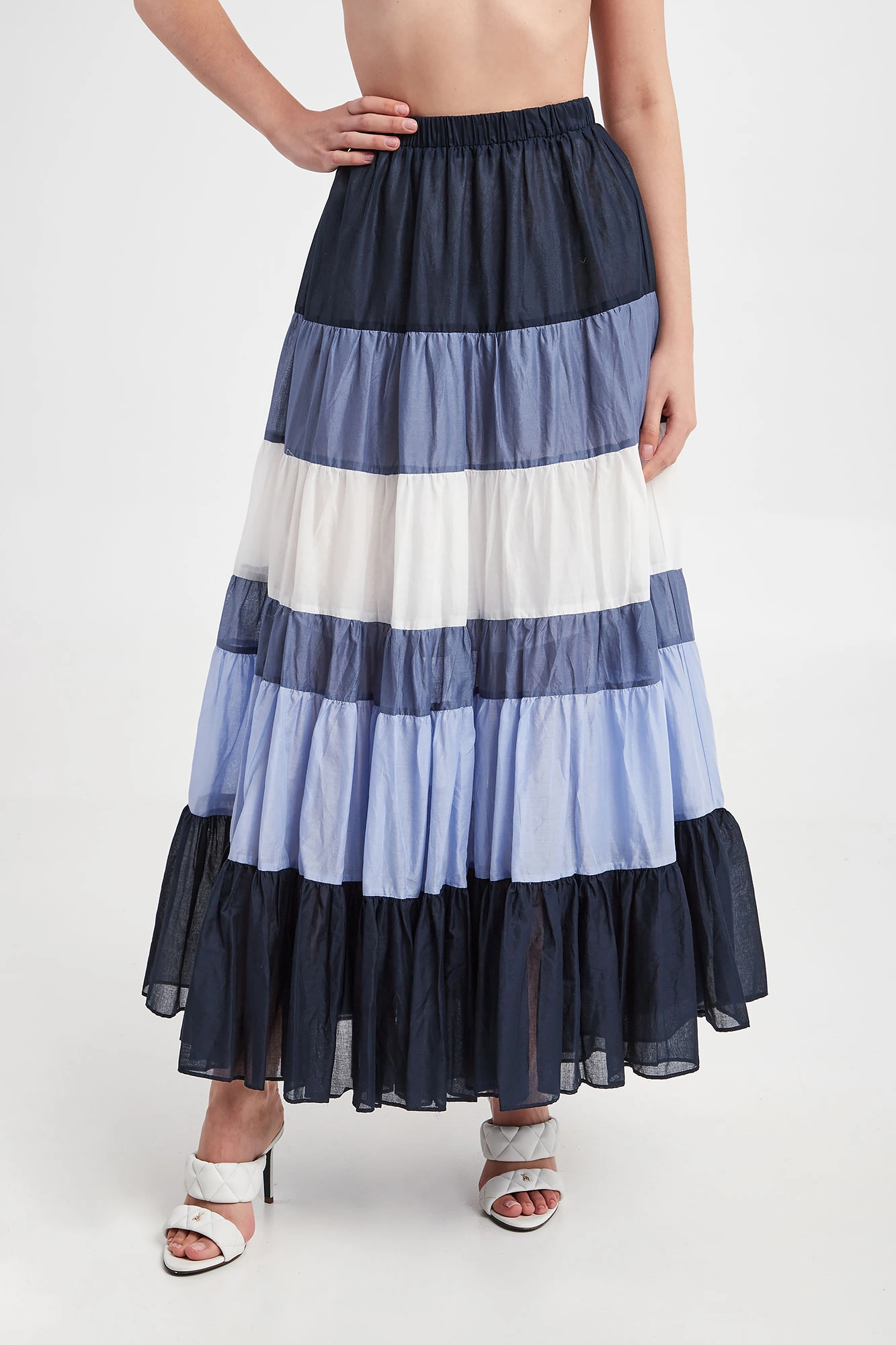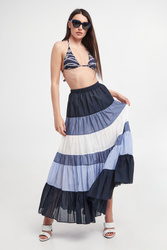 Spódnica marki Twinset U&B w niebiesko-biało-granatowe, poziome pasy. Fason regular fit, długość midi. W pasie elastyczny ściągacz. Dół wykończony falbaną. Z tyłu złota zawieszka w kształcie serca sygnowana logo marki. Biała podszewka. Wykonana z czystej bawełny. Lekka i zwiewna.