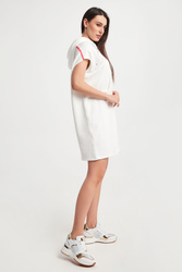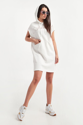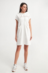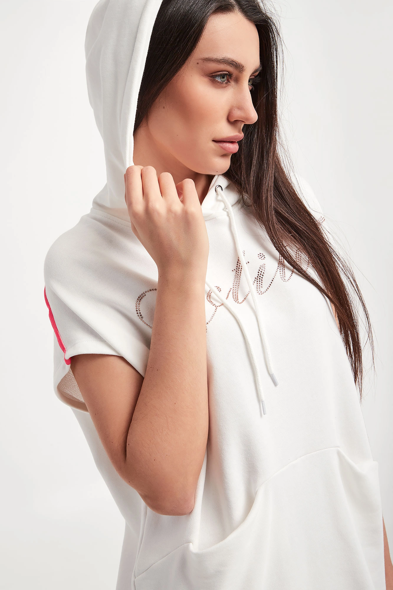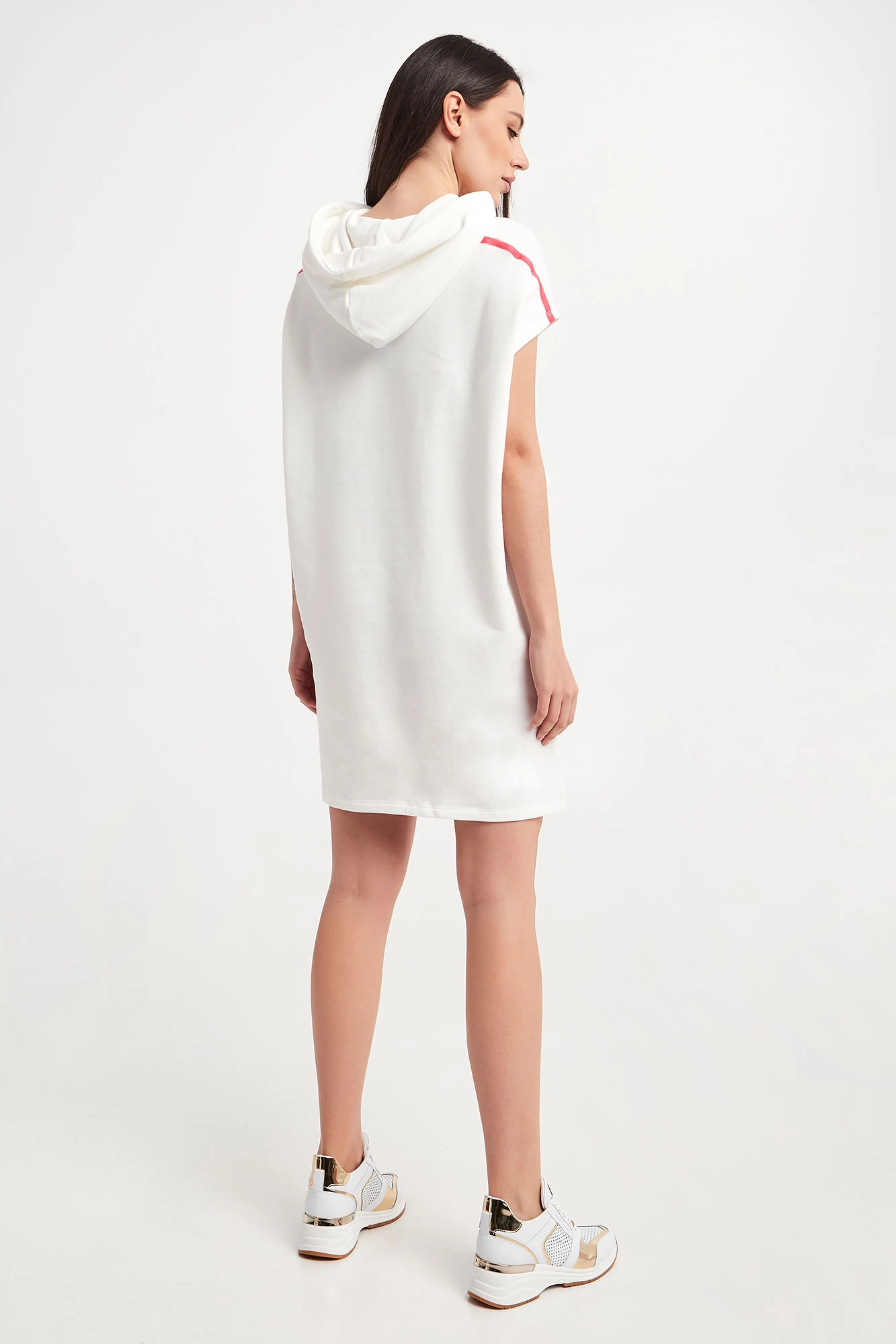 Sukienka marki Twinset Actitude w białym kolorze. Fason typu relaxed o długości midi. Z kapturem regulowanym za pomocą troczków. Z przodu dwie kieszenie i nazwa marki wykonana z połyskujących, różowych cyrkonii. Na ramionach lampasy w różowym kolorze. Obniżona linia ramion. Wykonana z elastycznej bawełny.
