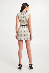 Sukienka marki Elisabetta Franchi w beżowym kolorze. Na całości czarny wzór z logo. Fason slim fit, długość mini. Bez rękawów. Dekolt typu o-neck zakończony lamówką. Z przodu ozdobne, złote, sygnowane guziki, patki oraz zamykane kieszenie. Dodatkowo czarny pasek. Zapinana za pomocą tylnego zamka.