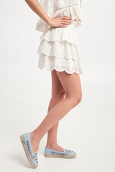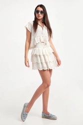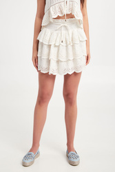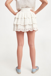 Spódnica marki Patrizia Pepe w kolorze złamanej bieli. Fason typu regular fit o długości mini. W pasie szeroki, elastyczny ściągacz. U dołu falbany ozdobione ażurowym haftem. W zestawie cienki pasek zakończony złotą aplikacja w postaci logo marki. Od wewnątrz podszewka.