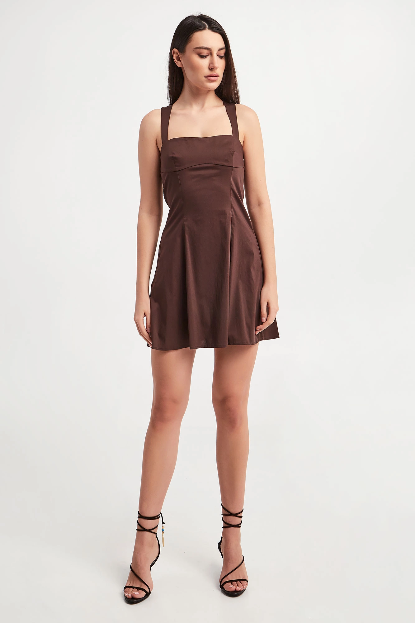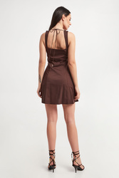 Sukienka marki Patrizia Pepe w brązowym kolorze. Fason slim fit, długość mini. Dół rozkloszowany. Bez rękawów. Po bokach zapinana za pomocą zamka błyskawicznego. Z tyłu odkryte plecy i wiązanie za pomocą troczków zakończonych metalowym, złotym logo marki. Wykonana z tkaniny bawełnianej.