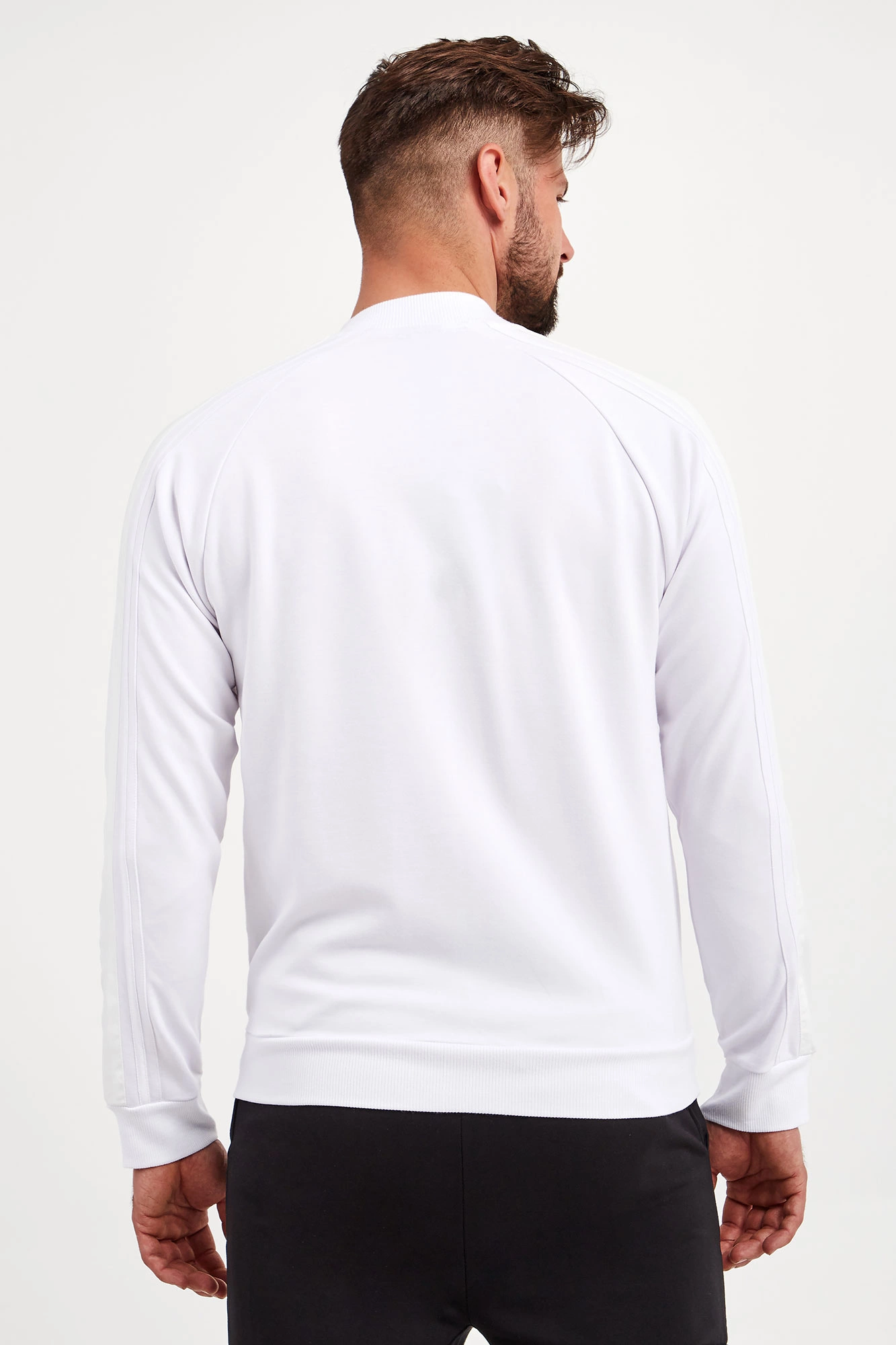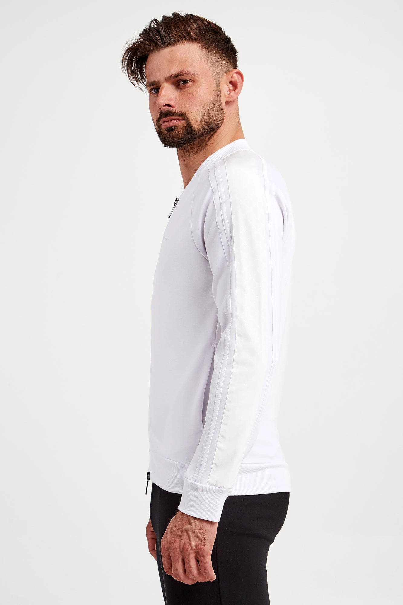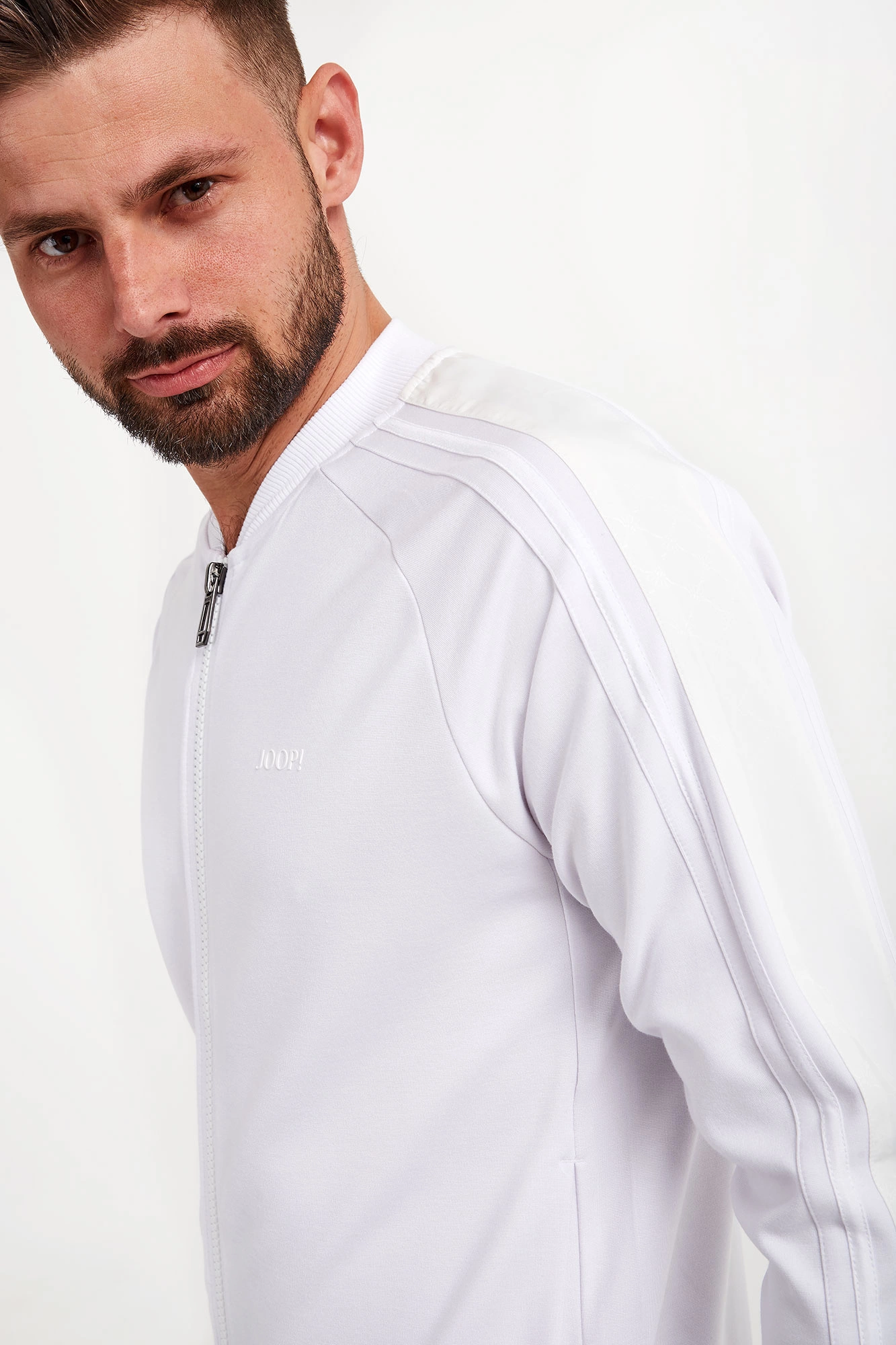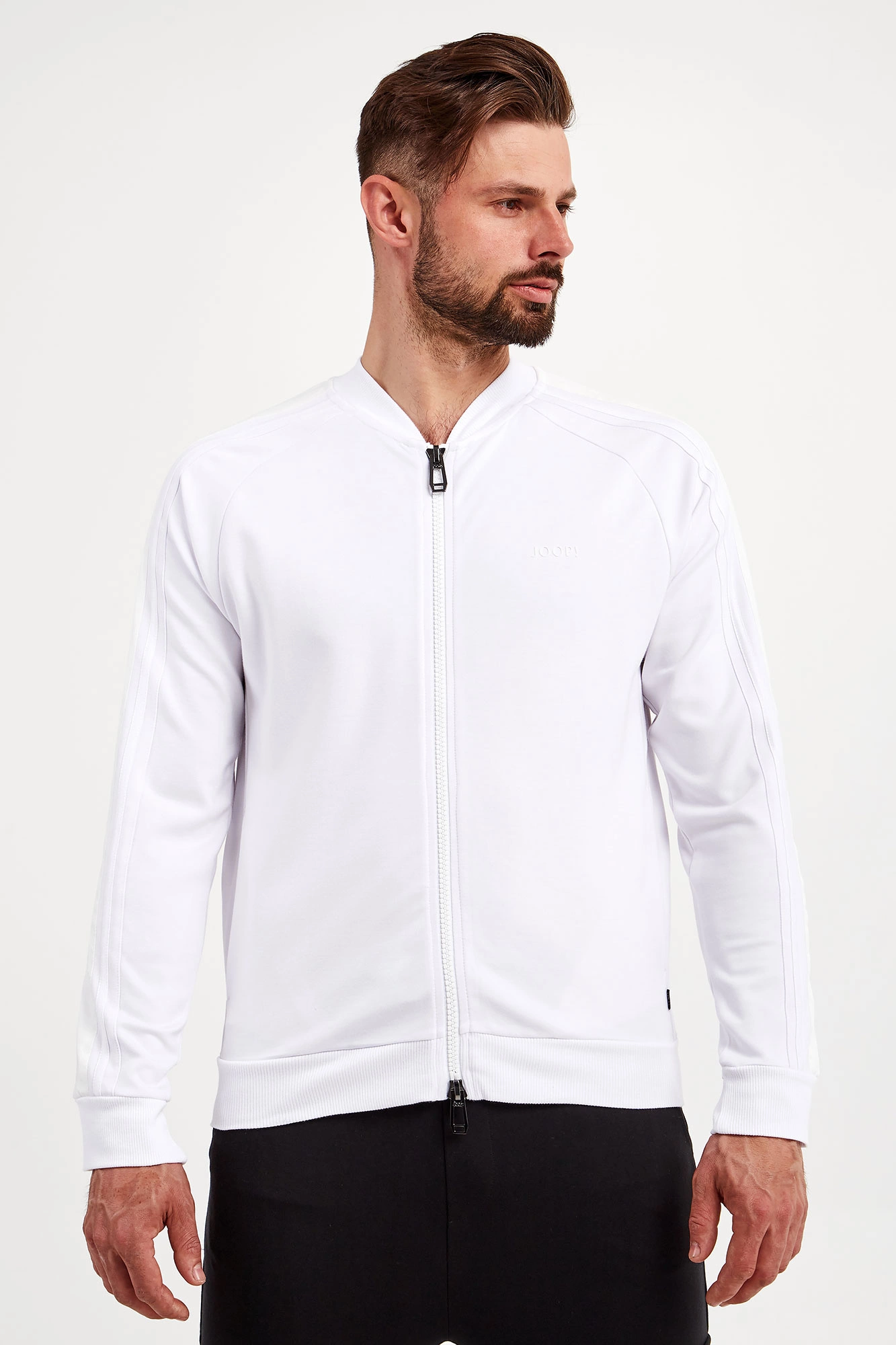 Bluza marki Joop! w białym kolorze. Fason regular fit. Dekolt, długie rękawy i dół wykończone elastycznym ściągaczem. Na rękawach sygnowane lampasy w kolorze złamanej bieli. Zapinana za pomocą dwukierunkowego zamka. Model z dwoma kieszeniami. Z przodu gumowana naszywka z nazwą marki. Wykonana z elastycznej wiskozy.