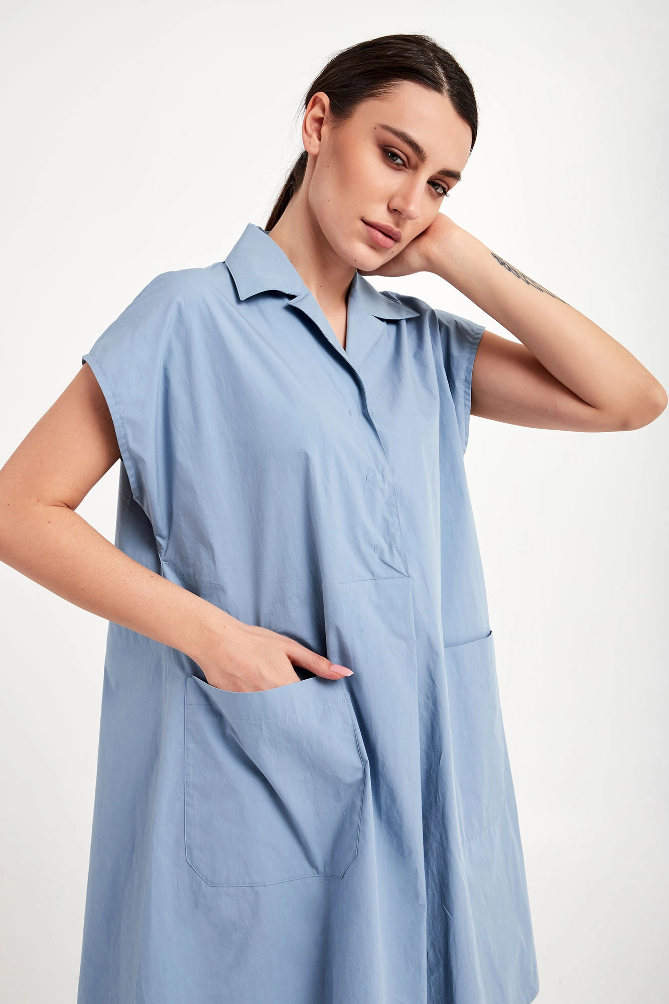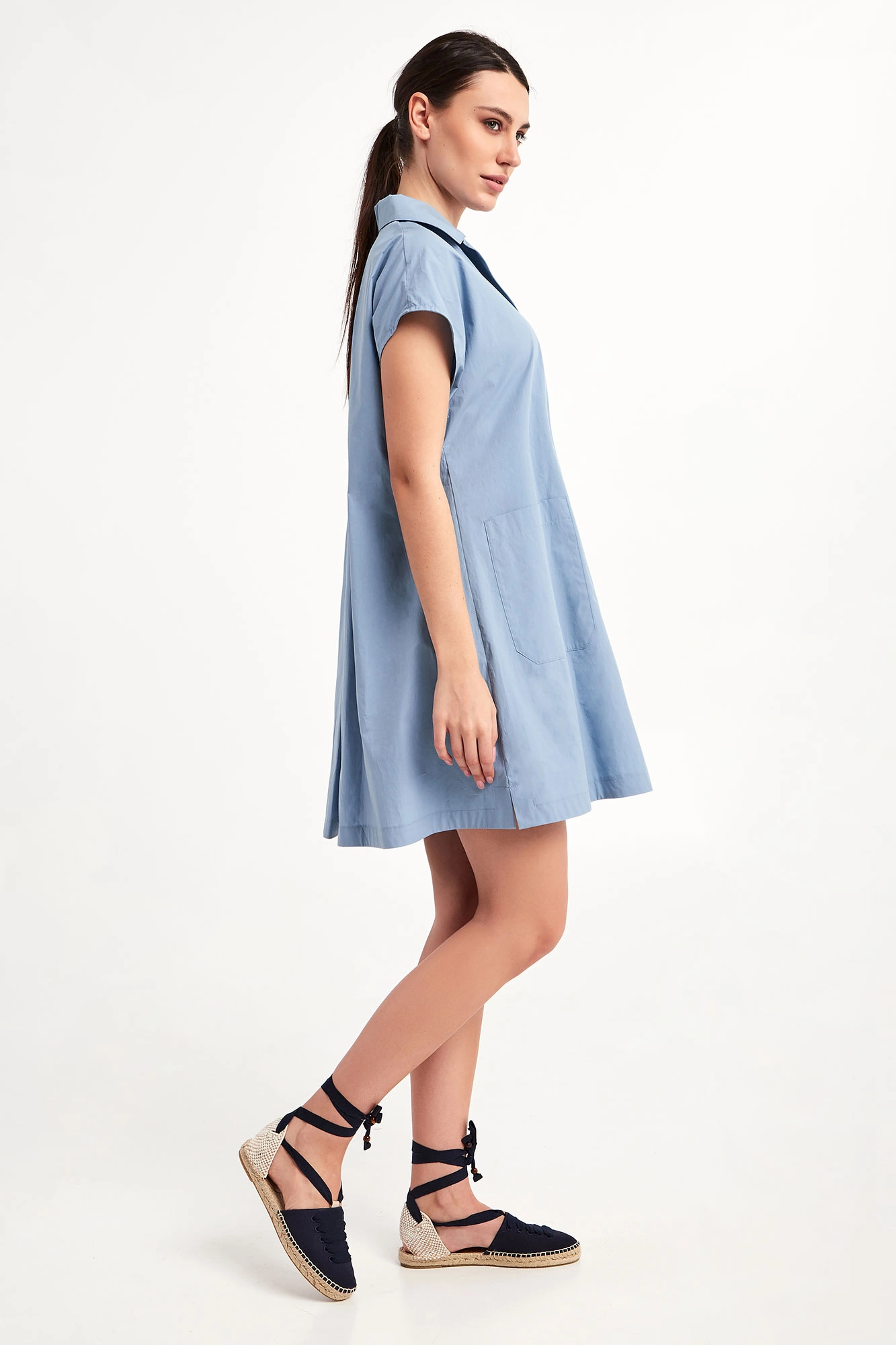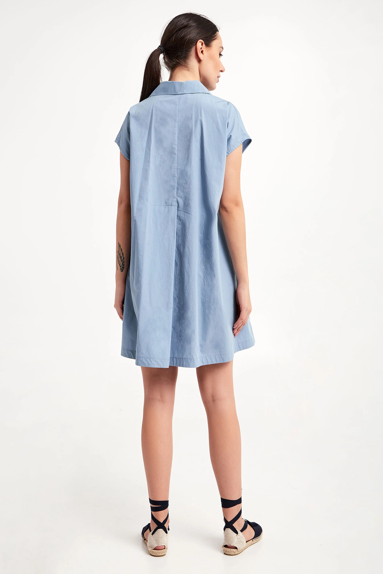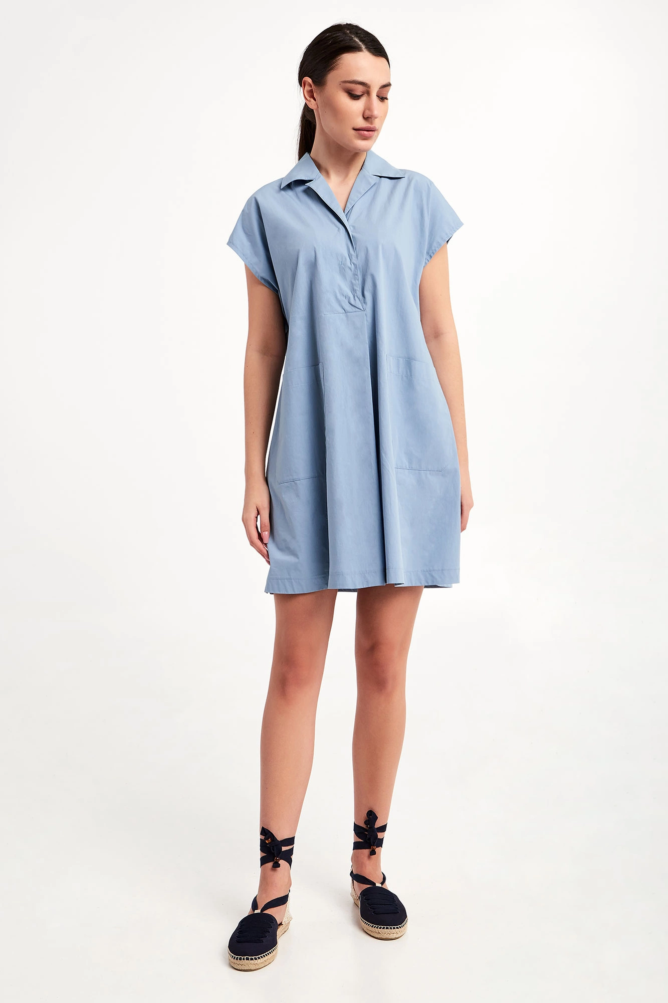 Sukienka marki Weekend Max Mara w niebieskim kolorze. Prosty fason regular fit, długość mini. Dekolt typu v-neck zapinany na sygnowane guziki i zakończony kołnierzykiem. Krótkie rękawy wykończone lamówką. Z przodu dwie kieszonki. Z tyłu i z przodu przeszyta zakładka. Dół wykończony lamówką. Wykonana z czystej bawełny.