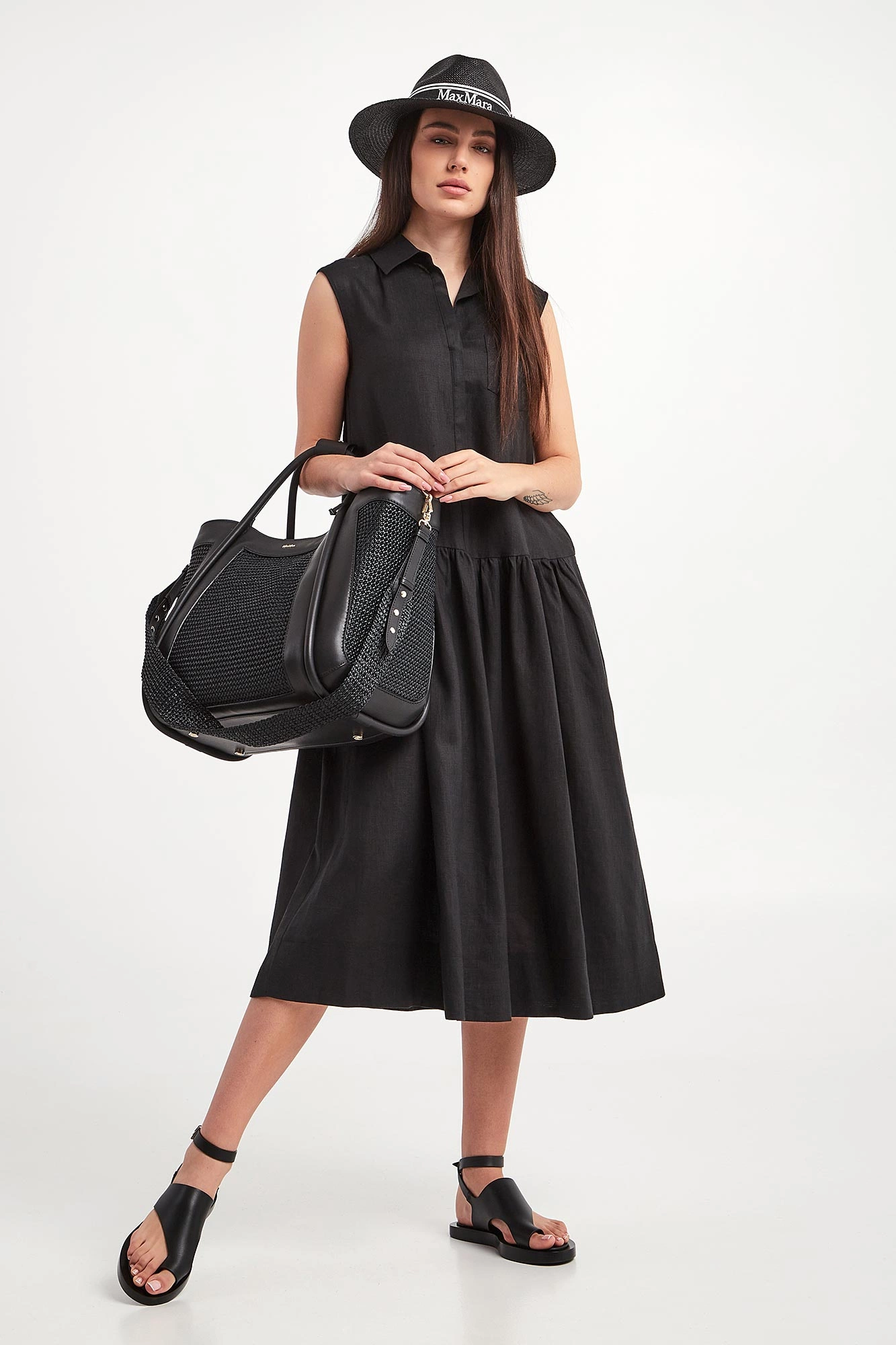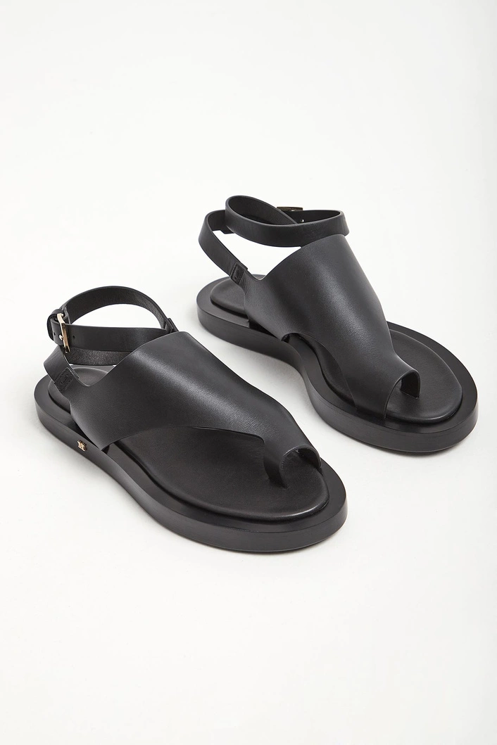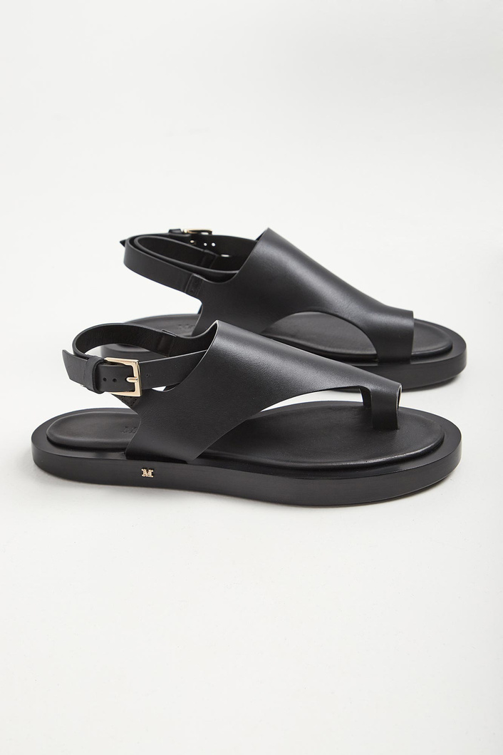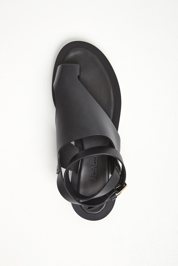 Sandały marki Max Mara Accessori w czarnym kolorze. Japonki. Na stopie szeroki pasek. Zapinane za pomocą bocznego, złotego zapięcia. Z boku niewielki, złoty monogram. Podeszwa tłoczona oraz sygnowana. Wykonane ze skóry naturalnej.