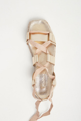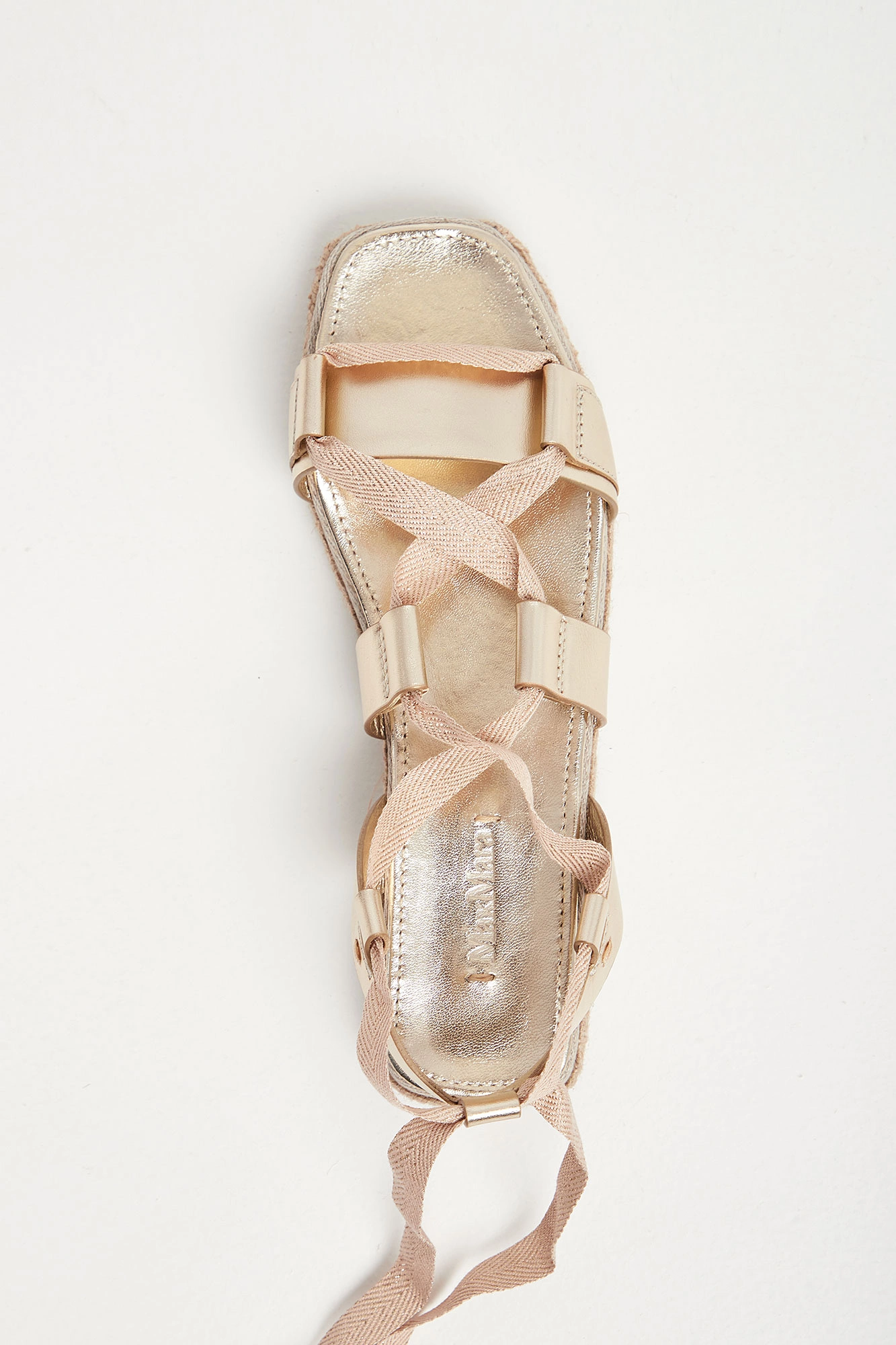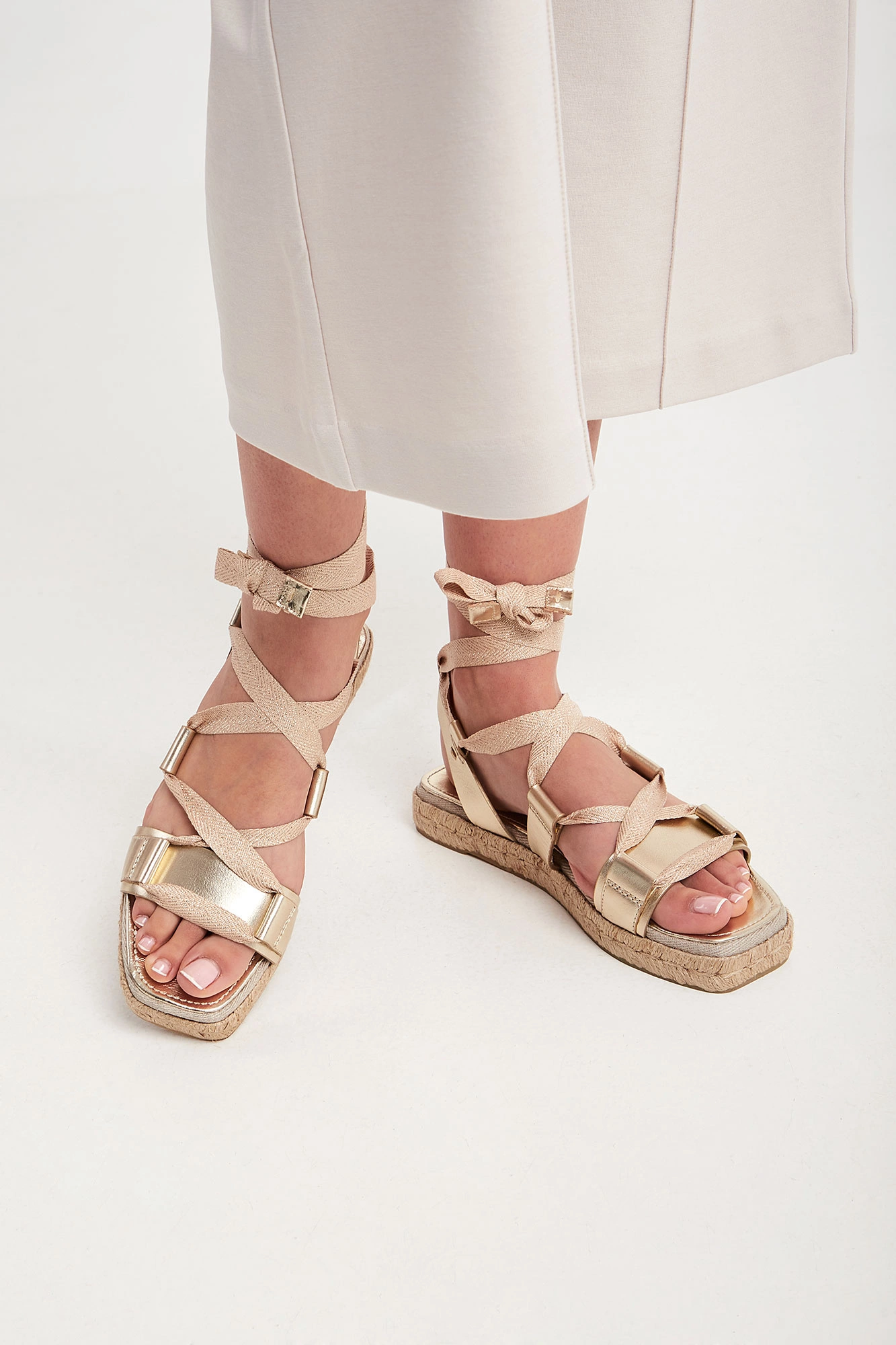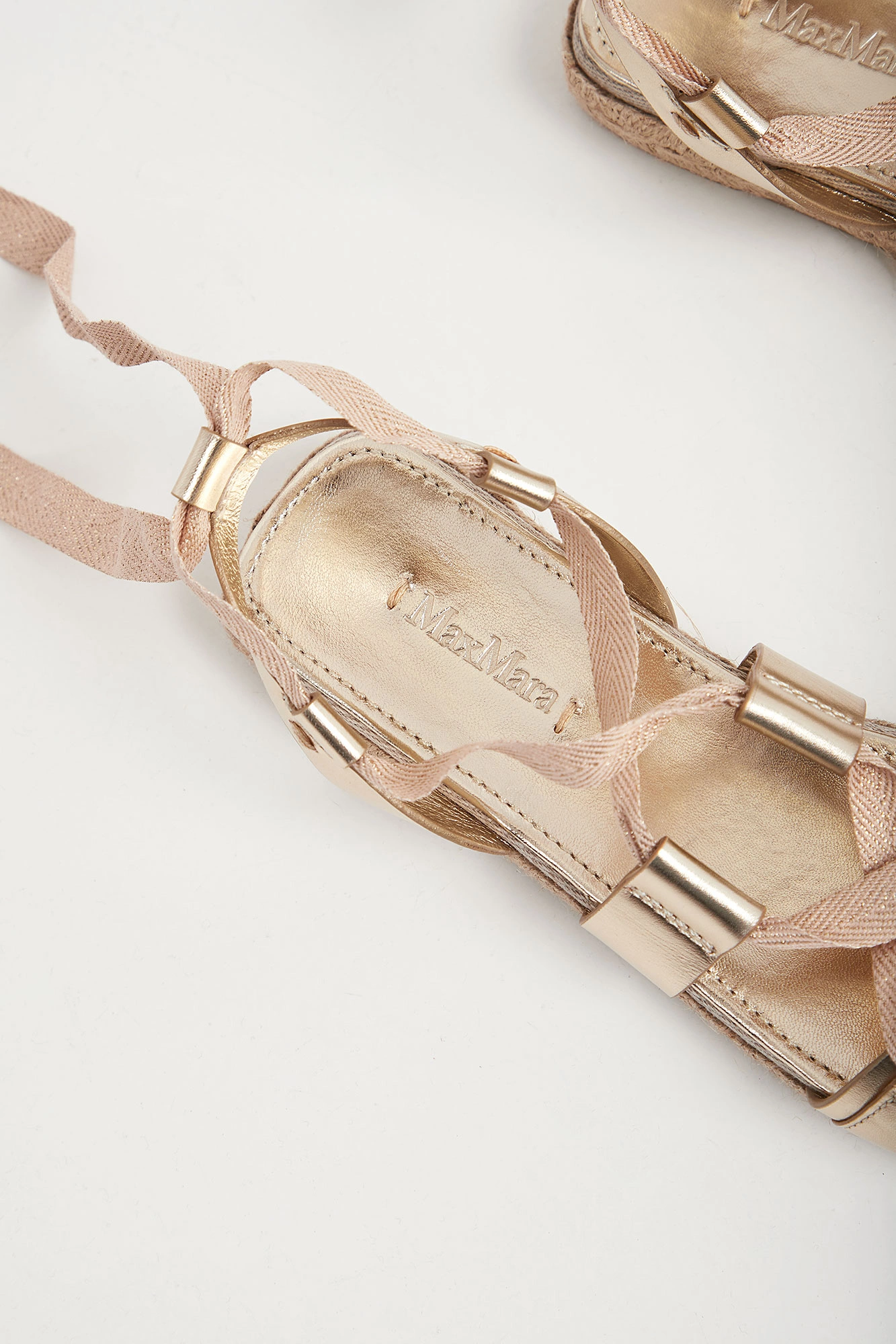 Espadryle marki Max Mara Accessori w złotym kolorze. Wiązane za pomocą beżowych, brokatowych troczków. Z przodu szerokie paski. Podeszwa wykończona plecioną, słomianą tkaniną. Tłoczona podeszwa. Wykonane ze skóry naturalnej.