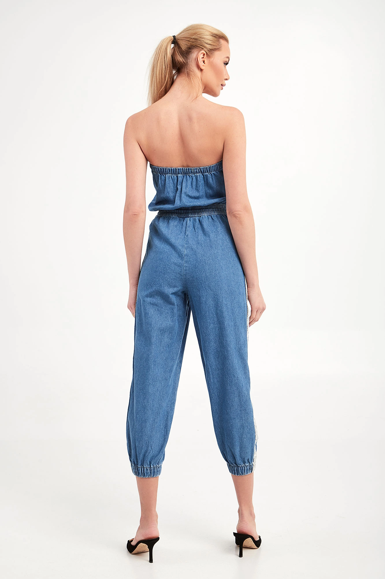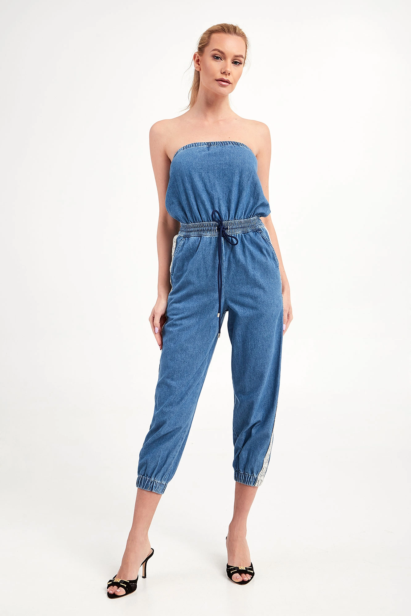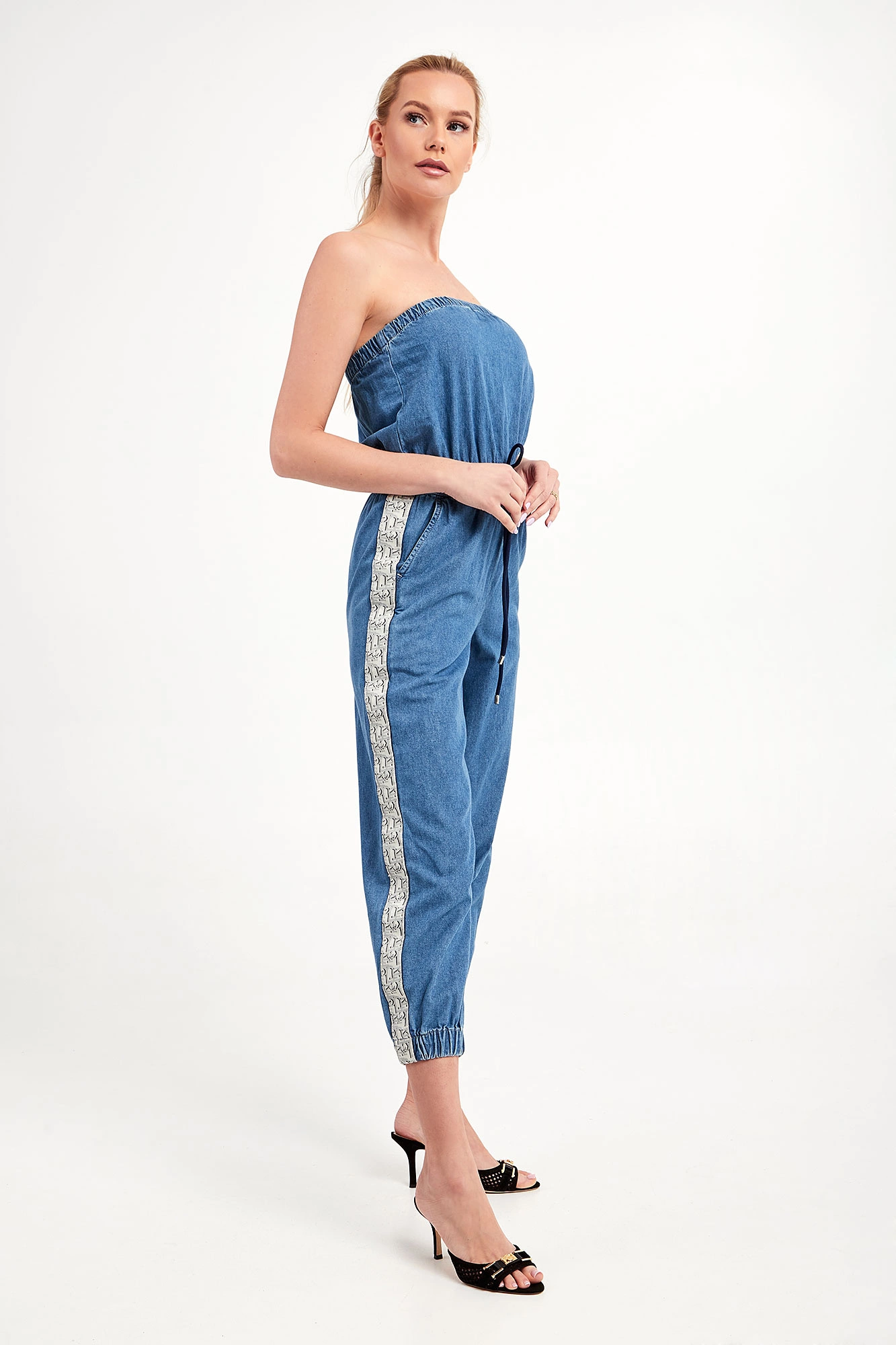 Jeansowy kombinezon marki Pinko w niebieskim kolorze. Fason slim fit. Bez rękawów. U góry ściągacz. Po bokach nogawek beżowe, logowane lampasy. W pasie ściągacz regulowany za pomocą granatowych troczków ze srebrnymi stoperami. Dwie boczne, wpuszczane kieszenie. Nogawki typu baloon zakończone ściągaczami. Wykonany z czystej bawełny.