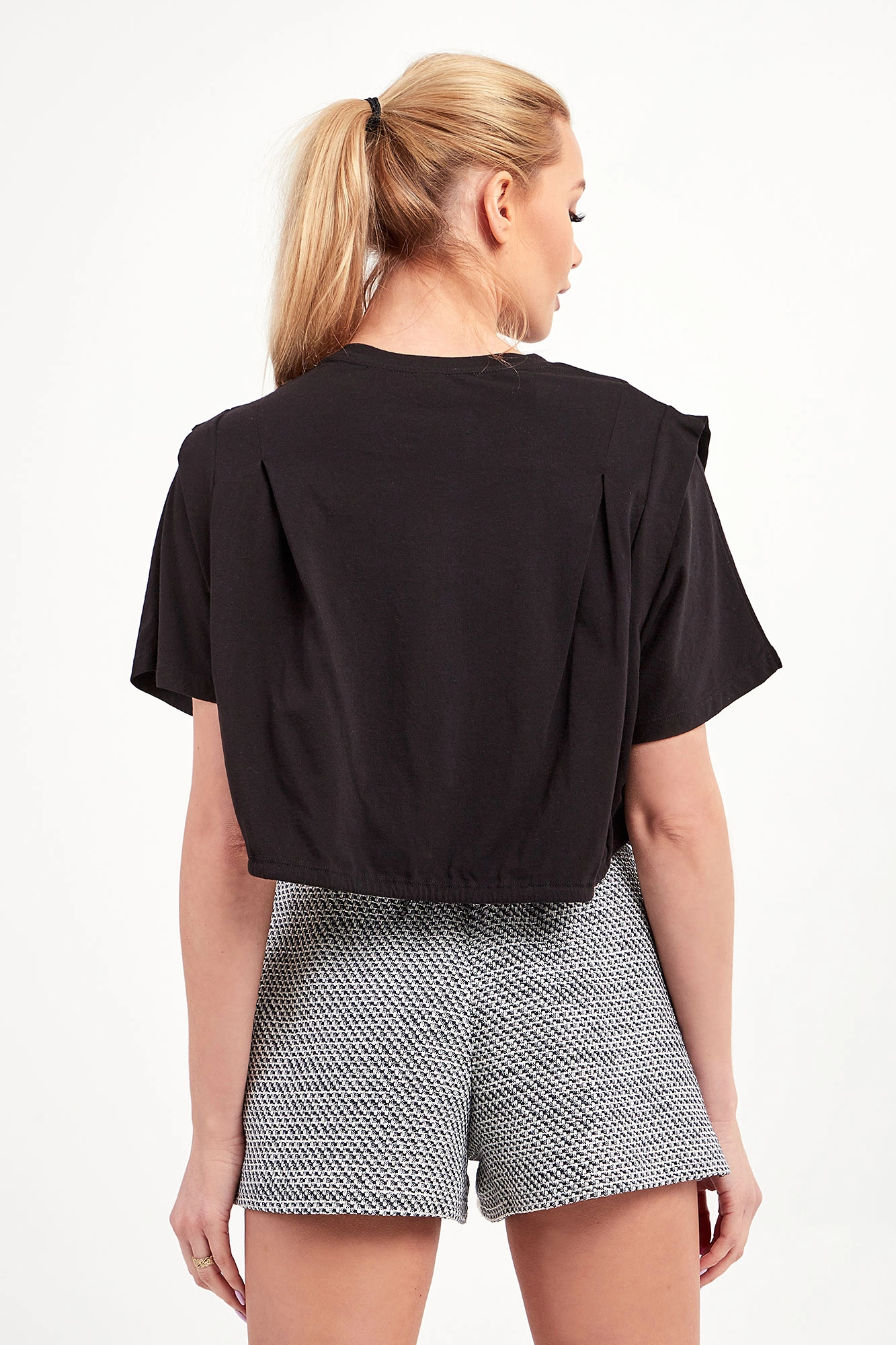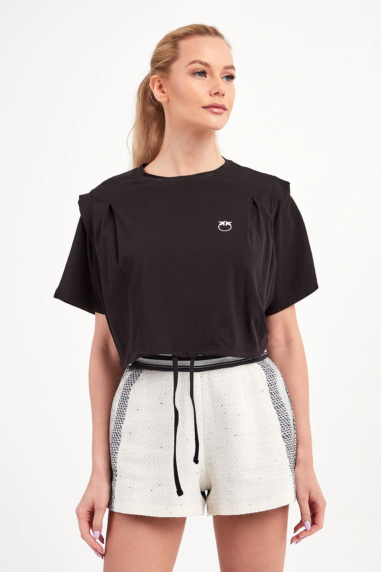 T-shirt marki Pinko w czarnym kolorze. Crop top. Wiązany u dołu za pomocą troczków. Z boku charakterystyczne, białe, haftowane logo "Love Birds". Dekolt typu o-neck zakończony ściągaczem. Na ramionach zakładki. Krótkie rękawy wykończone lamówką. Wykonany z czystej bawełny.