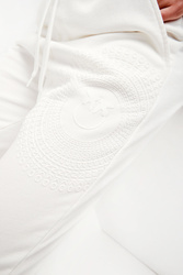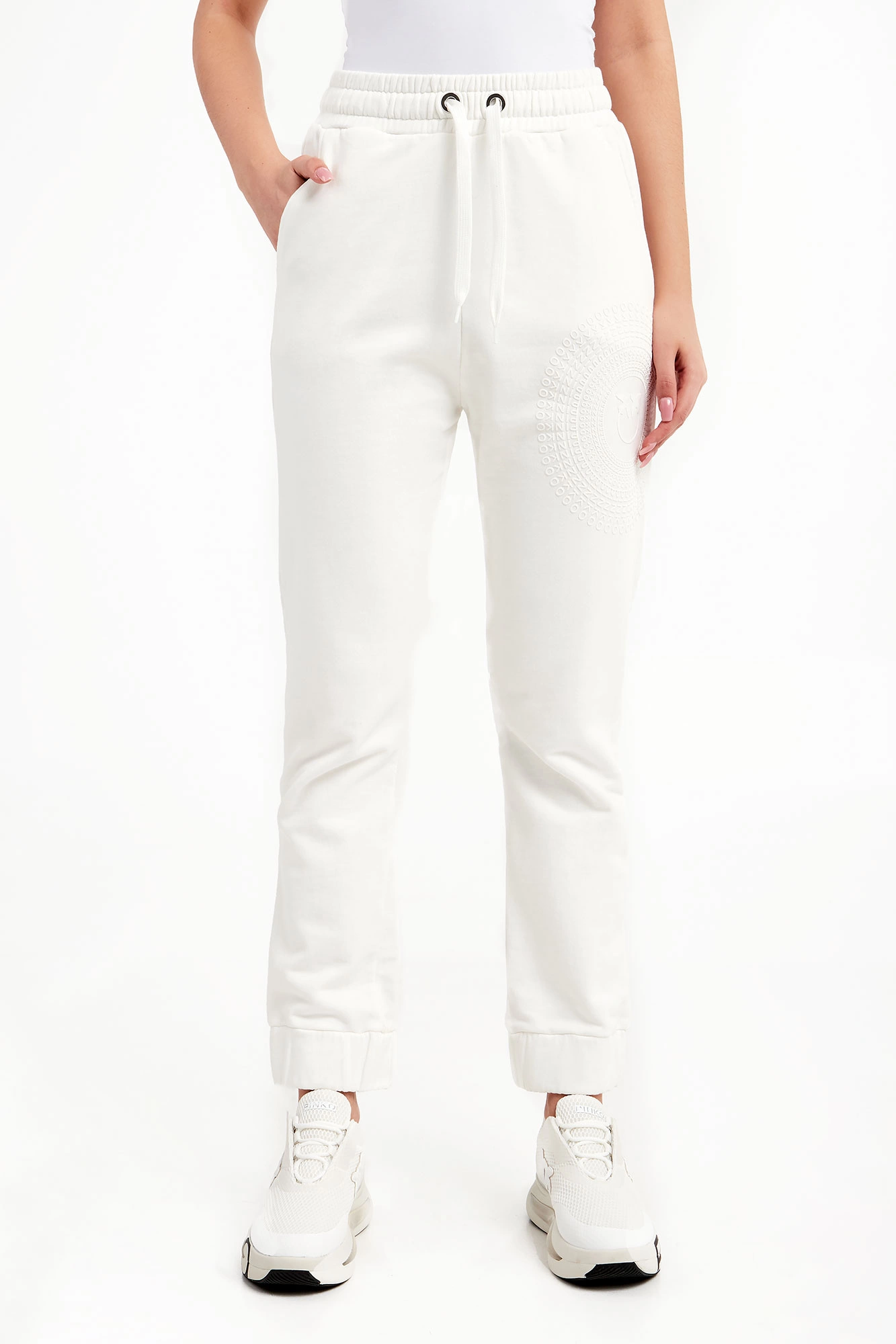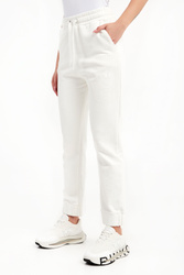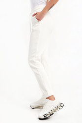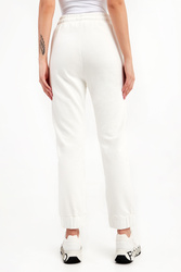 Spodnie dresowe marki Pinko w kolorze złamanej bieli. Fason typu jogger. Na nogawce biały nadruk z logo marki. W pasie ściągacz regulowany za pomocą troczków. Dwie boczne, wpuszczane kieszenie. Nogawki zakończone ściągaczami. Wykonane ze stuprocentowej bawełny.