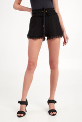 Spodenki marki Pinko w czarnym kolorze. Fason slim fit. Wykonane z ażurowej tkaniny. W pasie i u dołu nogawek koronka z kwiatowym wzorem. Ściągacz regulowany za pomocą troczków ze złotymi, sygnowanymi stoperami. Czarna podszewka.