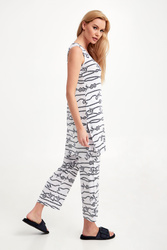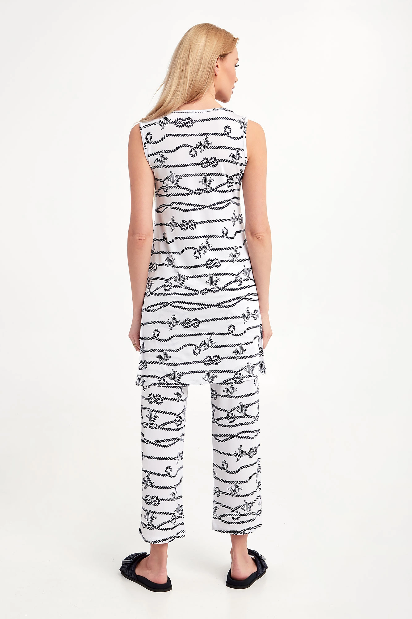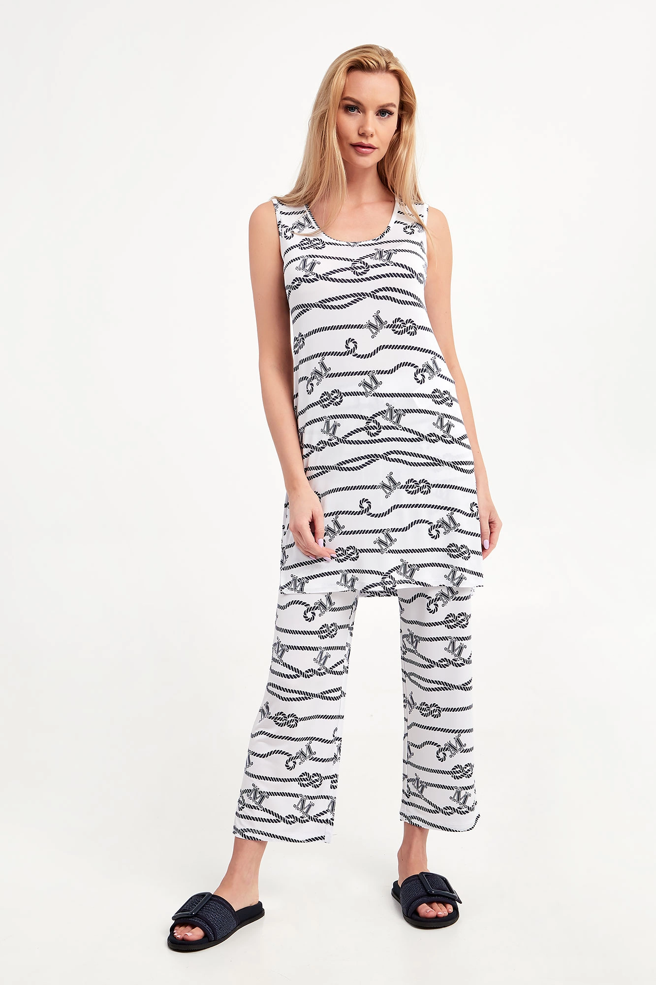 Bluzka marki Weekend Max Mara w białym kolorze. Na całości granatowy wzór z monogramem marki i marynistycznym motywem. Dłuższy fason regular fit. Bez rękawów. Dekolt typu o-neck zakończony niewielkim ściągaczem. Dół wykończony lamówką. Po bokach rozcięcia. Wykonana z elastycznej wiskozy.