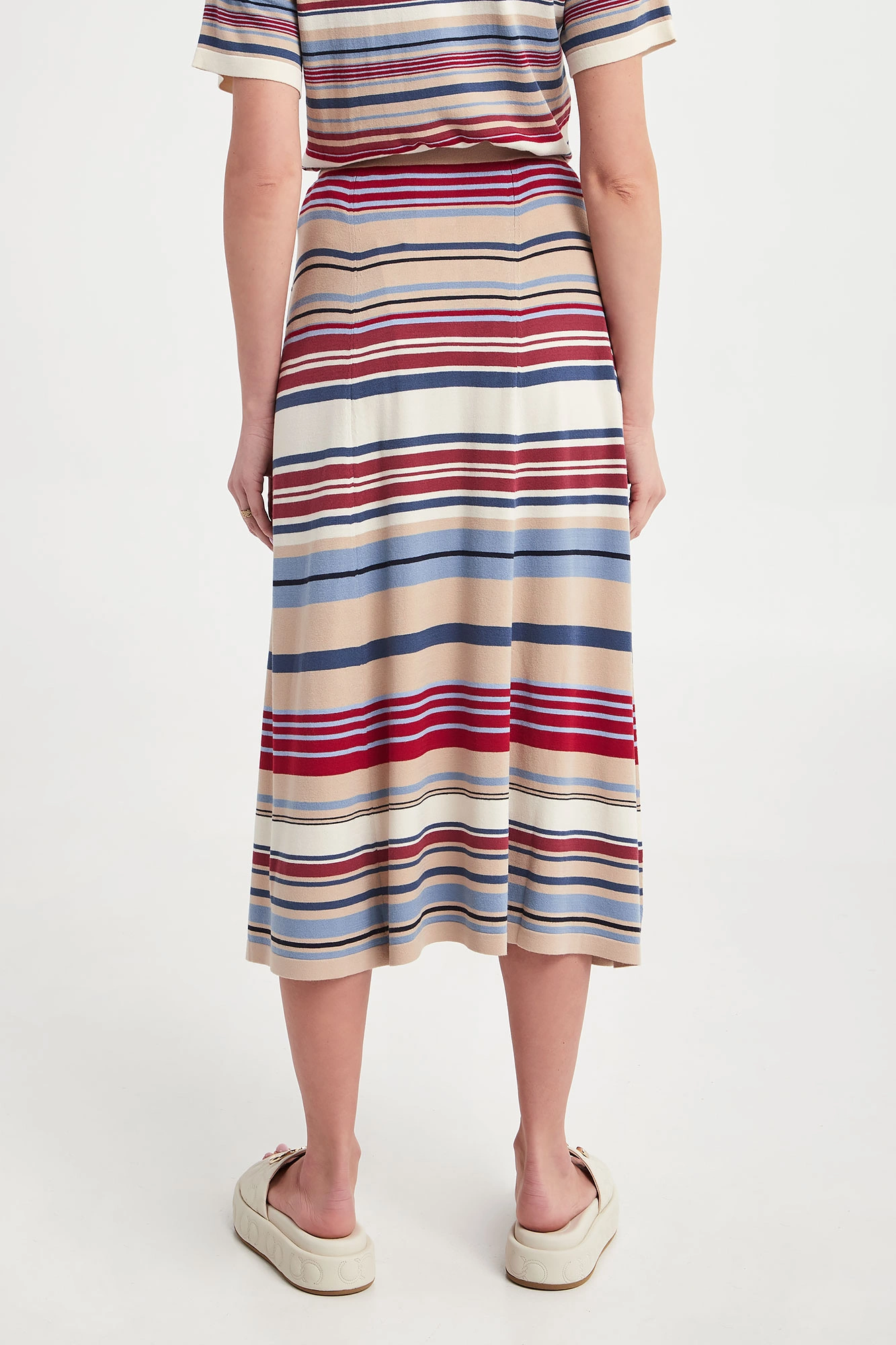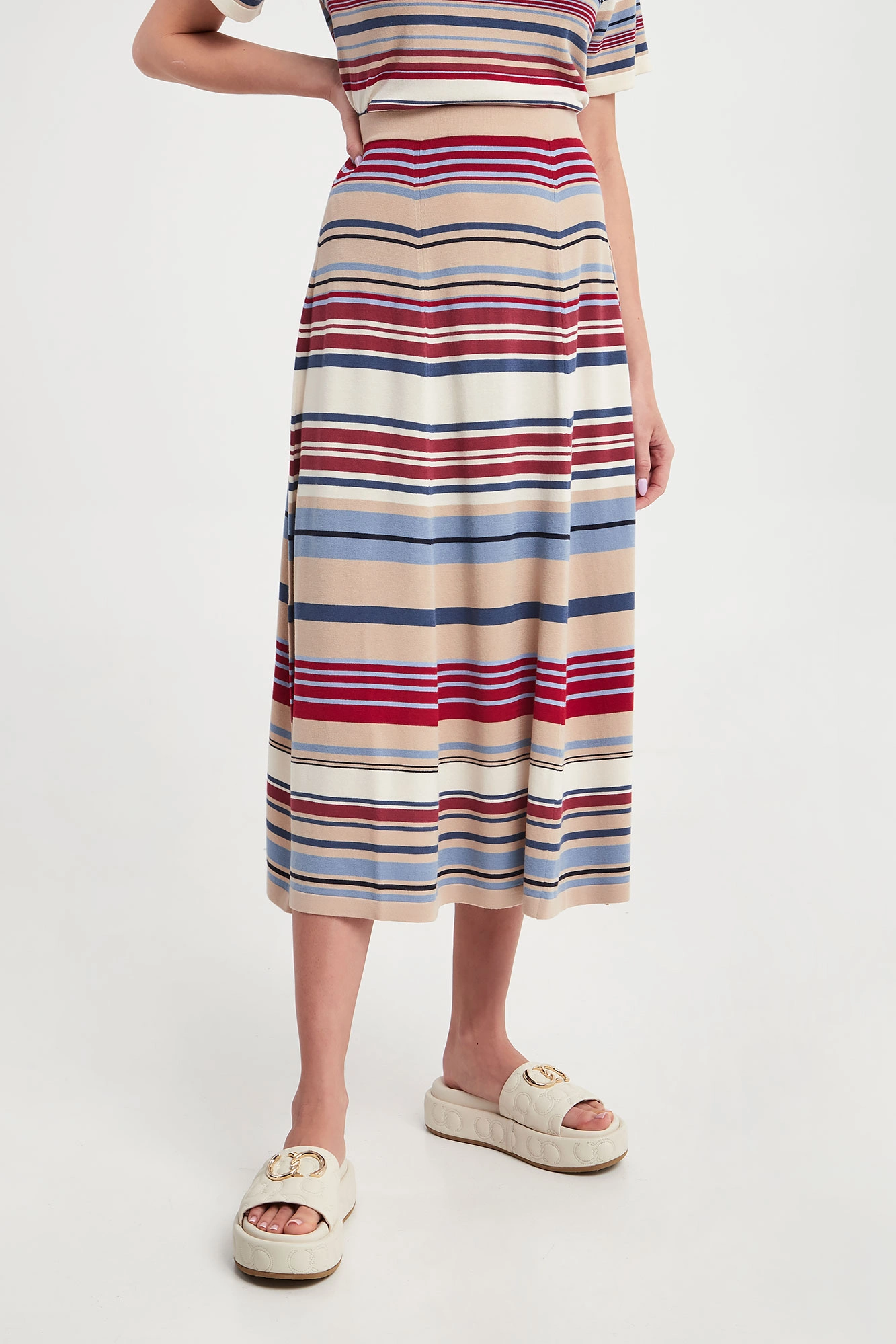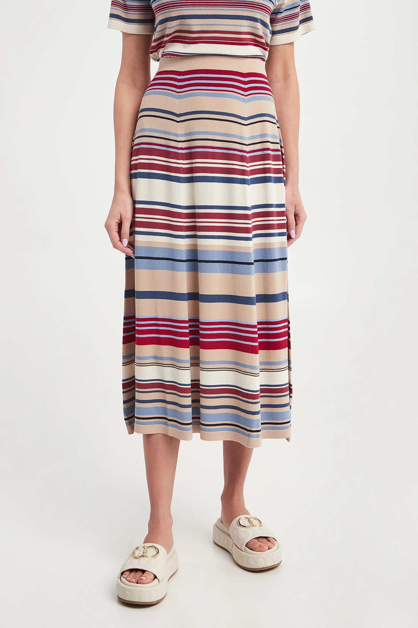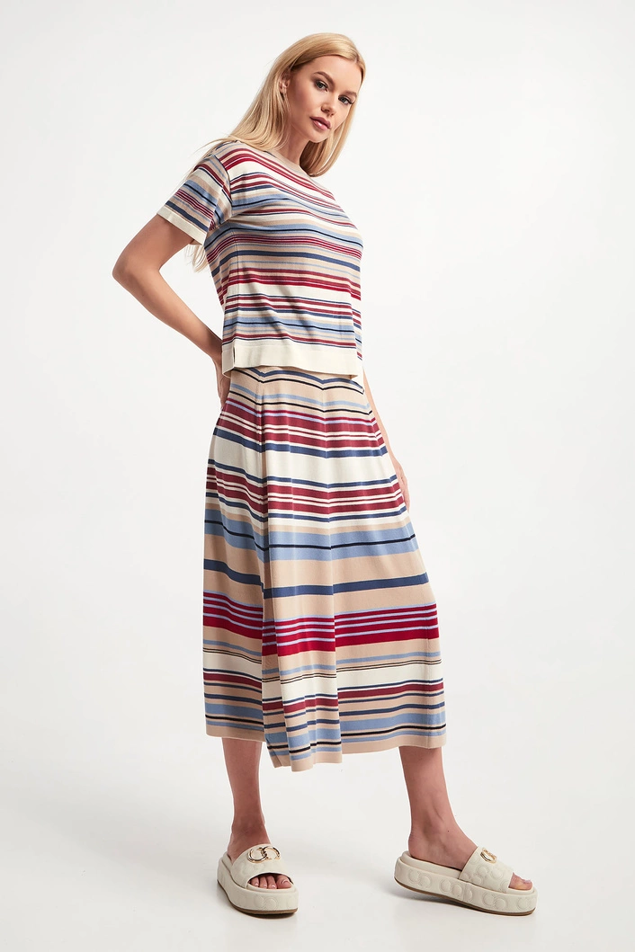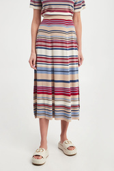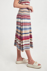 Spódnica marki Weekend Max Mara w kolorowe, poziome paski. Fason reglar fit, długość midi. o kroju litery A. Dół wykończony lamówką. Wykonana z miękkiej, elastycznej, wiskozowej tkaniny. Klasyczne ale nietuzinkowe wykończenie każdej stylizacji.