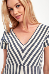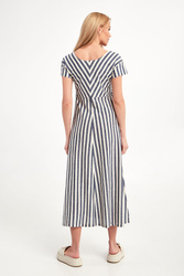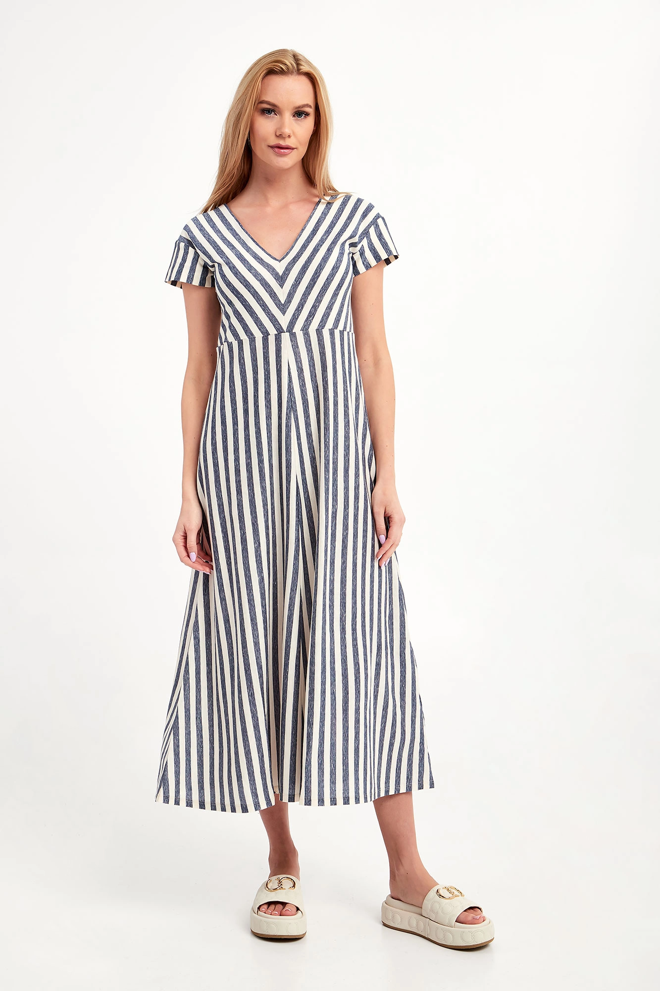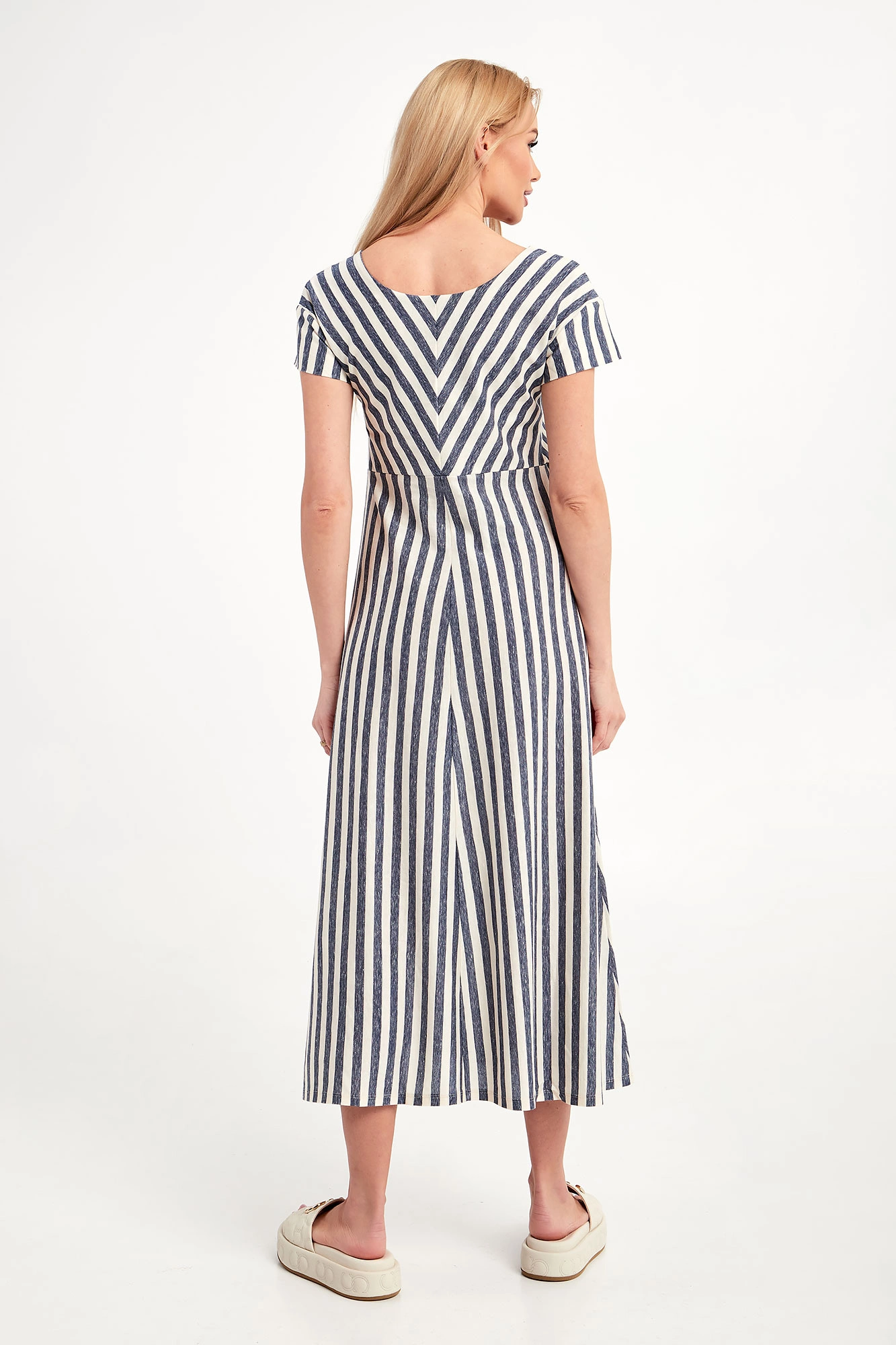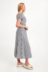 Sukienka marki Weekend Max Mara. Na całości wzór w kremowo-granatowe paski. Fason regular. Dekolt typu v-neck. Krótkie rękawki. Od talii lekko rozszerzający się dół. Wykonana z mieszanki bawełny z lnem. Lekka i zwiewna propozycja na idealny weekend za miastem.