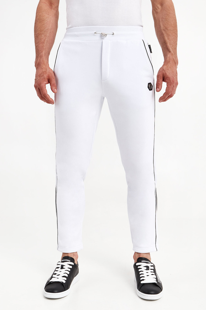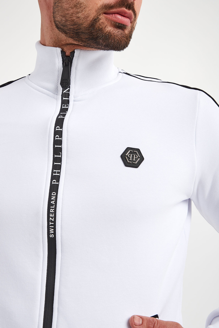 Dres marki Philipp Plein w białym kolorze. Fason regular fit. Bluza zapinana za pomocą zamka z sygnowaną zawieszką. Z boku skórzana naszywka ze srebrnym logo. Dekolt ze stójką, długie rękawy i dół zakończone elastycznymi ściągaczami. Na rękawach czarne lampasy. Na plecach czarne, kontrastujące, haftowane logo. Dwie boczne, wpuszczane kieszenie. Spodnie z regulowanym ściągaczem w pasie. Z boku sygnowana aplikacja. Model z trzema kieszeniami. Po bokach czarne lampasy. Dres wykonany z miękkiej, bawełnianej tkaniny.