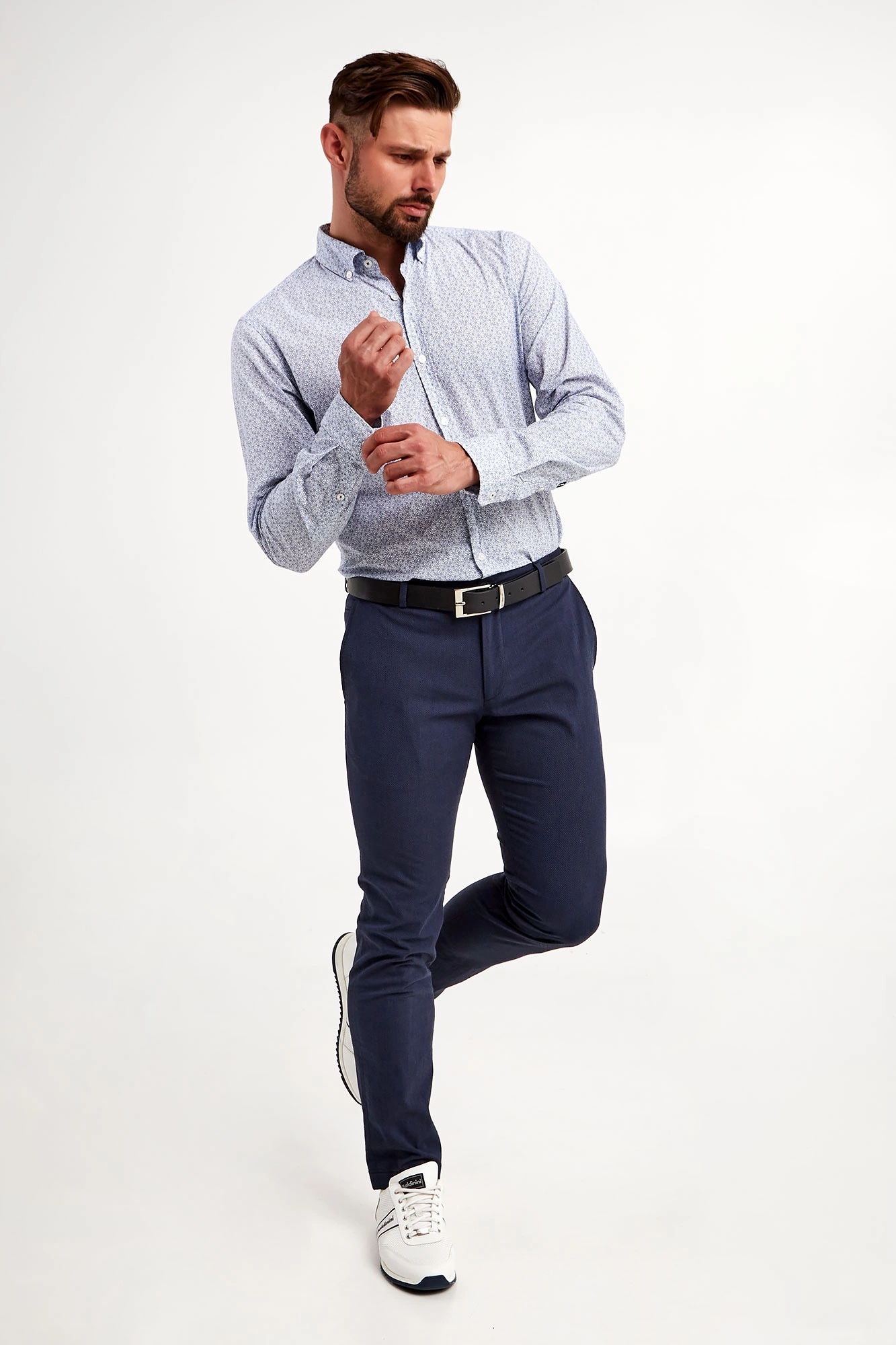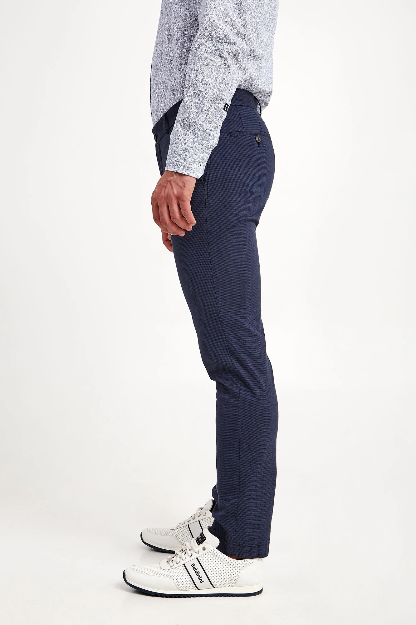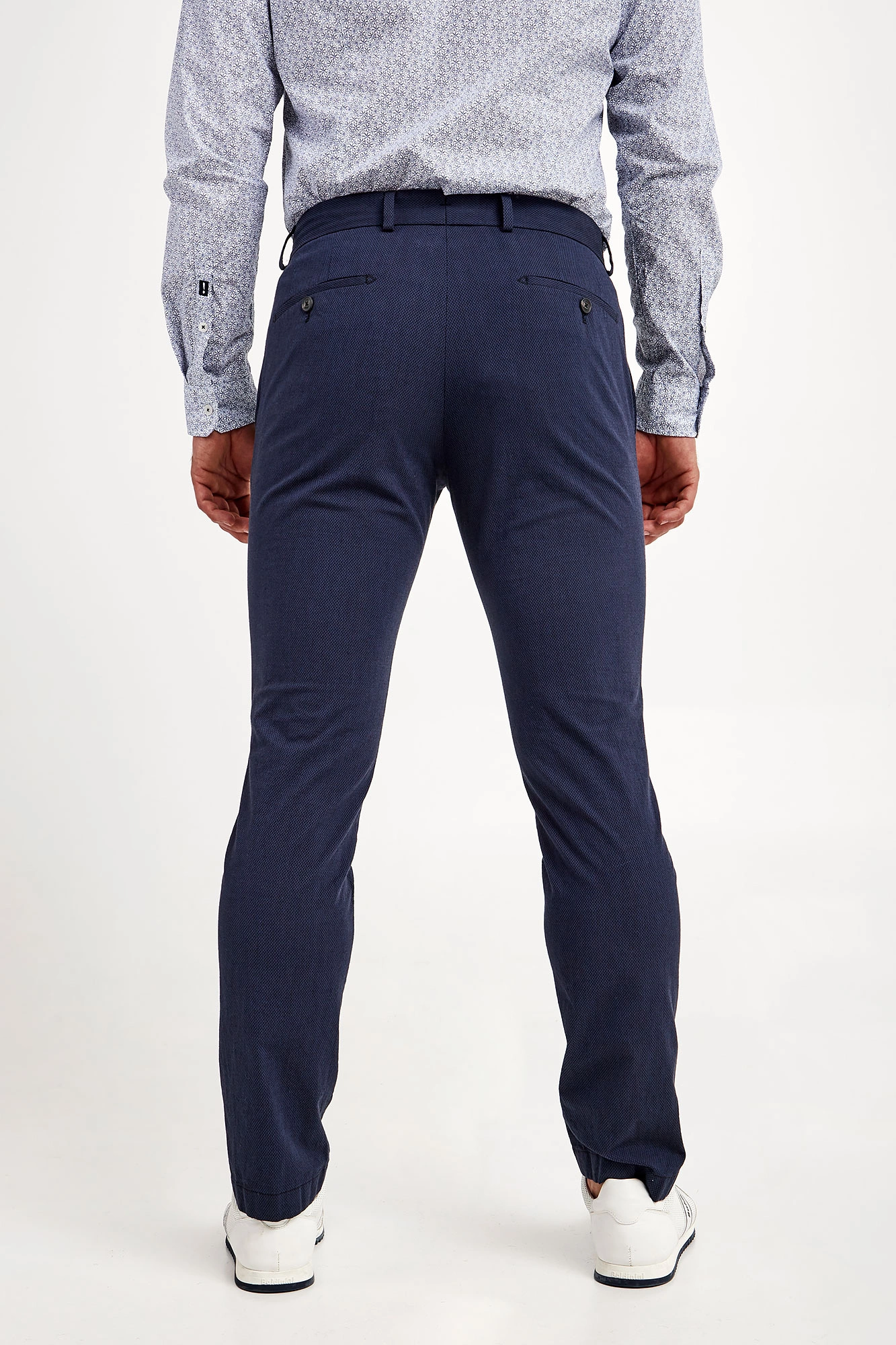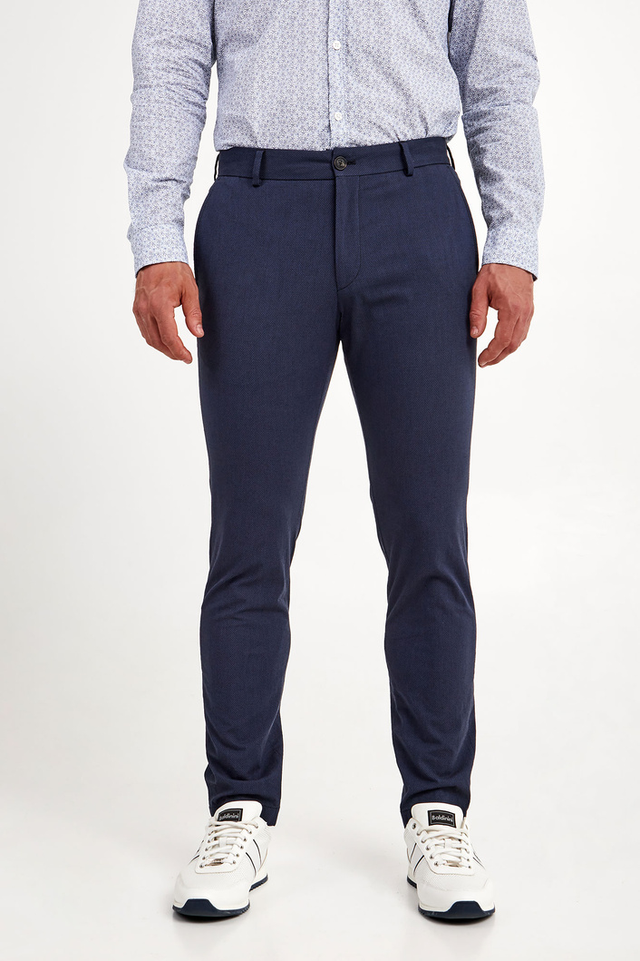 Spodnie marki Joop! w granatowym kolorze. Całość w jodełkę. Fason typu slim fit. Model z pięcioma kieszeniami. Zapinane na zamek błyskawiczny i guzik. W talii szlufki. Wykonane z miękkiej, elastycznej bawełny.