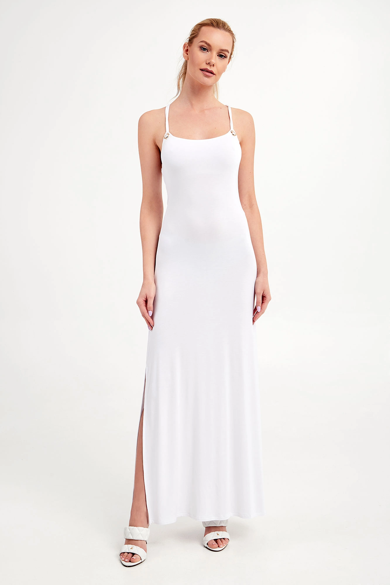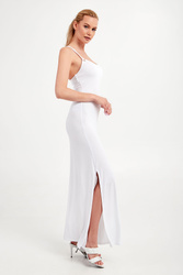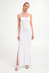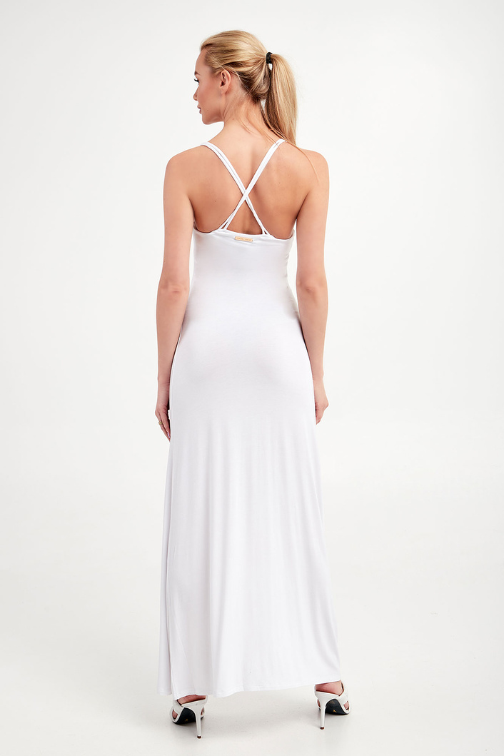 Sukienka marki Emporio Armani Swimwear w białym kolorze. Fason typu slim fit. Na cienkich krzyżujących się ramiączkach. Po prawej stronie rozcięcie. Z tyłu aplikacja w postaci nazwy marki w złotym kolorze. Miła w dotyku i opływająca sylwetkę propozycja na wiosnę to strzał w dziesiątkę.