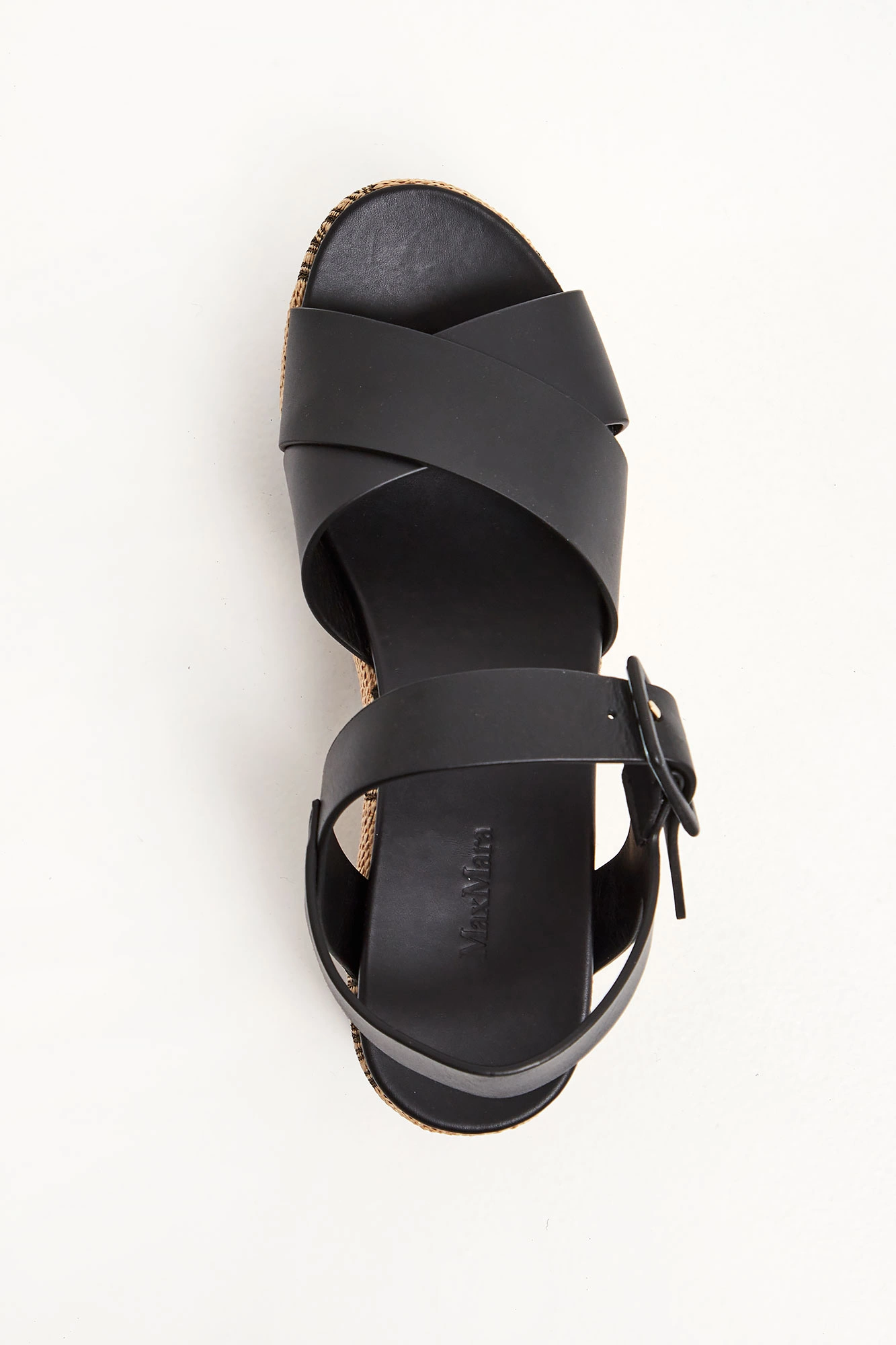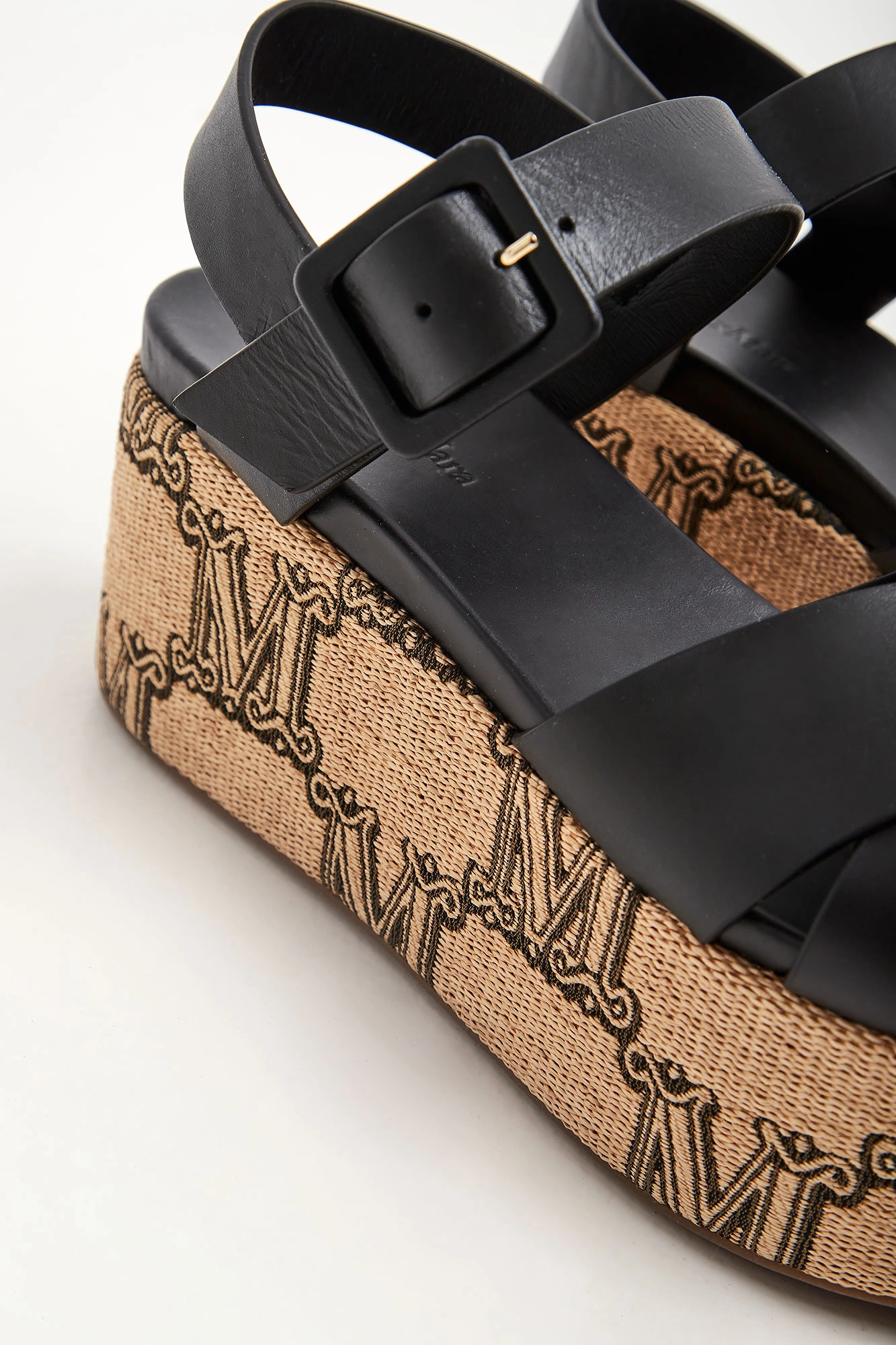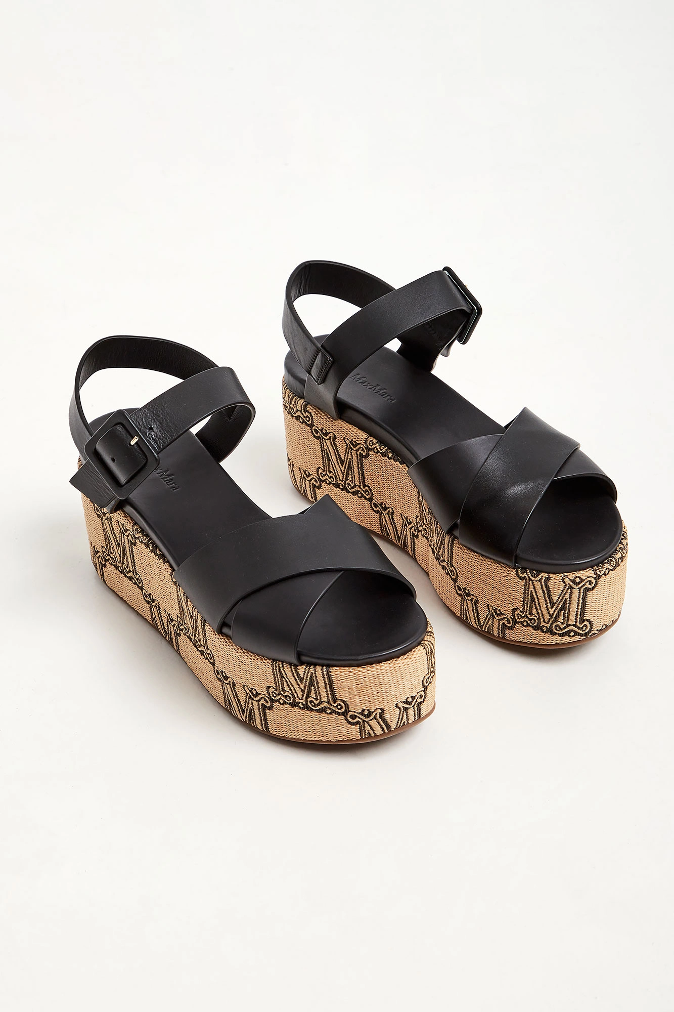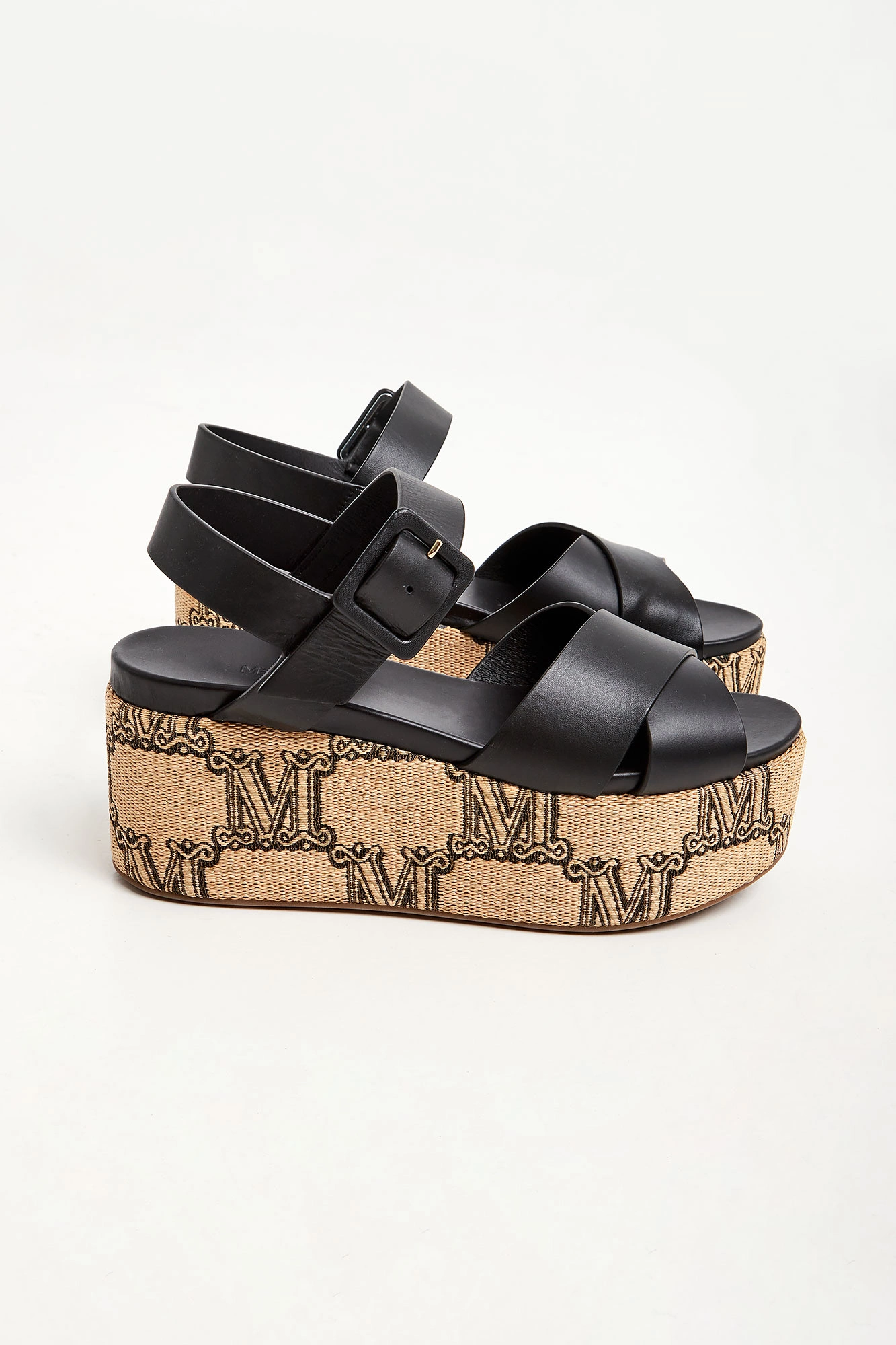 Sandały na koturnie marki Max Mara Accessori w beżowo-czarnym kolorze. Z przodu dwa, krzyżujące się paski. Zapinane na kostce za pomocą regulowanego paska i klamry. Wyściółka sygnowana. Na koturnie tłoczony monogram marki.