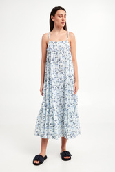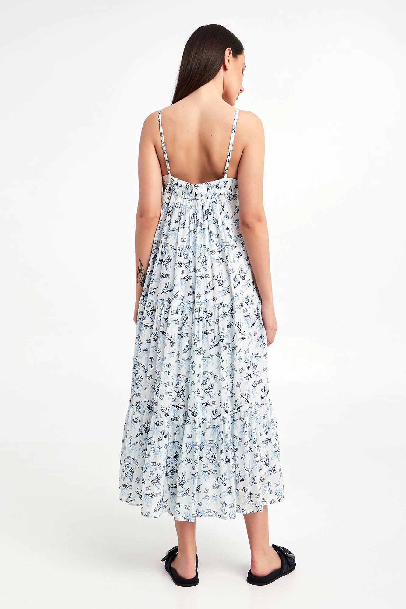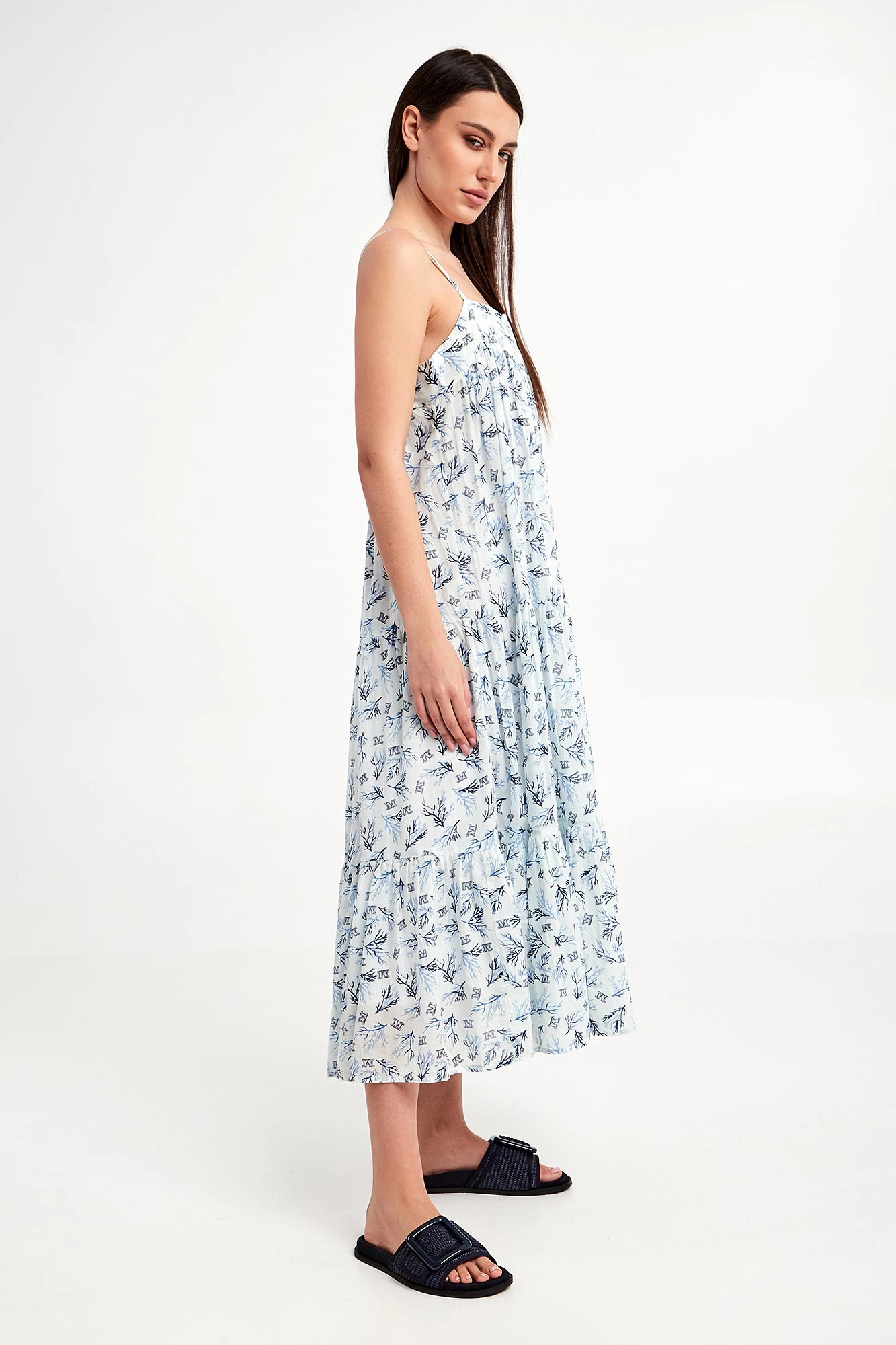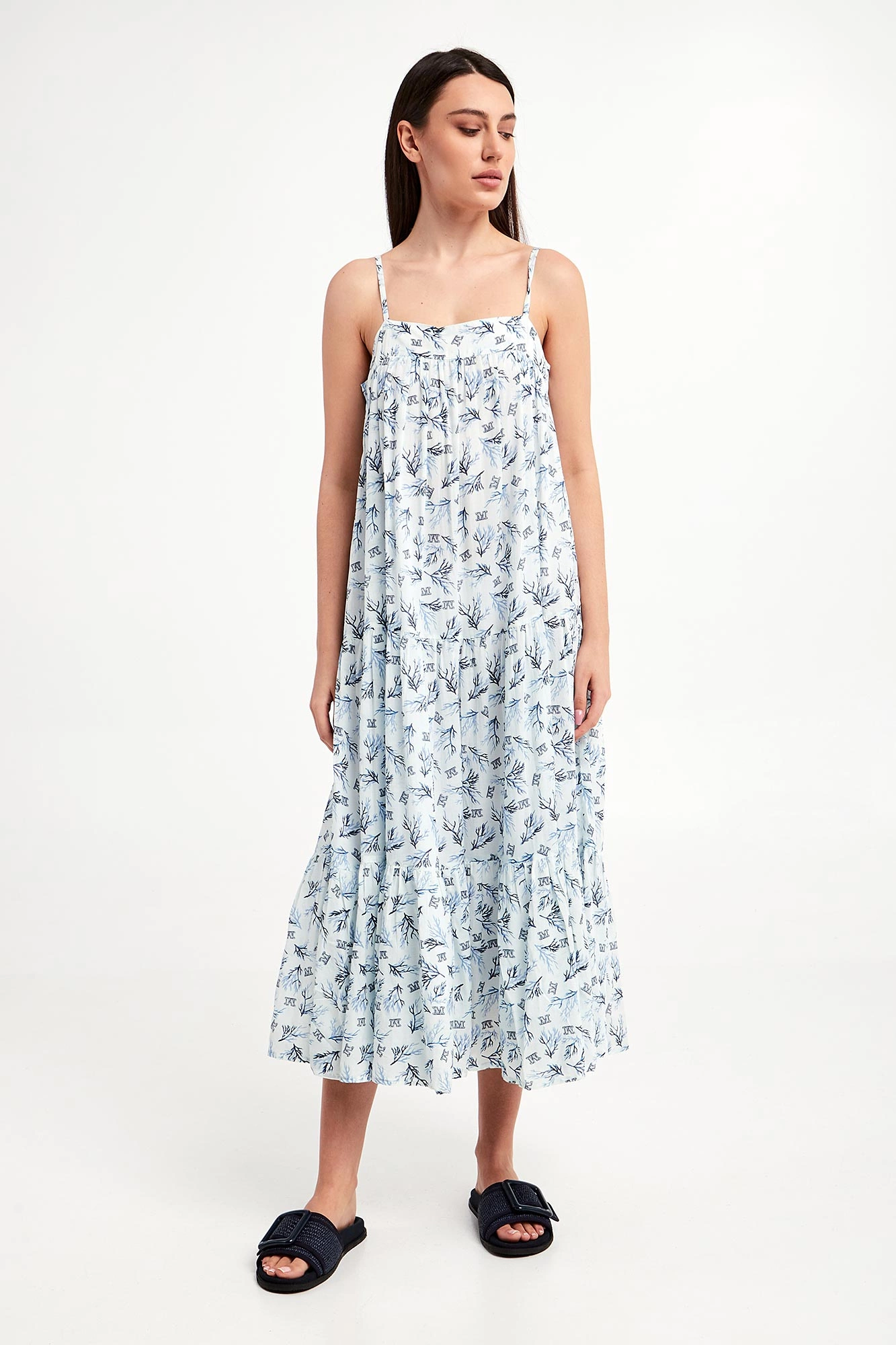 Sukienka marki Max Mara Beachwear w białym kolorze. Na całości wzór z monogramem marki i z motywem marynistycznym w granatowym kolorze. Fason regular. Marszczenia w talii i na dole. Model na delikatnych, regulowanych ramiączkach. Z tyłu, na plecach ściągacz oraz marszczenia.